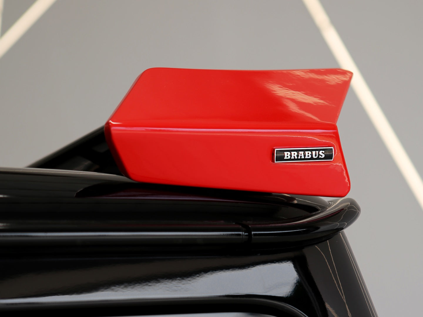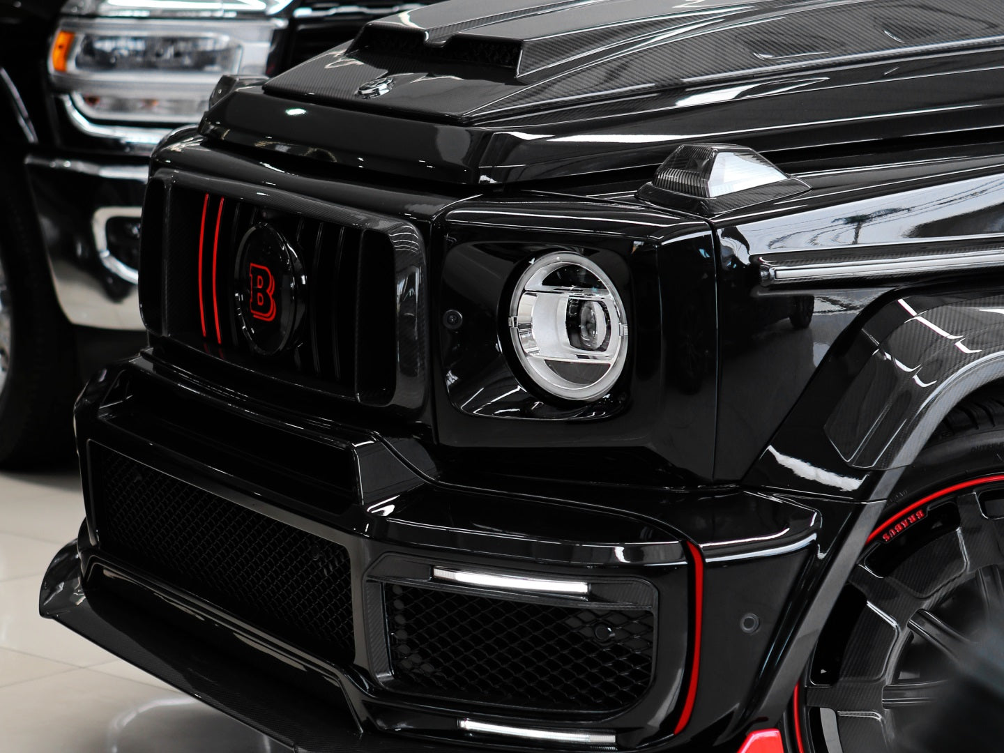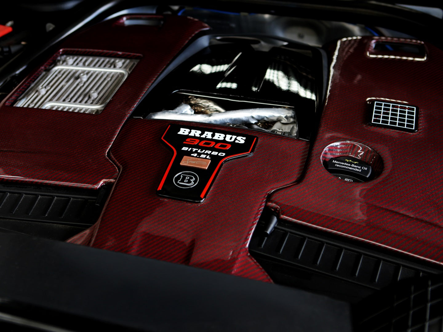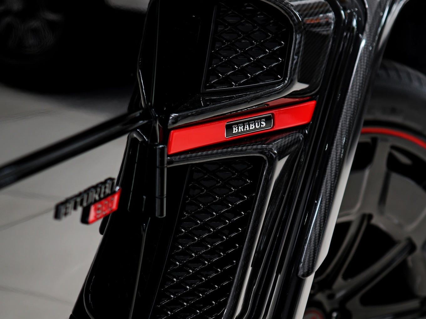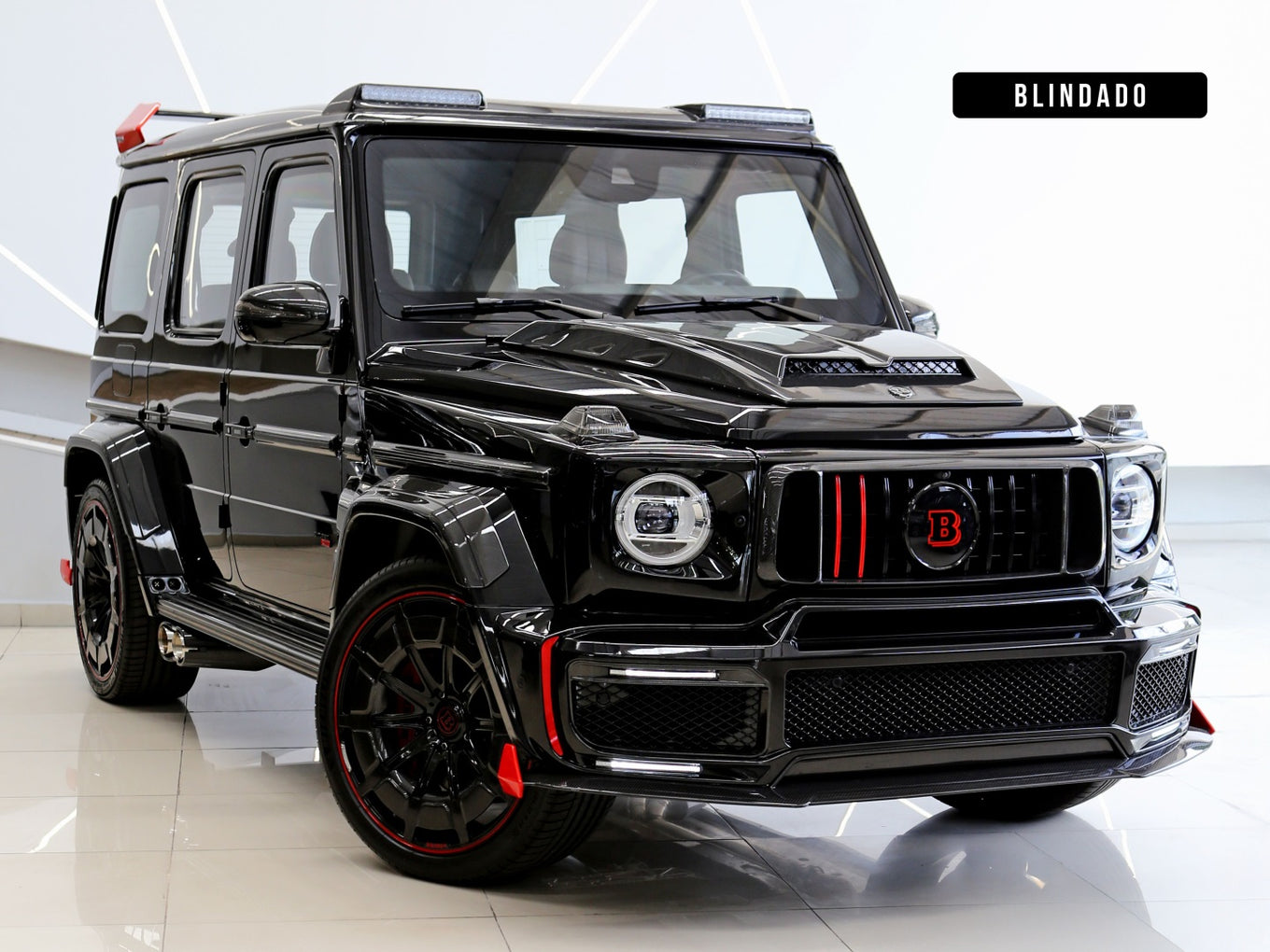 Veículo blindado Carbon, vidros AGP com Kit Brabus Rocket Edition 900, rodas exclusivas, acabamentos em fibra de carbono, teto solar, bancos em couro bicolor Mocha e preto, painel TFT e sistema de som Burmester.