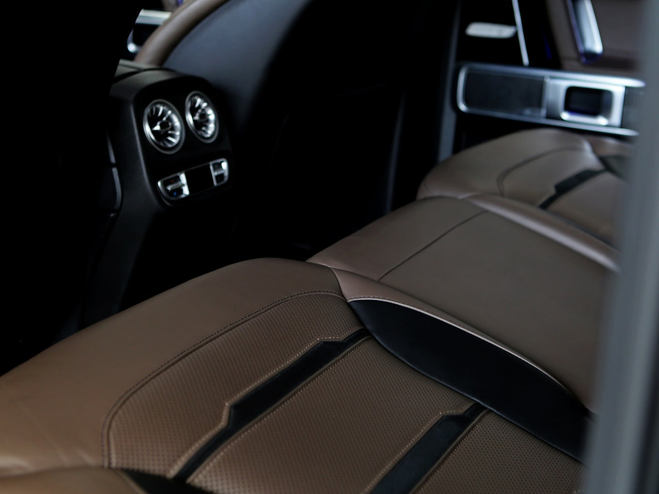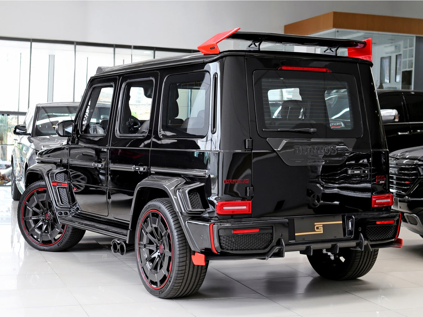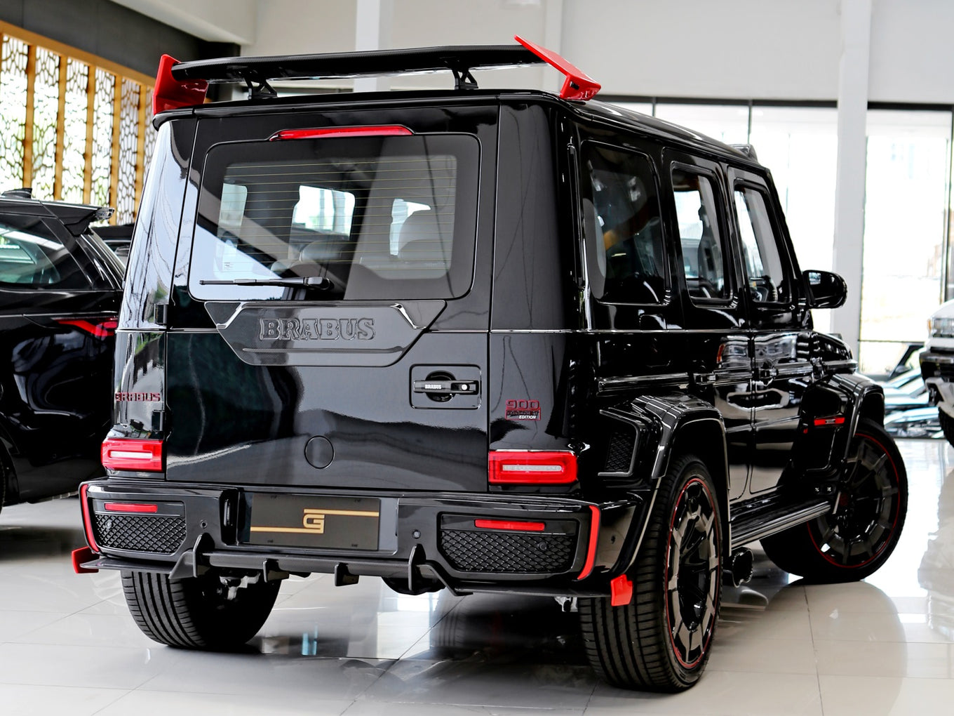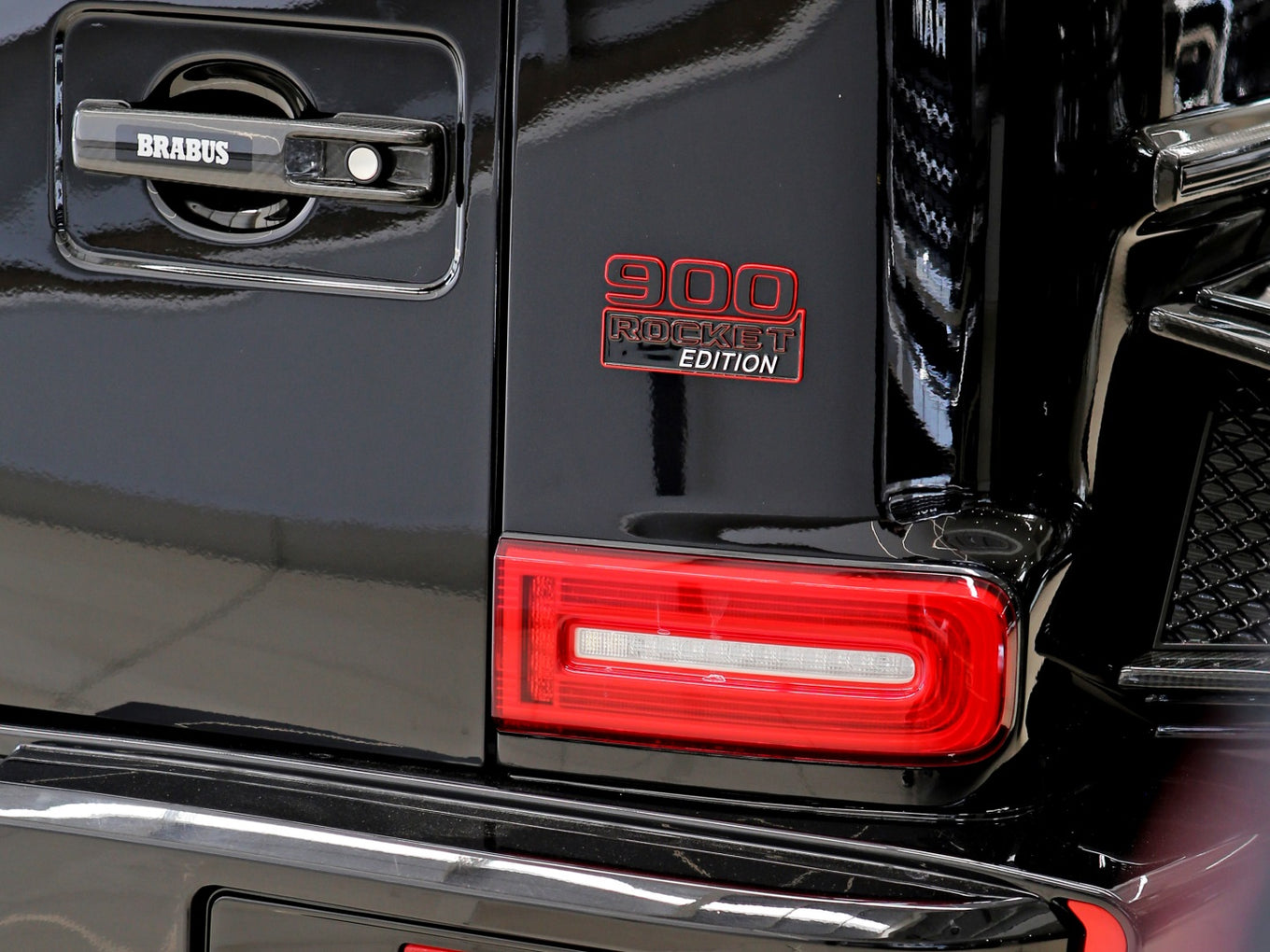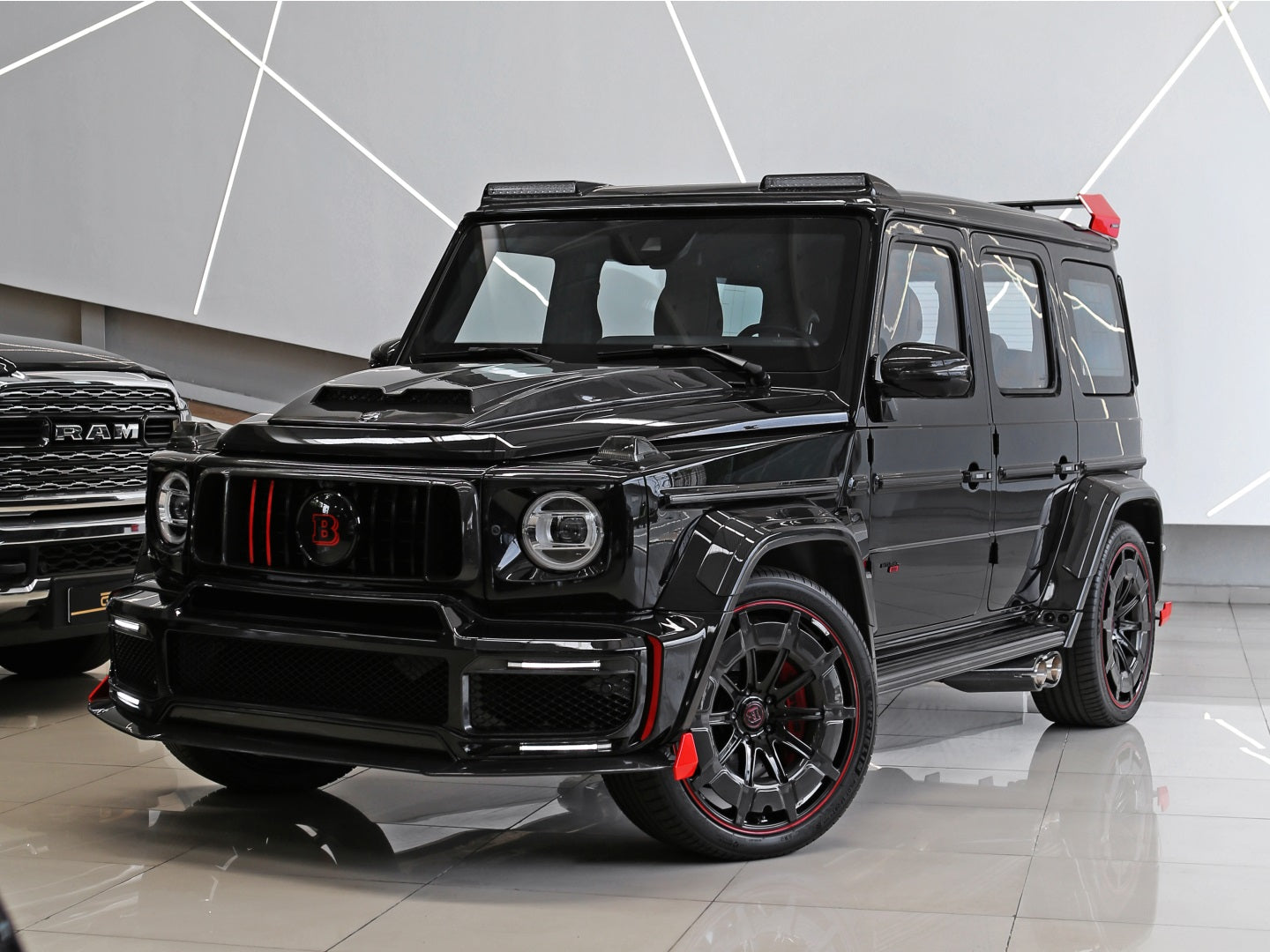 Veículo blindado Carbon, vidros AGP com Kit Brabus Rocket Edition 900, rodas exclusivas, acabamentos em fibra de carbono, teto solar, bancos em couro bicolor Mocha e preto, painel TFT e sistema de som Burmester.
