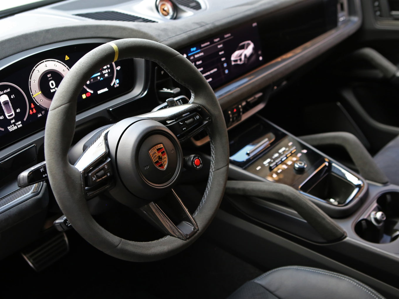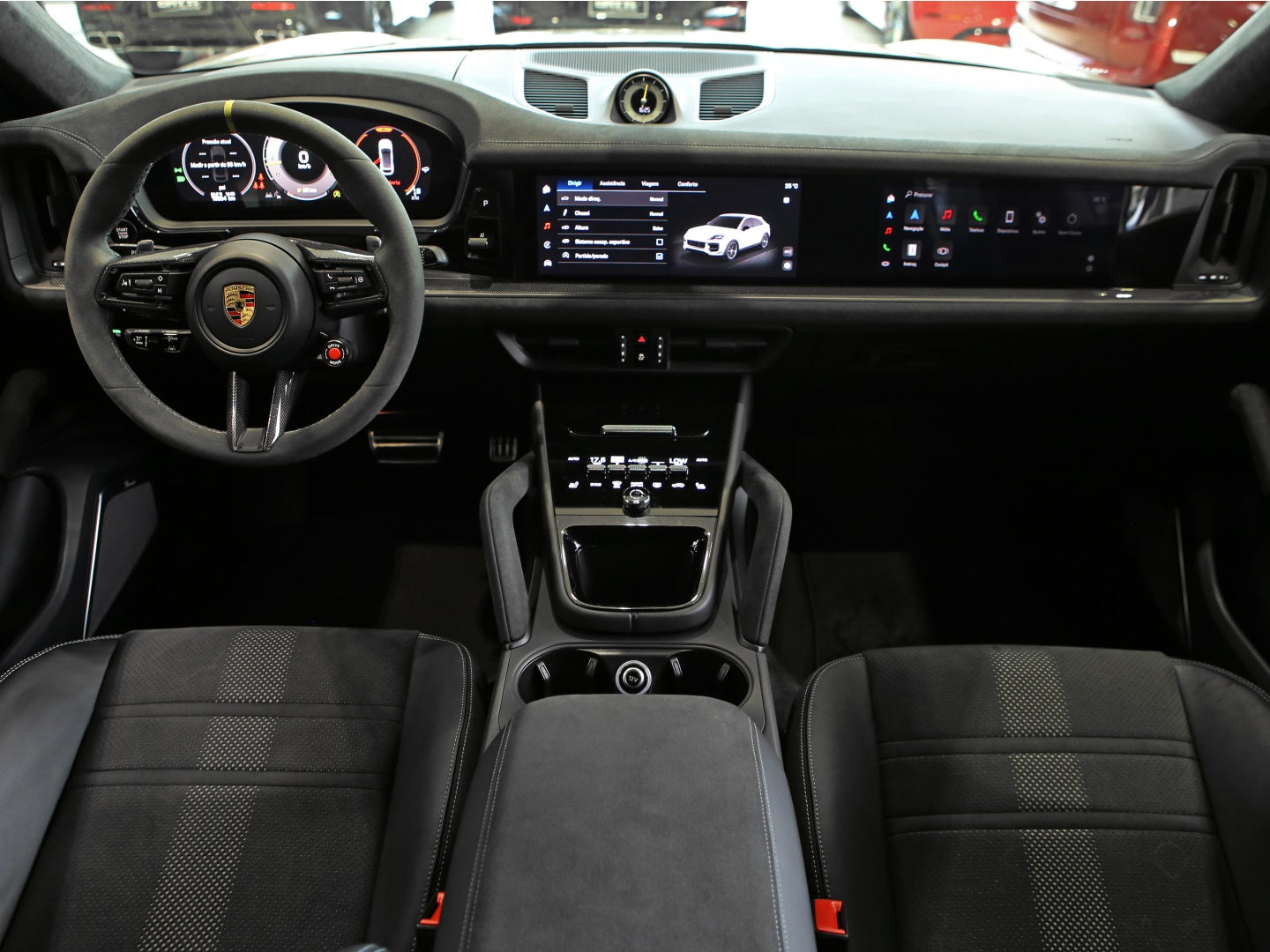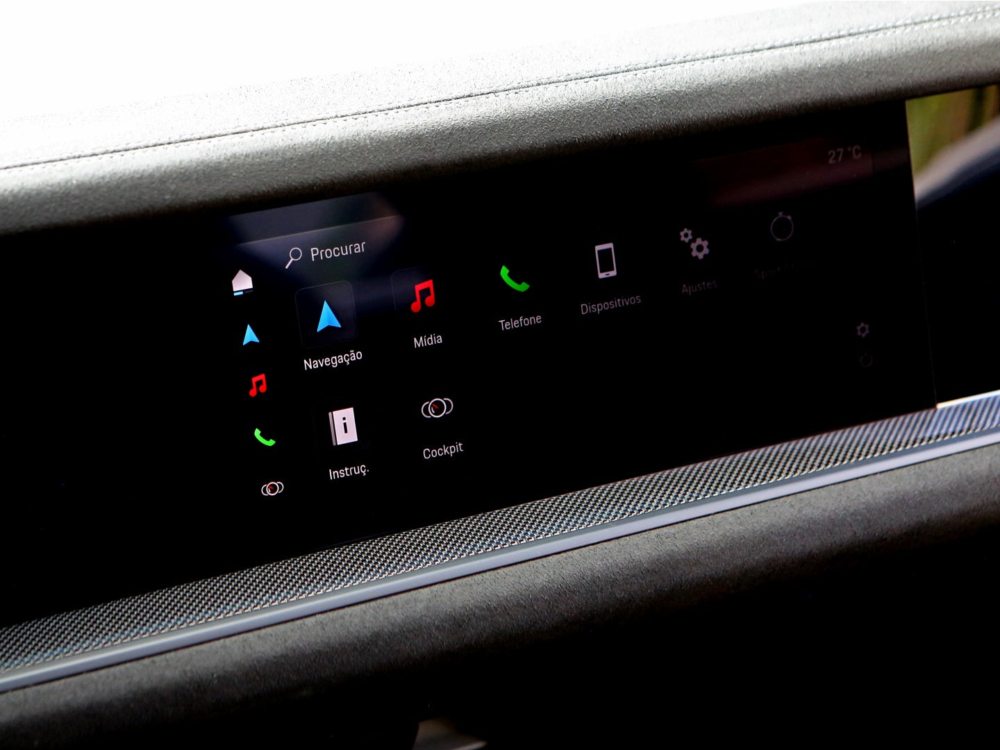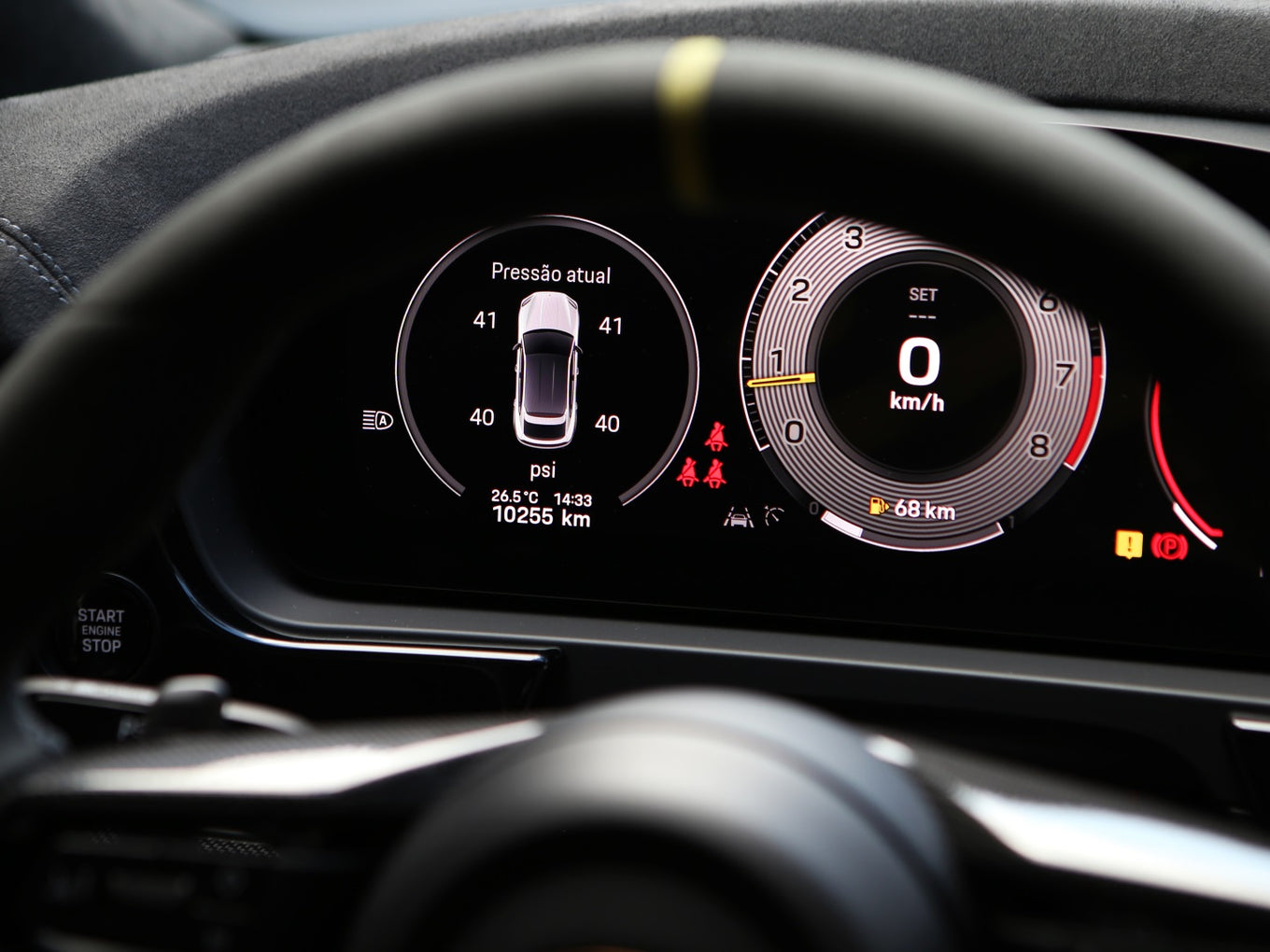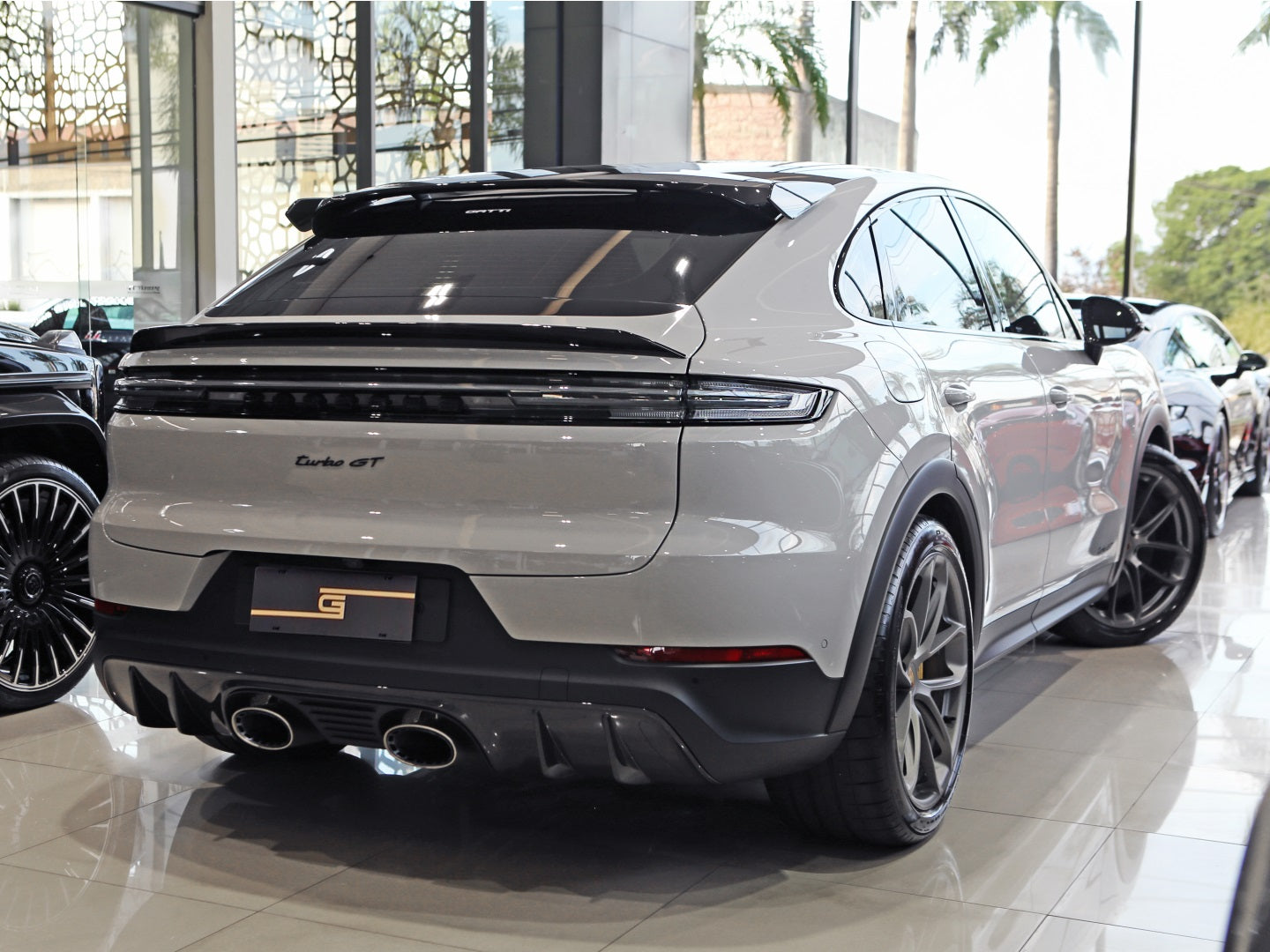 Veículo na cor cinza Crayon, rodas modelo Design GT, aerofólio exclusivo, escapamento esportivo com saídas centrais, interior em couro e Race Tex com costuras contrastantes, pacote Sport Chrono com botão Sport Response em vermelho, display do passageiro e sistema de som Burmester.
