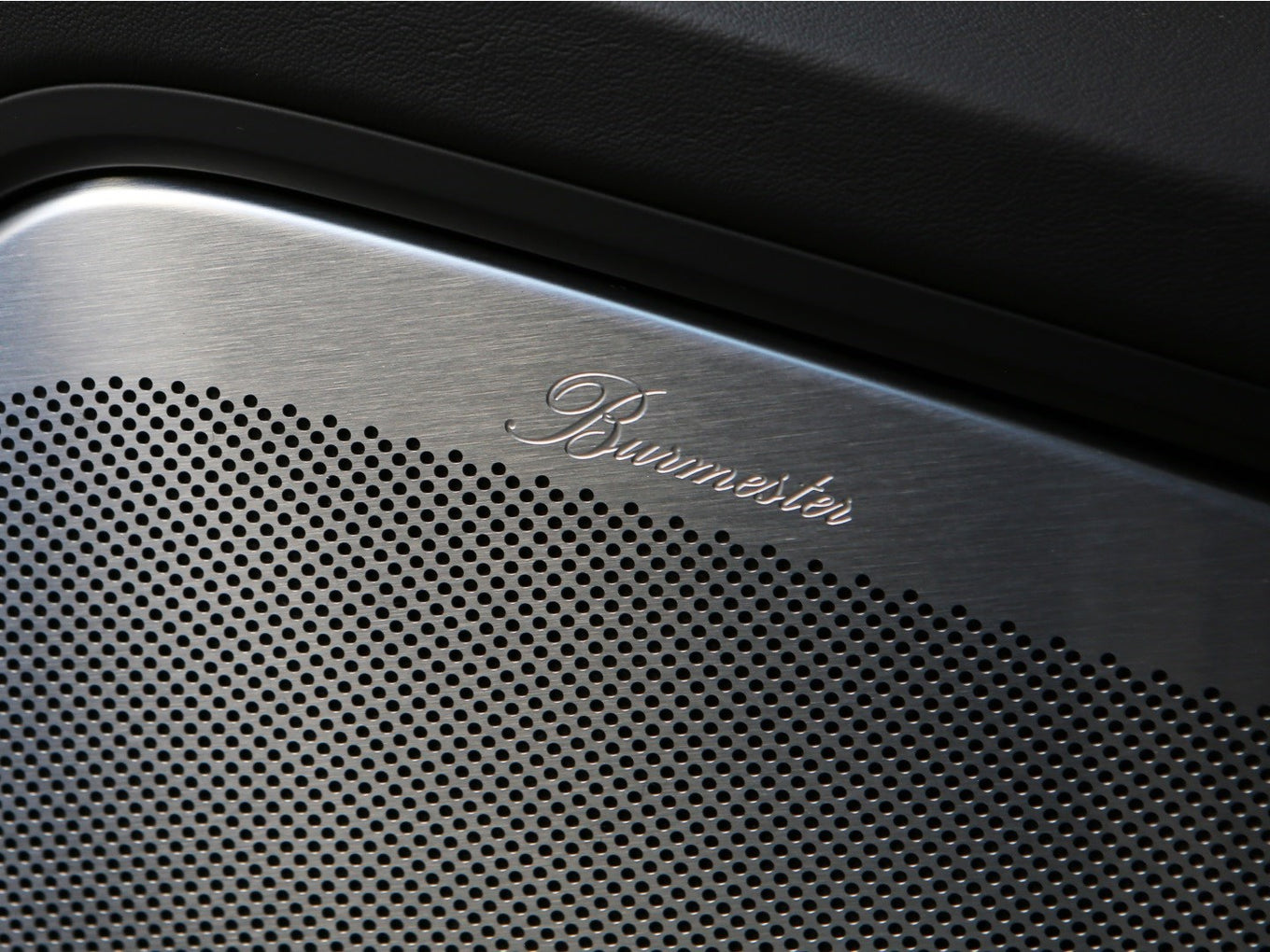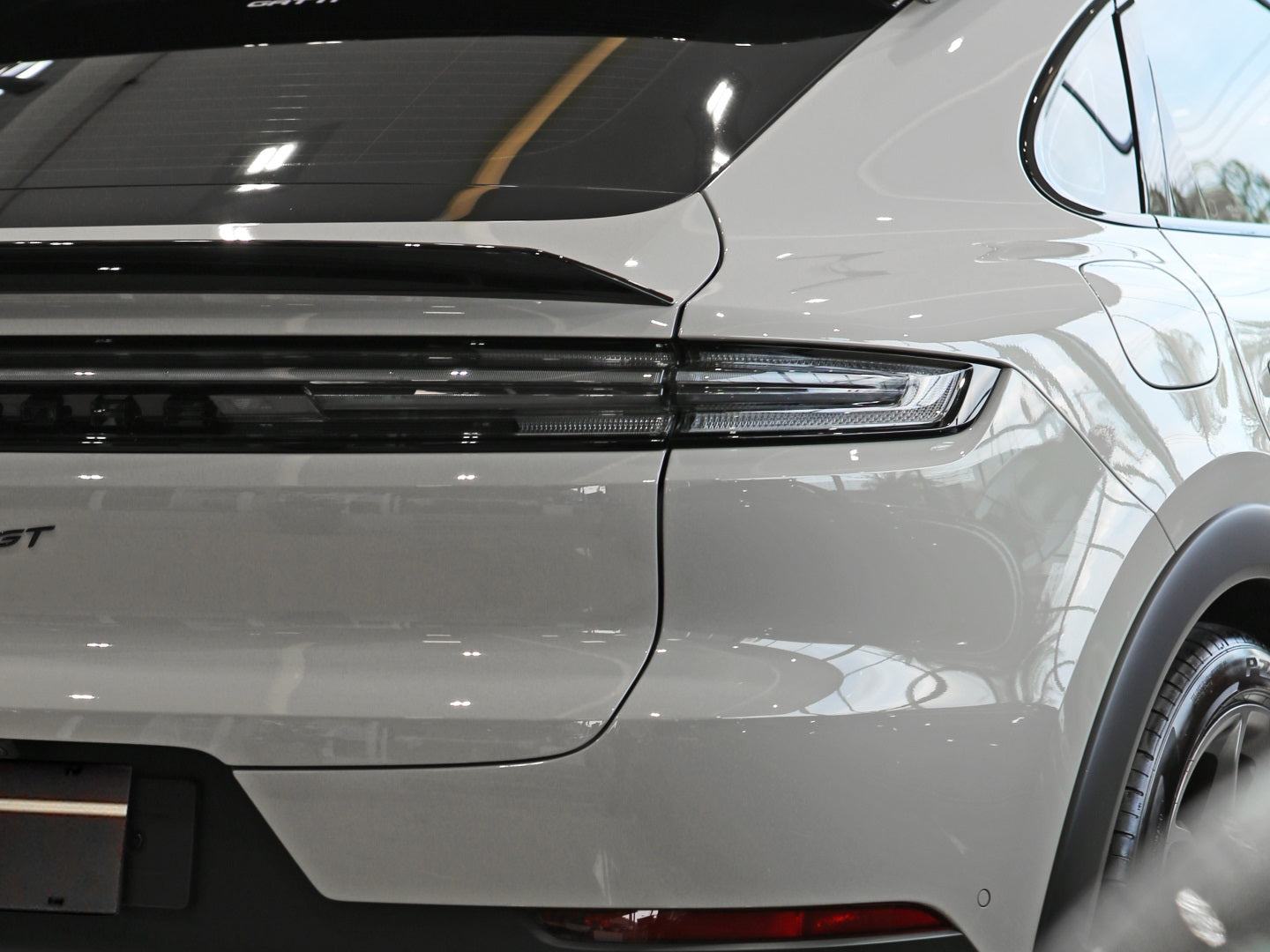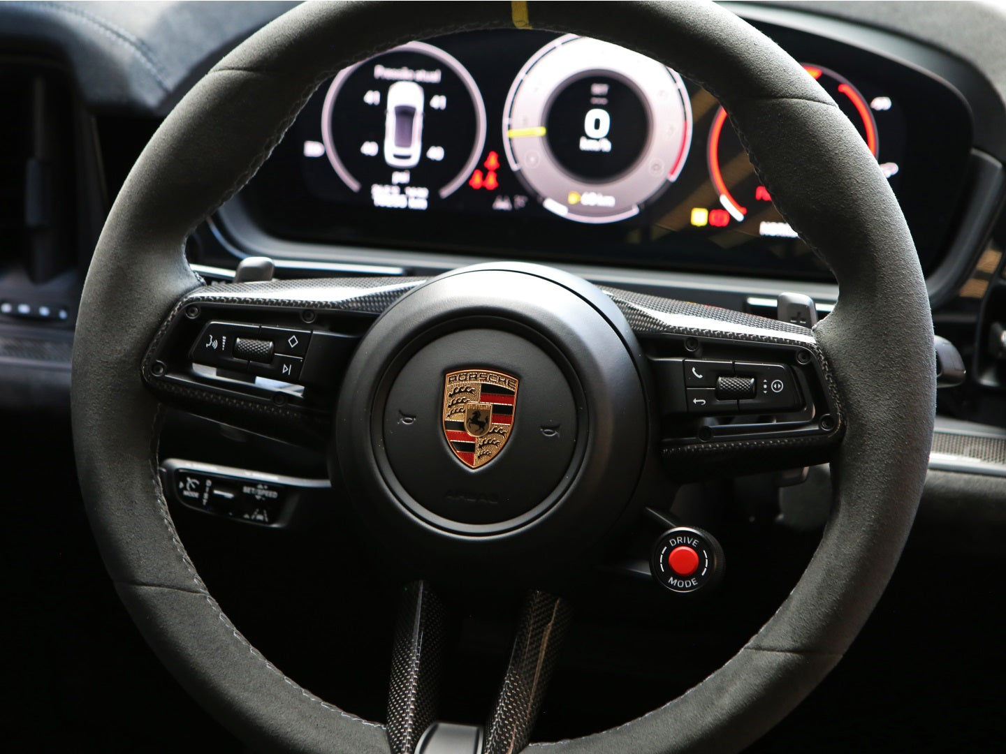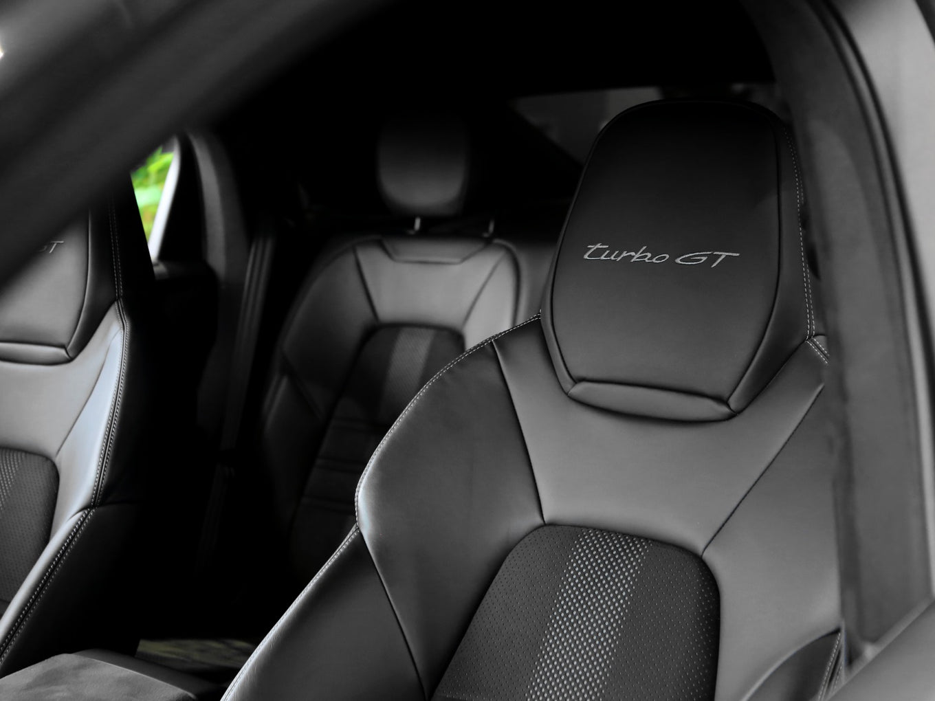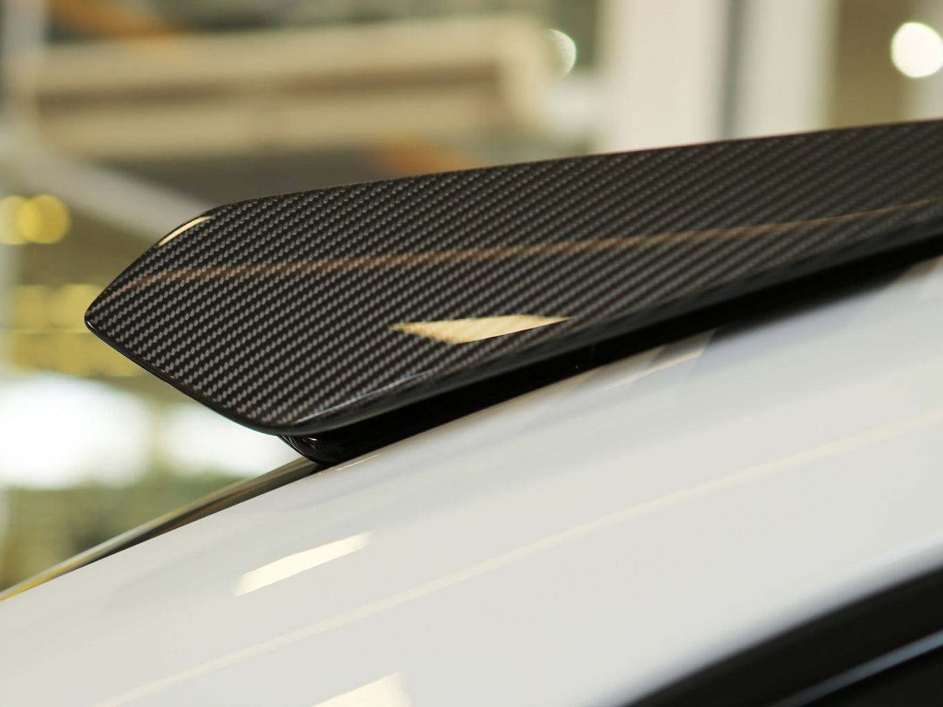 Veículo na cor cinza Crayon, rodas modelo Design GT, aerofólio exclusivo, escapamento esportivo com saídas centrais, interior em couro e Race Tex com costuras contrastantes, pacote Sport Chrono com botão Sport Response em vermelho, display do passageiro e sistema de som Burmester.