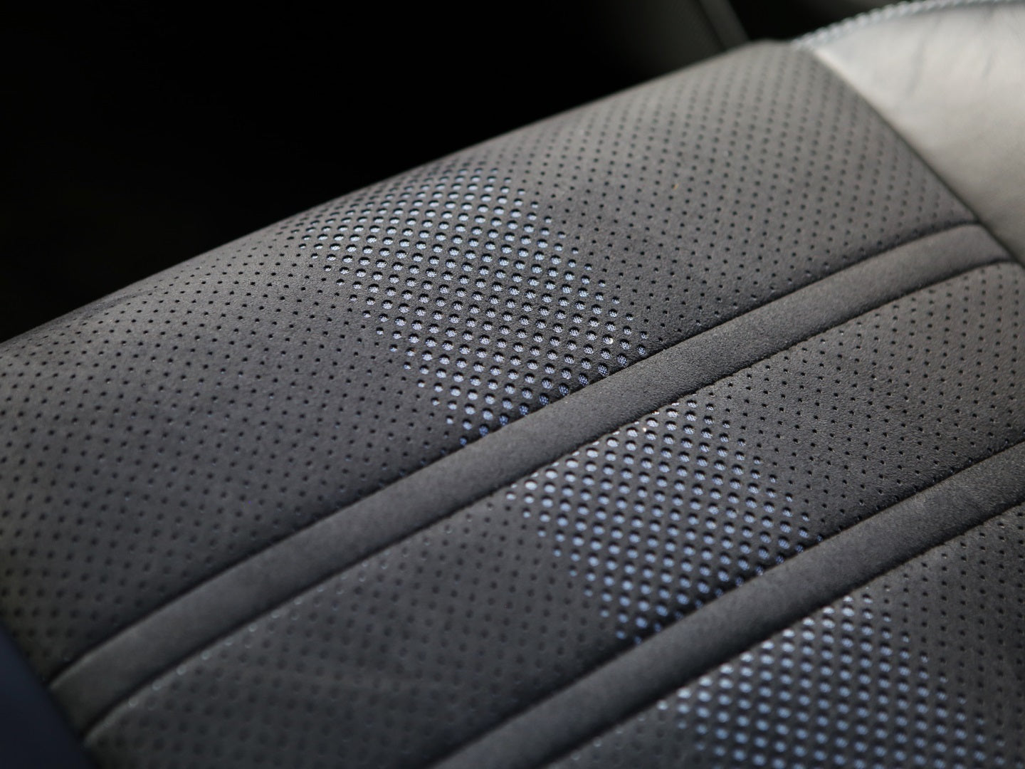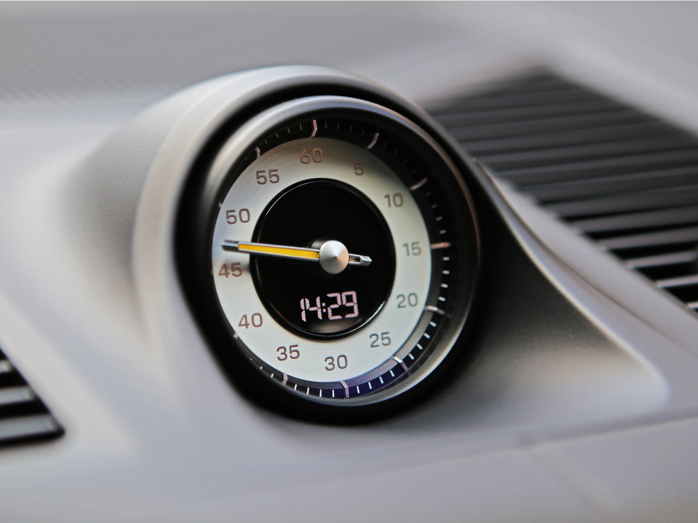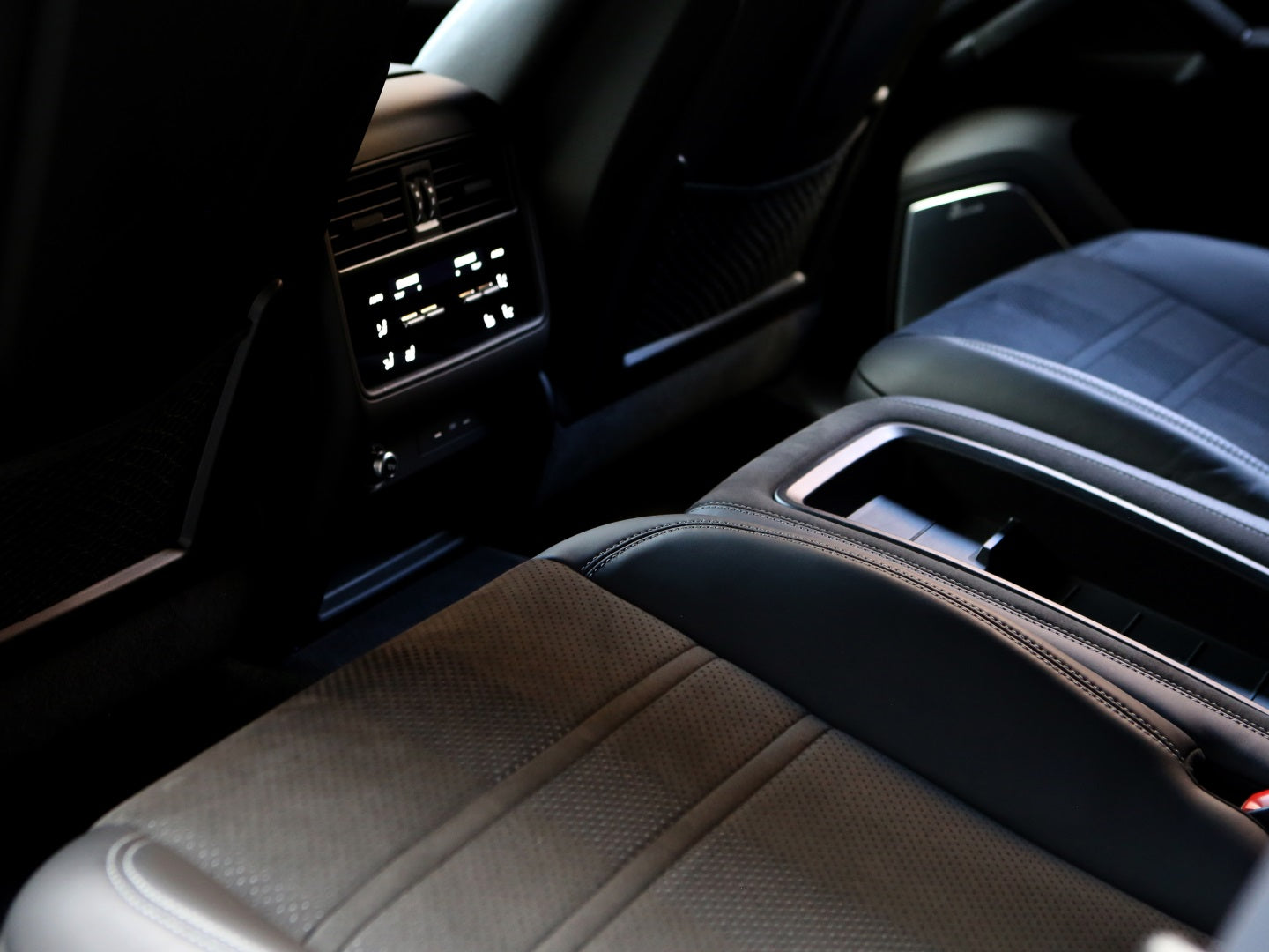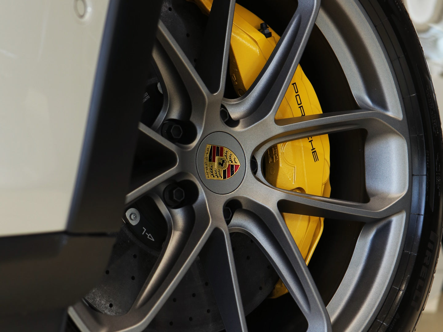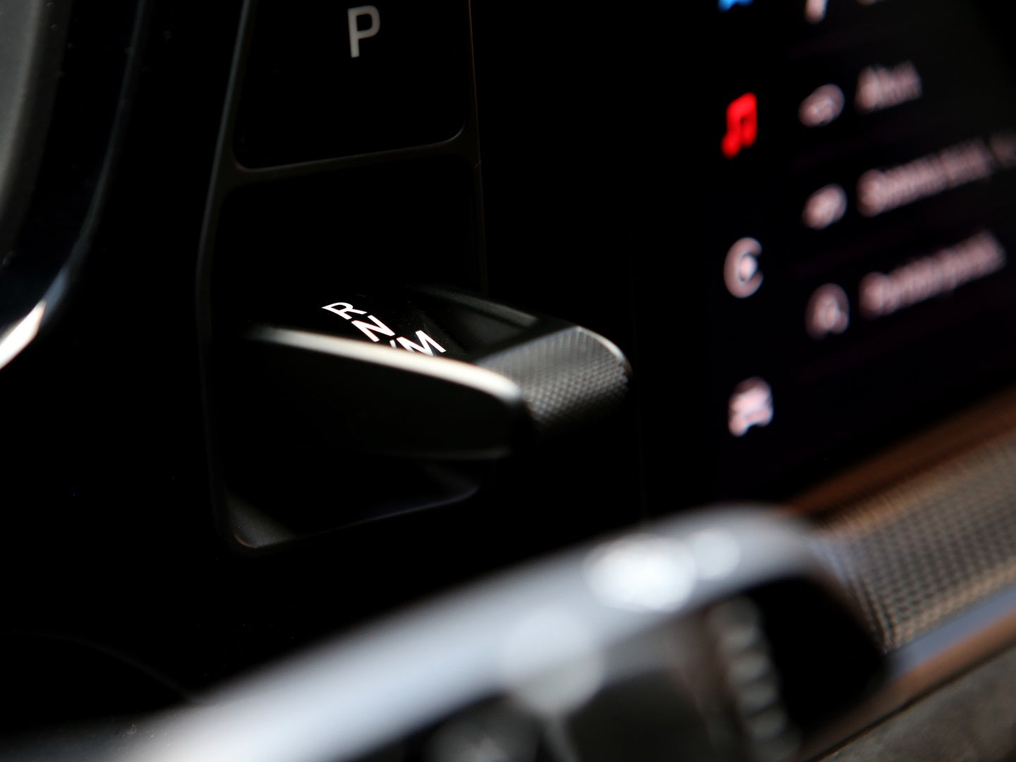 Veículo na cor cinza Crayon, rodas modelo Design GT, aerofólio exclusivo, escapamento esportivo com saídas centrais, interior em couro e Race Tex com costuras contrastantes, pacote Sport Chrono com botão Sport Response em vermelho, display do passageiro e sistema de som Burmester.