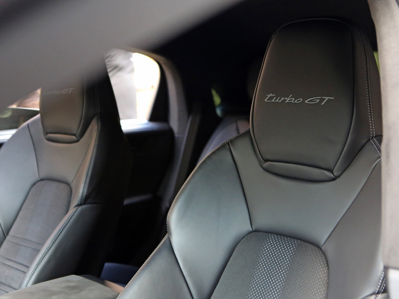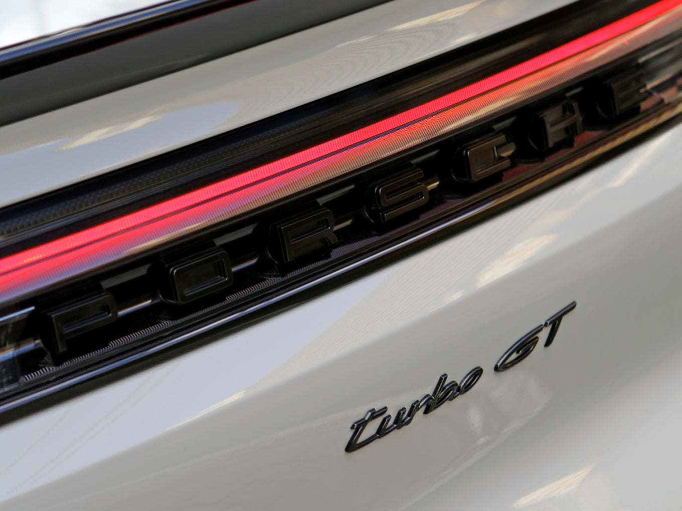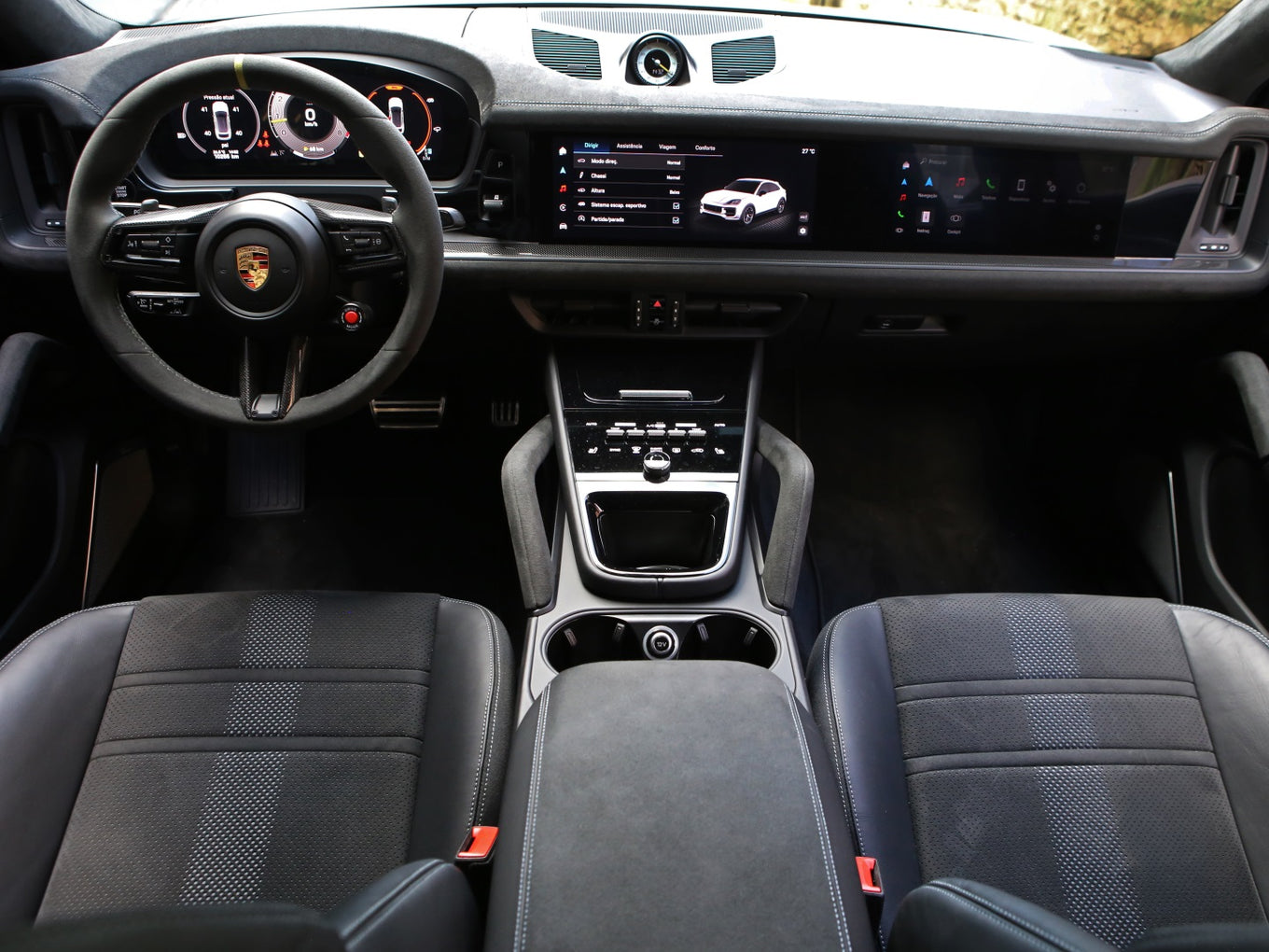 Veículo na cor cinza Crayon, rodas modelo Design GT, aerofólio exclusivo, escapamento esportivo com saídas centrais, interior em couro e Race Tex com costuras contrastantes, pacote Sport Chrono com botão Sport Response em vermelho, display do passageiro e sistema de som Burmester.