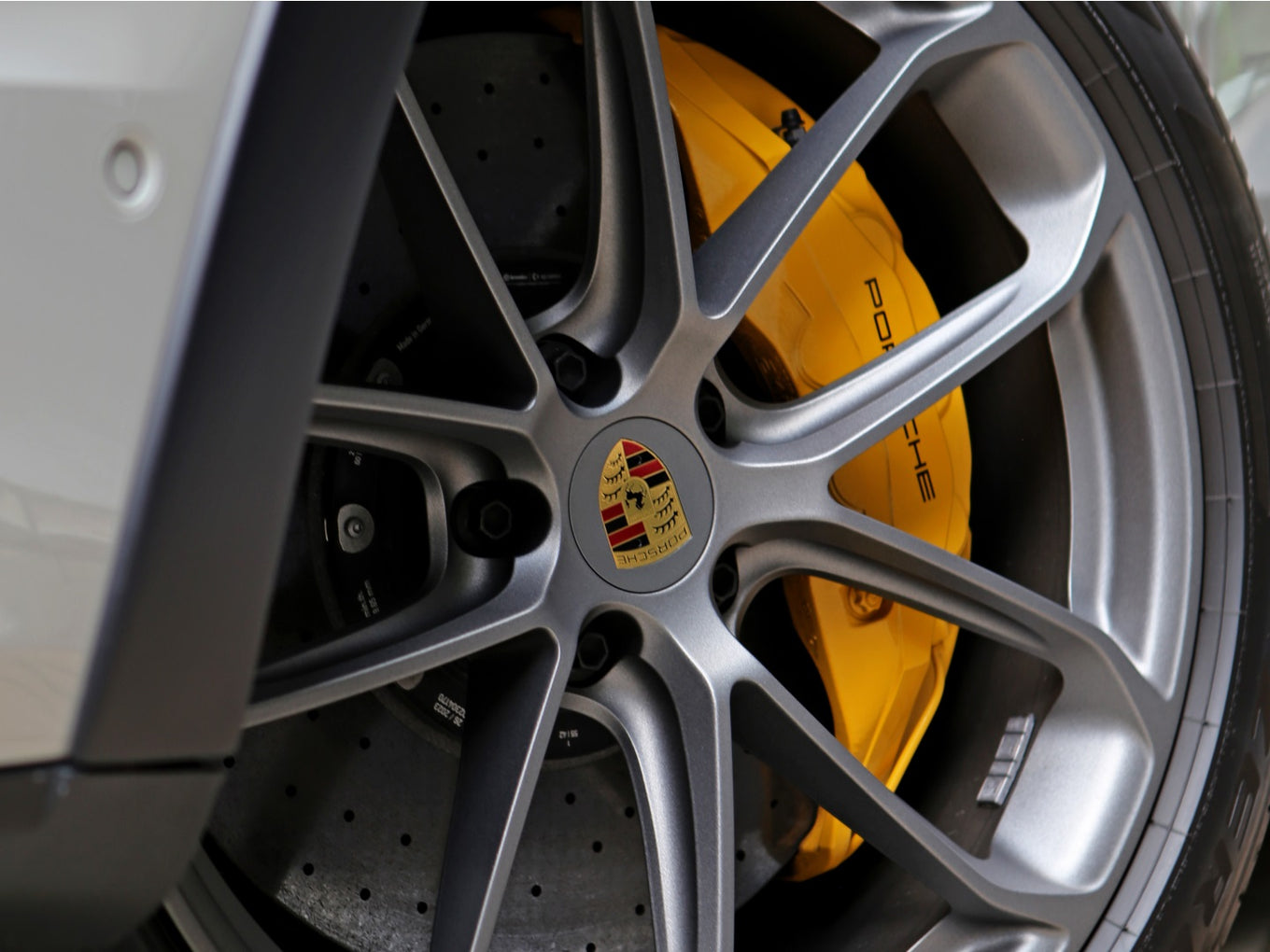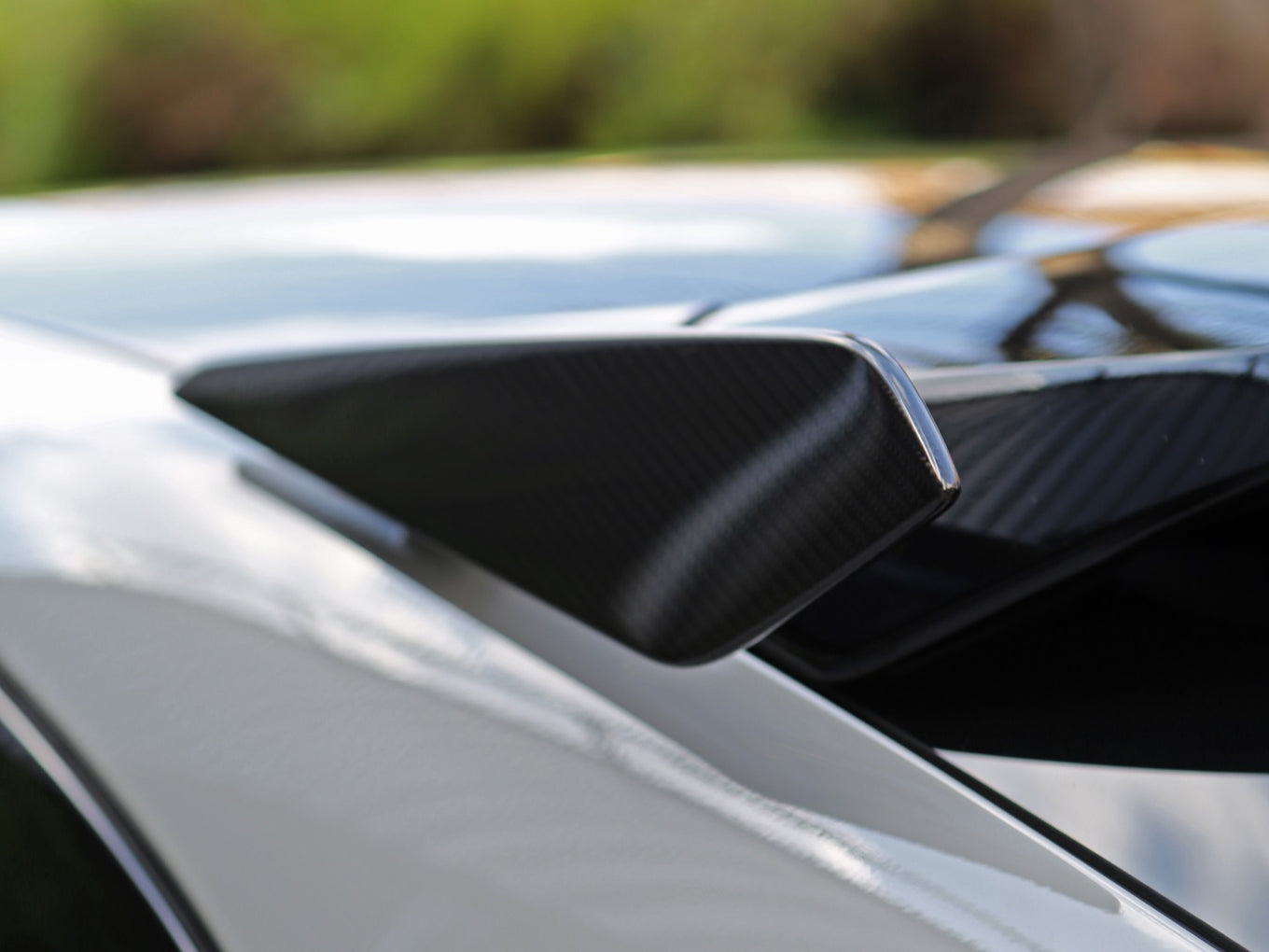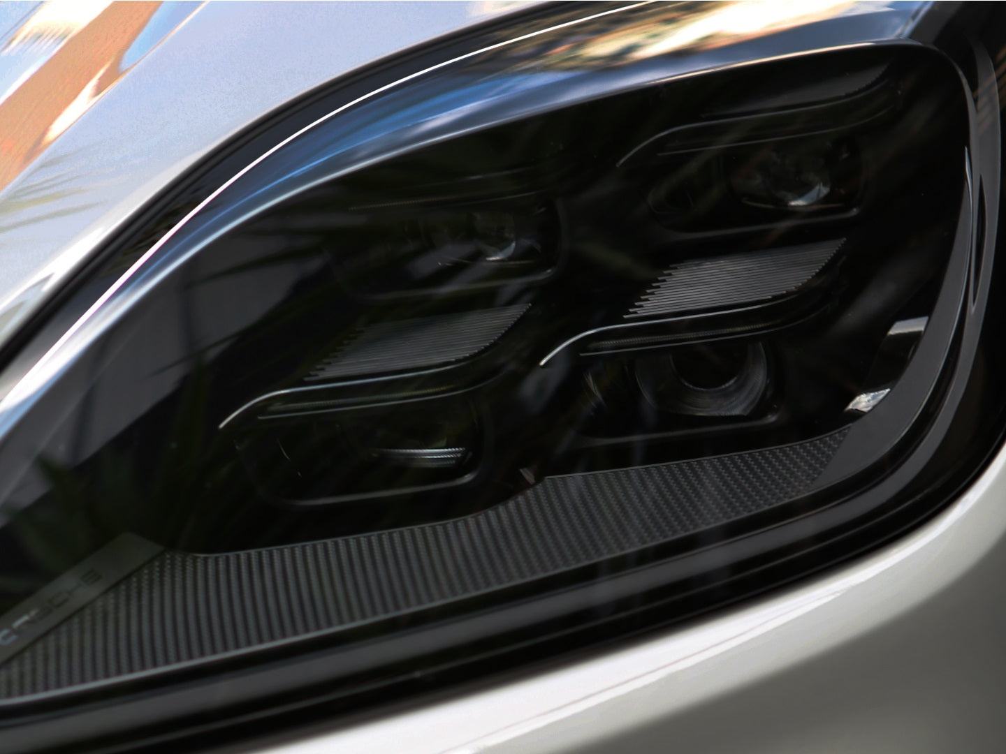 Veículo na cor cinza Crayon, rodas modelo Design GT, aerofólio exclusivo, escapamento esportivo com saídas centrais, interior em couro e Race Tex com costuras contrastantes, pacote Sport Chrono com botão Sport Response em vermelho, display do passageiro e sistema de som Burmester.