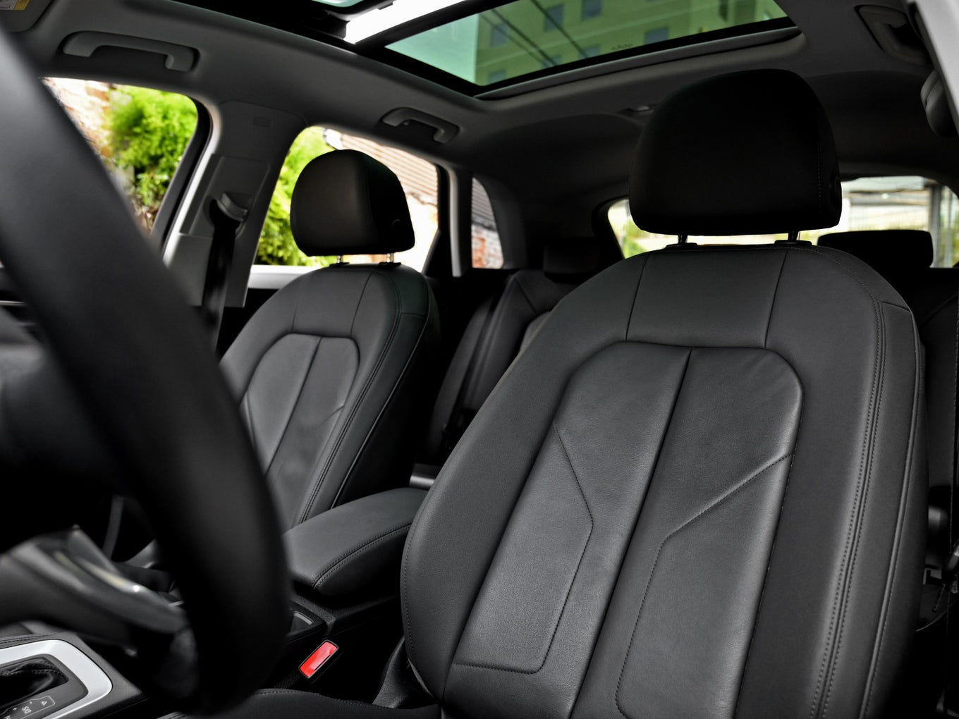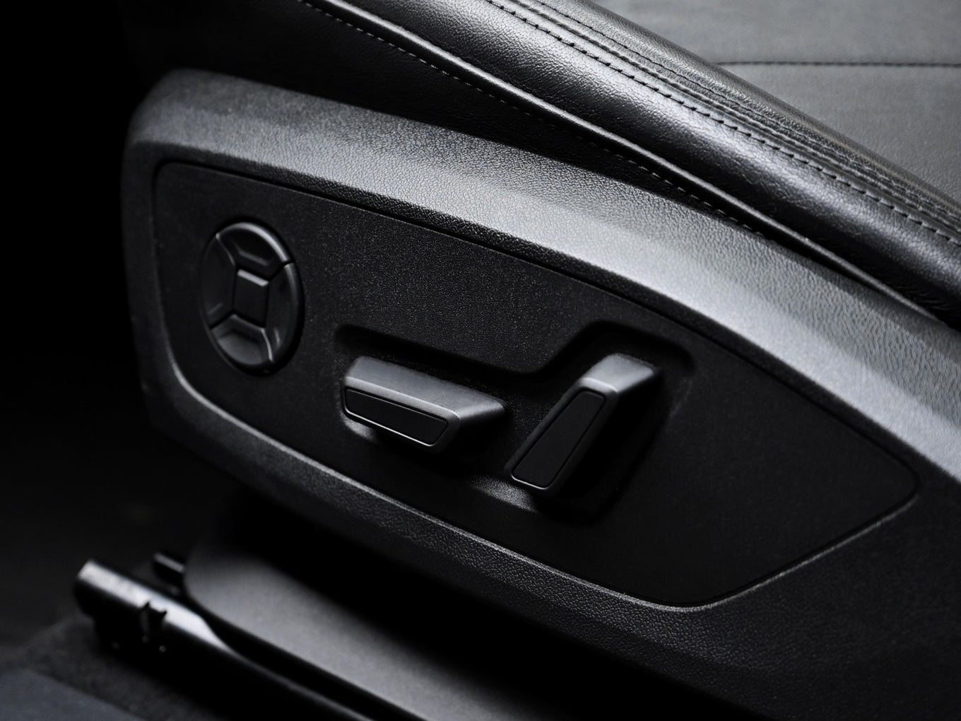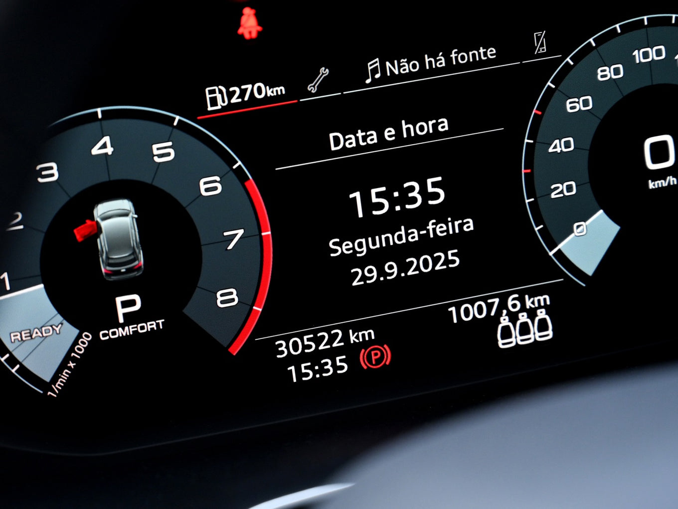 Veículo com rodas de liga leve, teto solar panorâmico, bancos em couro com ajustes elétricos, ignição start/stop, painel TFT, ar condicionado dual zone e carregamento por aproximação.