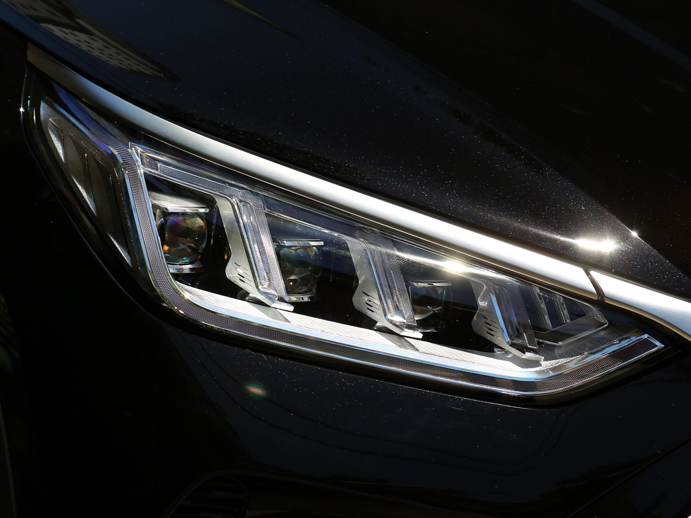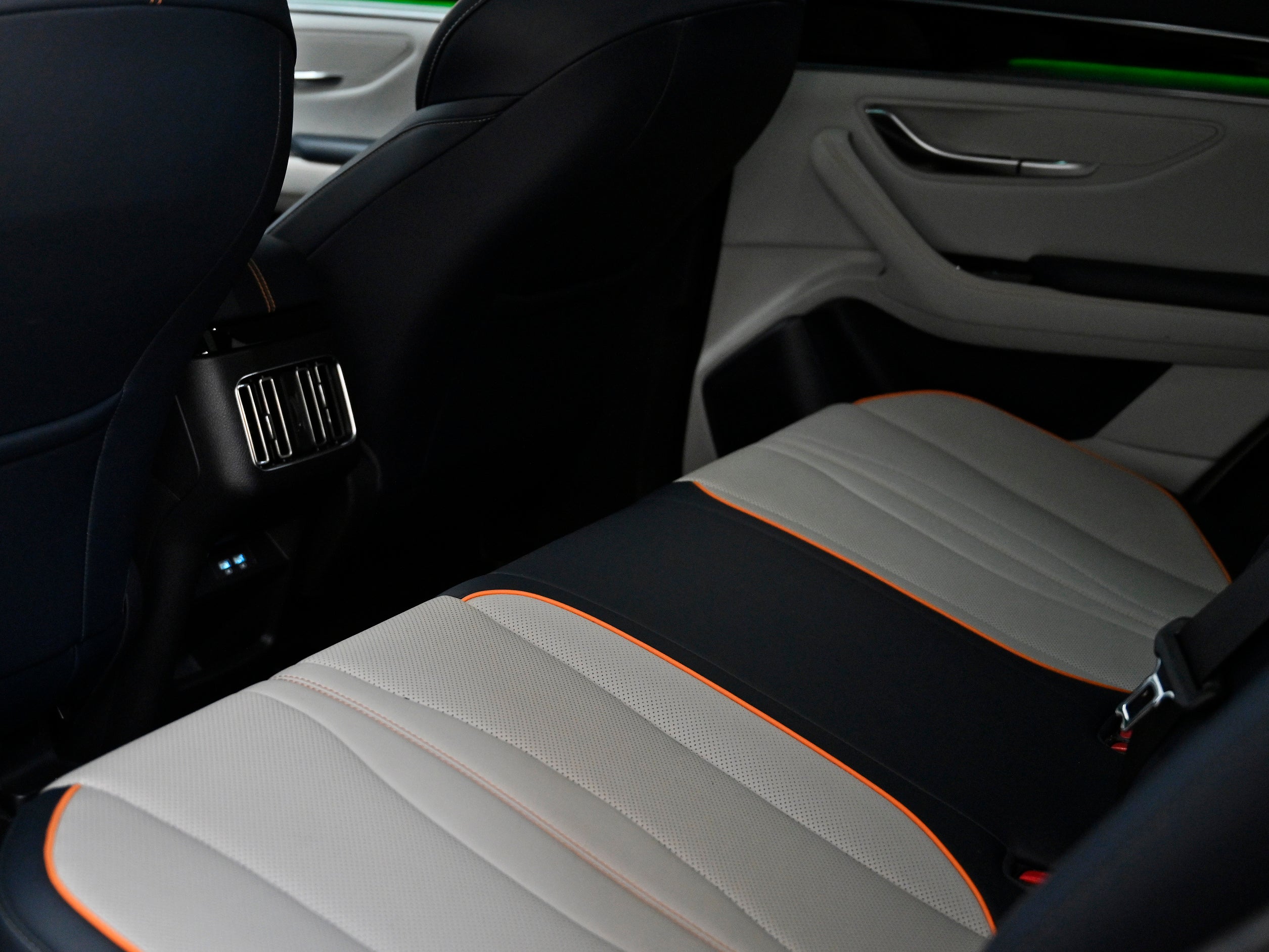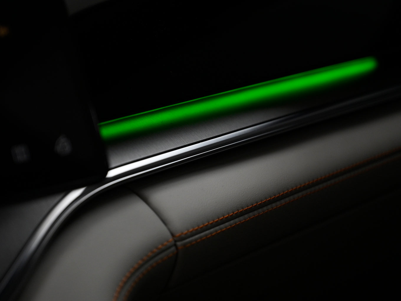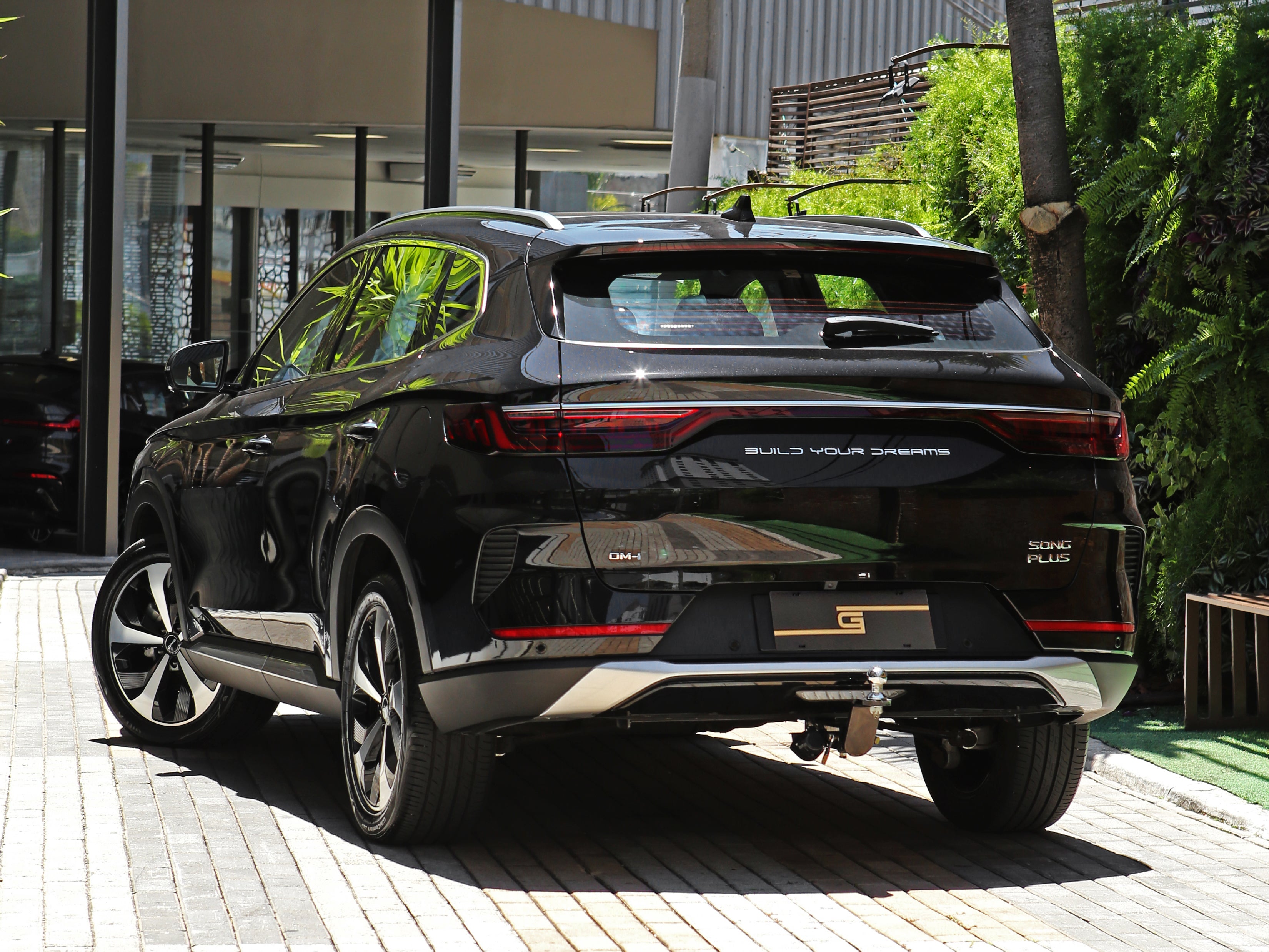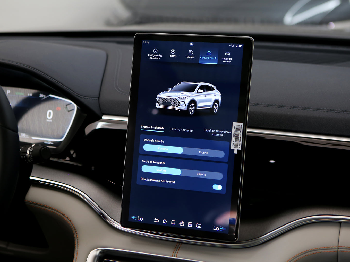 Veículo com rodas de liga leve, faróis e lanternas em led, teto solar, bancos em couro bicolor com ajustes elétricos, painel TFT, ignição start/stop, tela rotativa de 15 polegadas e carregamento por aproximação.