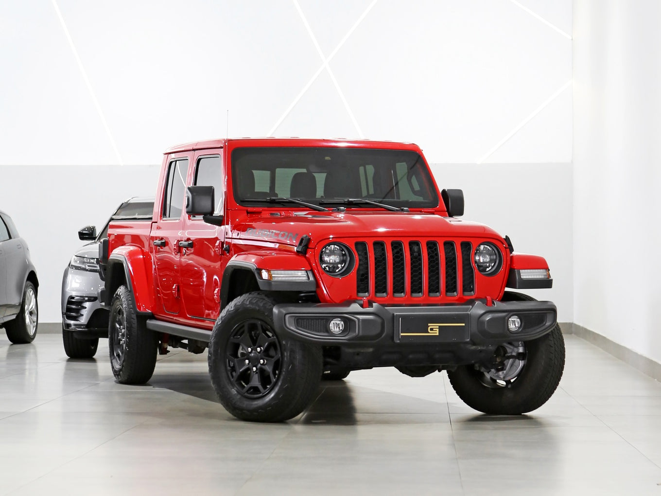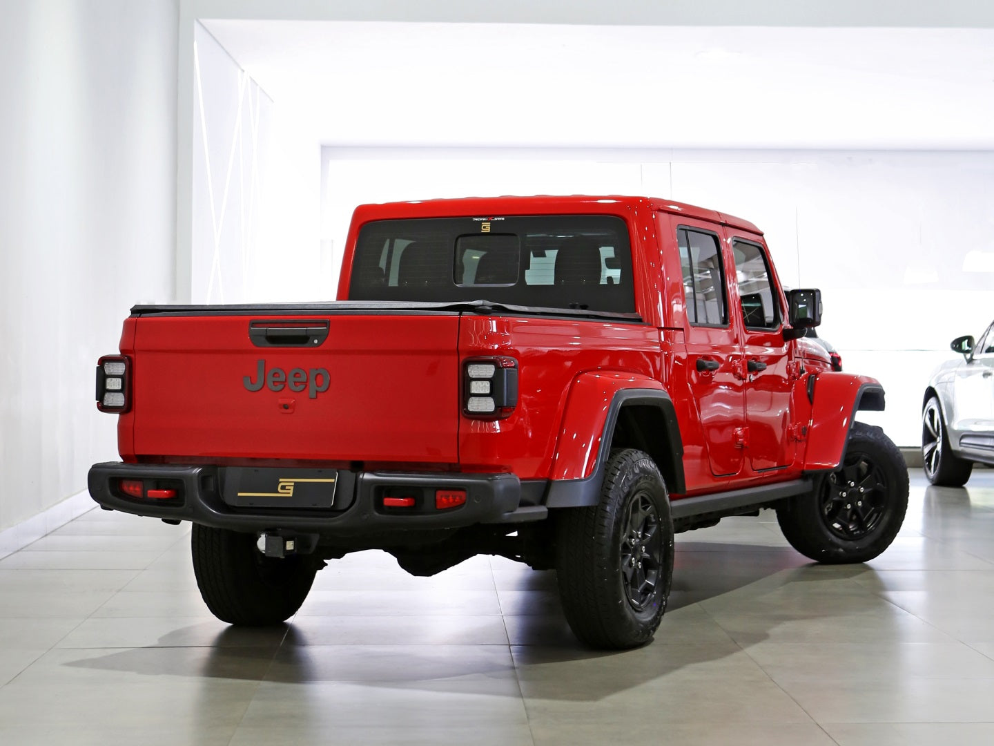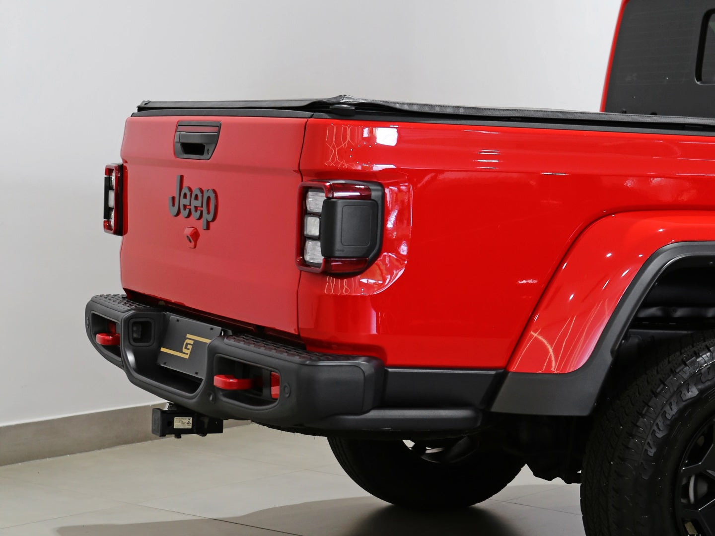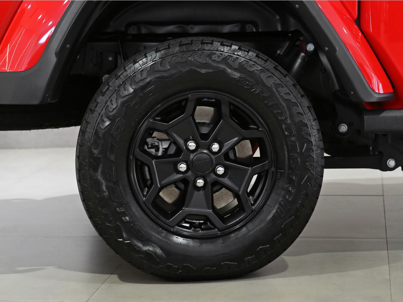 Veículo com rodas de liga leve em preto acetinado, faróis em led, teto e portas removíveis, bloqueador de diferencial Tru-lok, bancos em couro com costuras vermelhas e ignição start/stop.