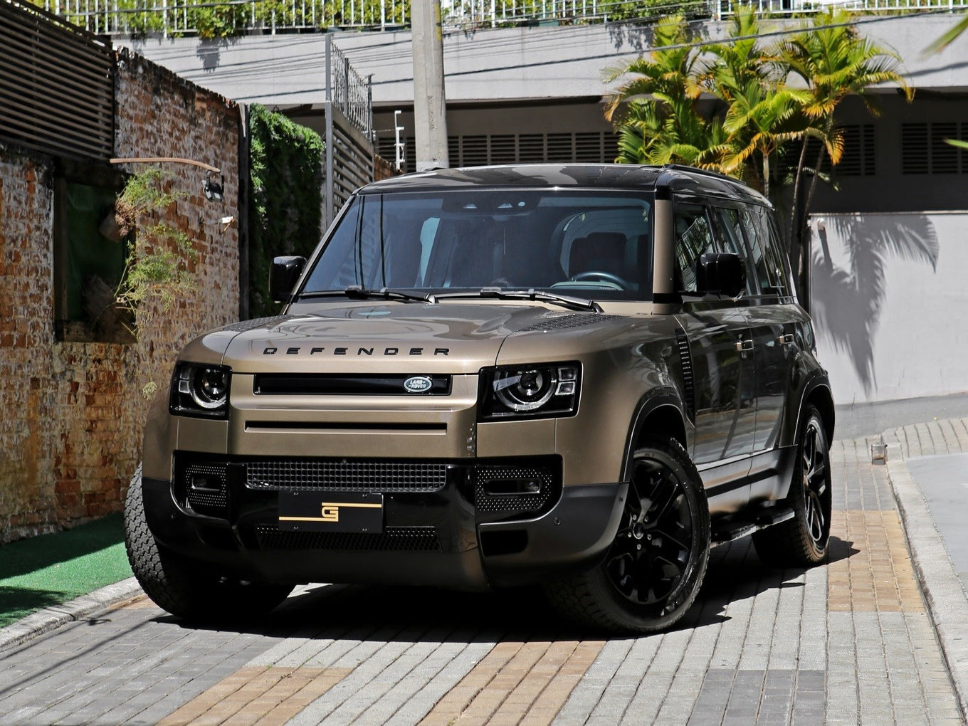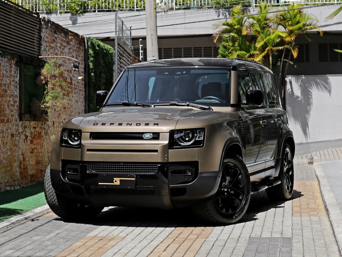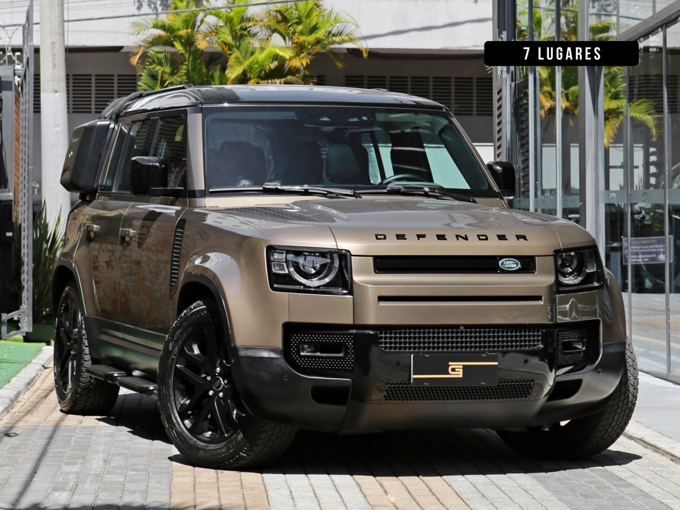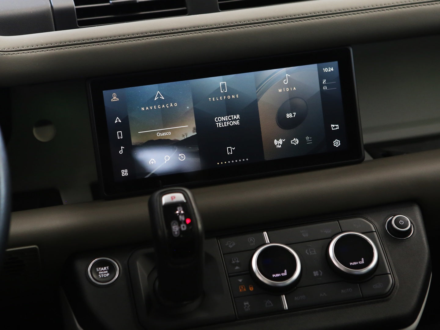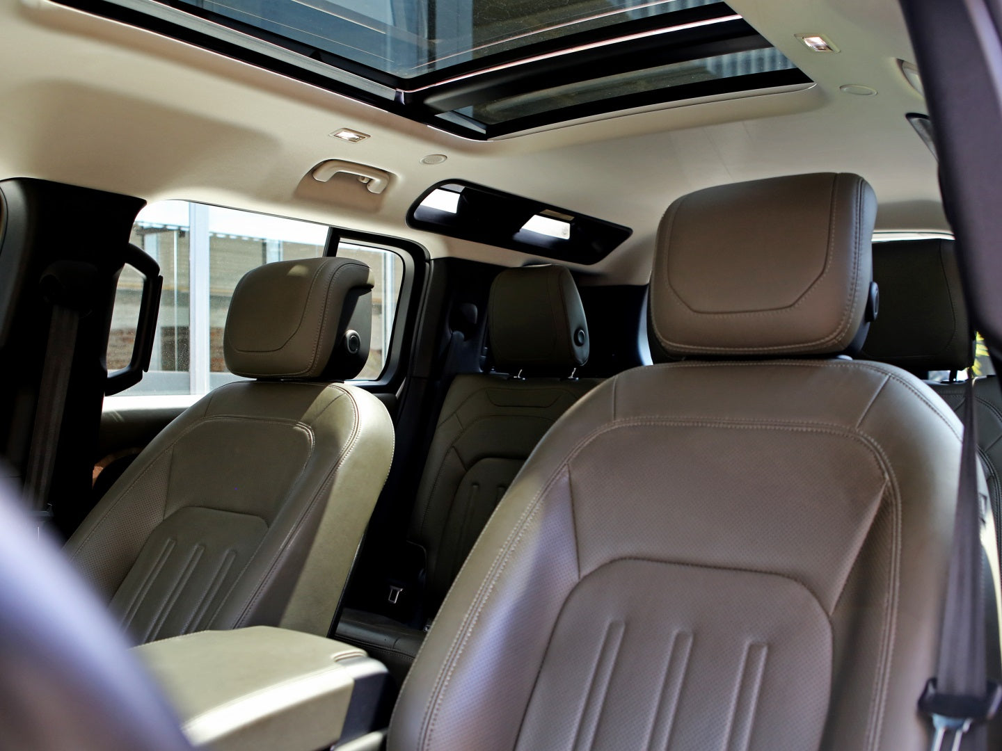 Veículo na cor Gondwana Stone com rodas de liga leve em black piano, caixa de armazenamento lateral, teto solar panorâmico, bancos em couro, painel TFT e sistema de som Meridian com 7 lugares