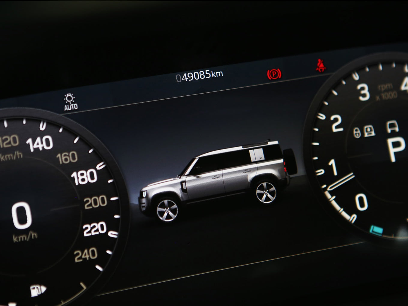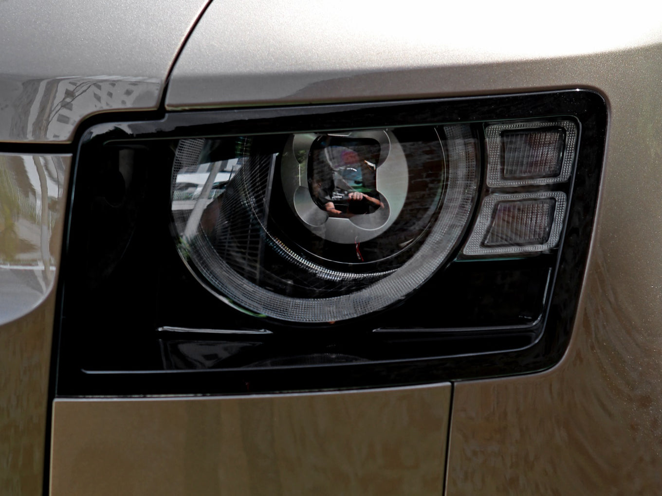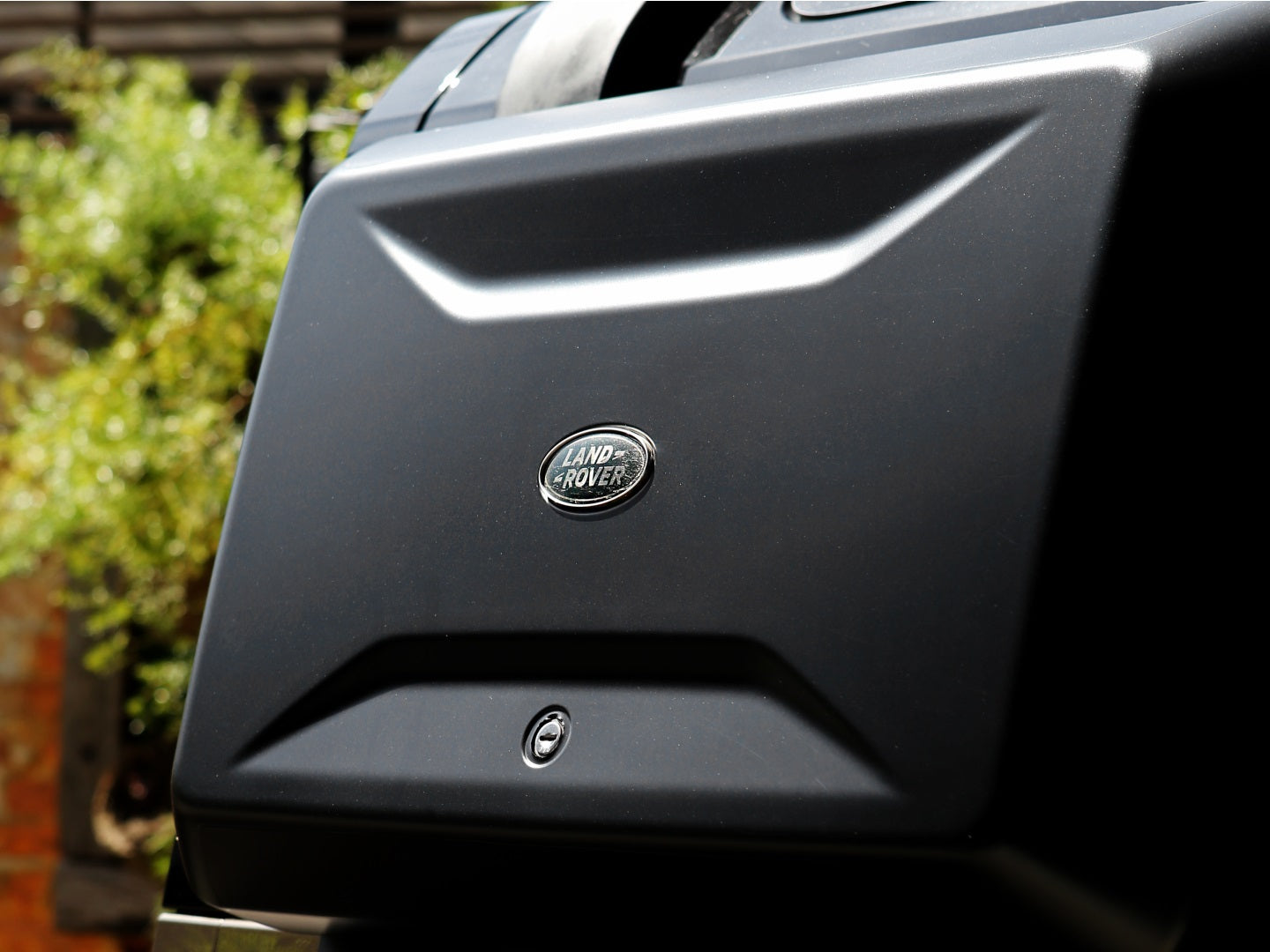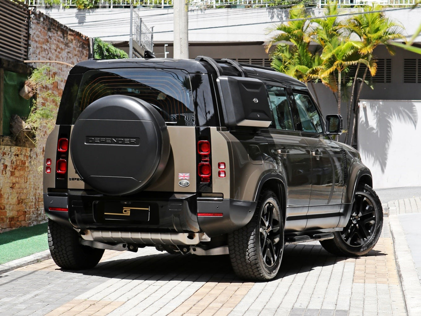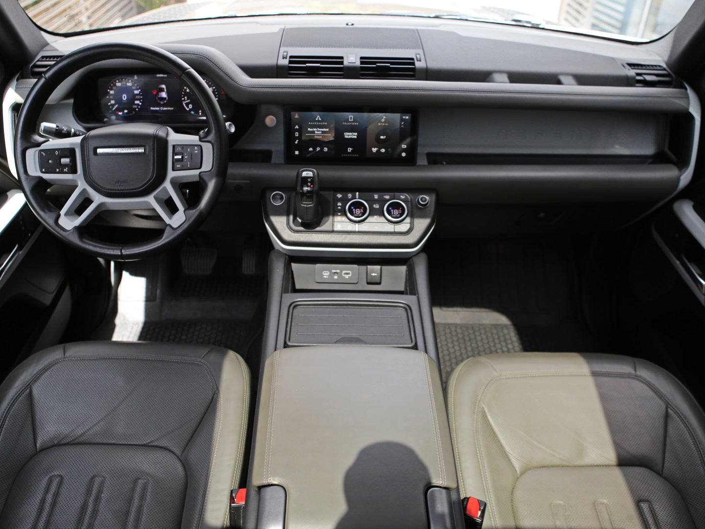 Veículo na cor Gondwana Stone com rodas de liga leve em black piano, caixa de armazenamento lateral, teto solar panorâmico, bancos em couro, painel TFT e sistema de som Meridian com 7 lugares