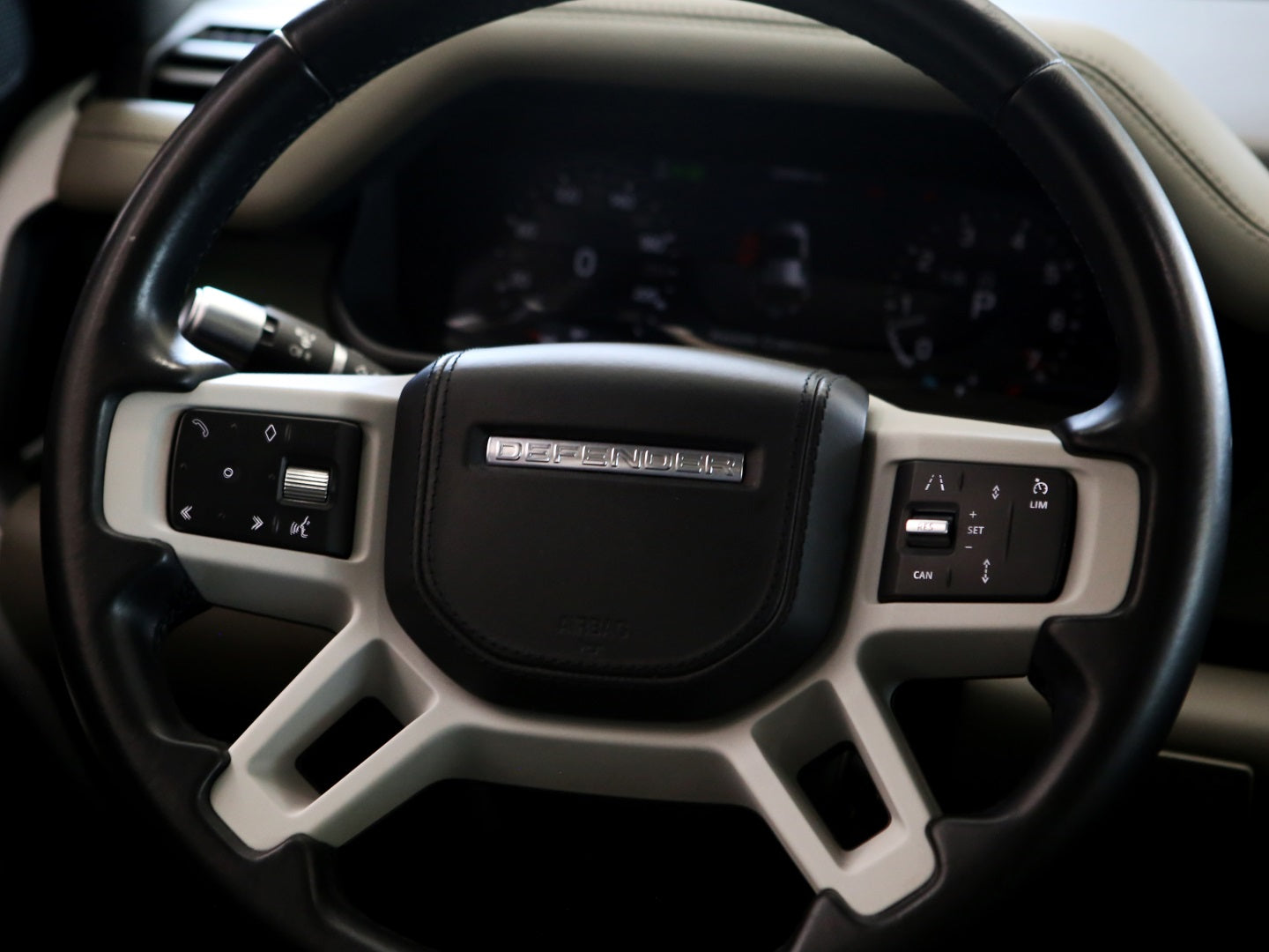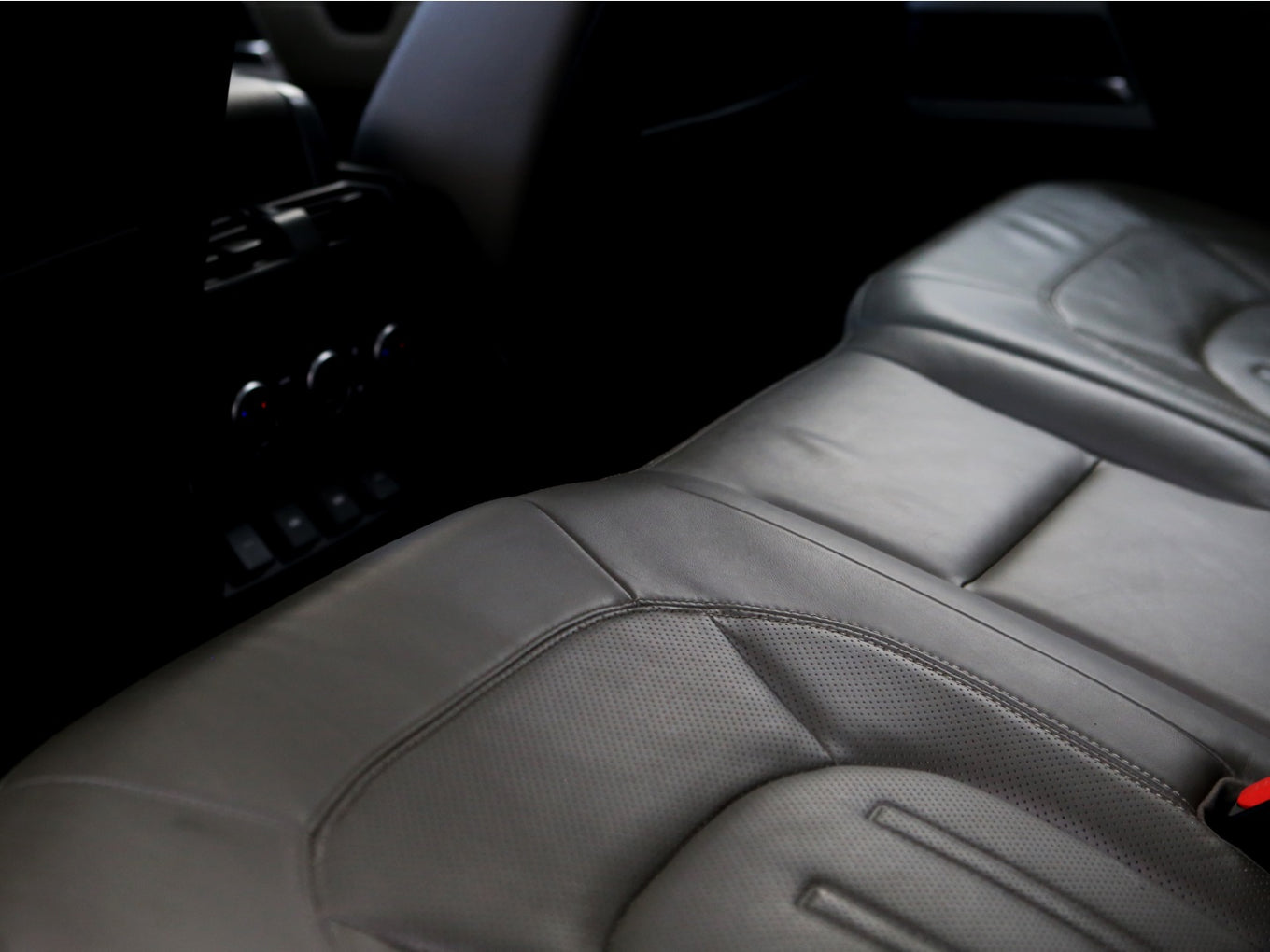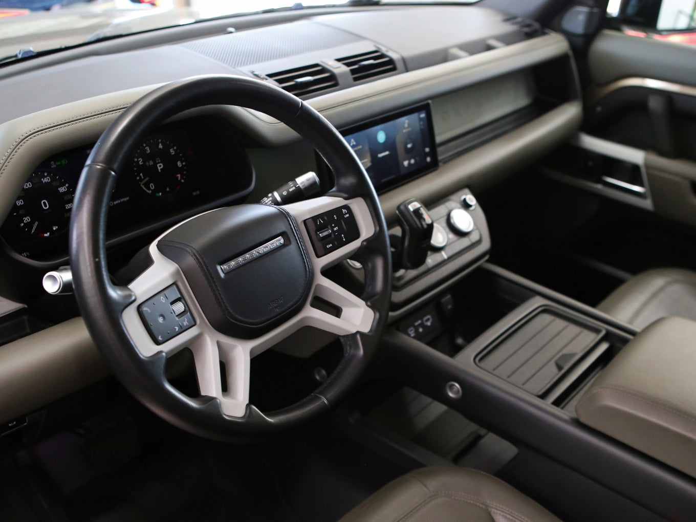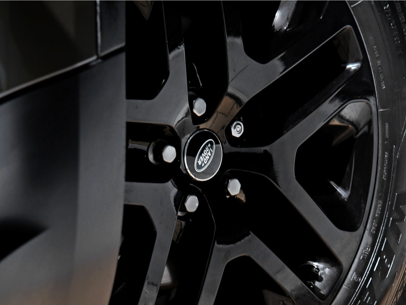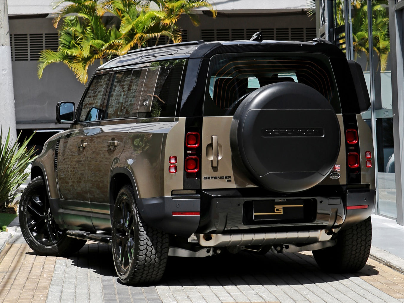 Veículo na cor Gondwana Stone com rodas de liga leve em black piano, caixa de armazenamento lateral, teto solar panorâmico, bancos em couro, painel TFT e sistema de som Meridian com 7 lugares