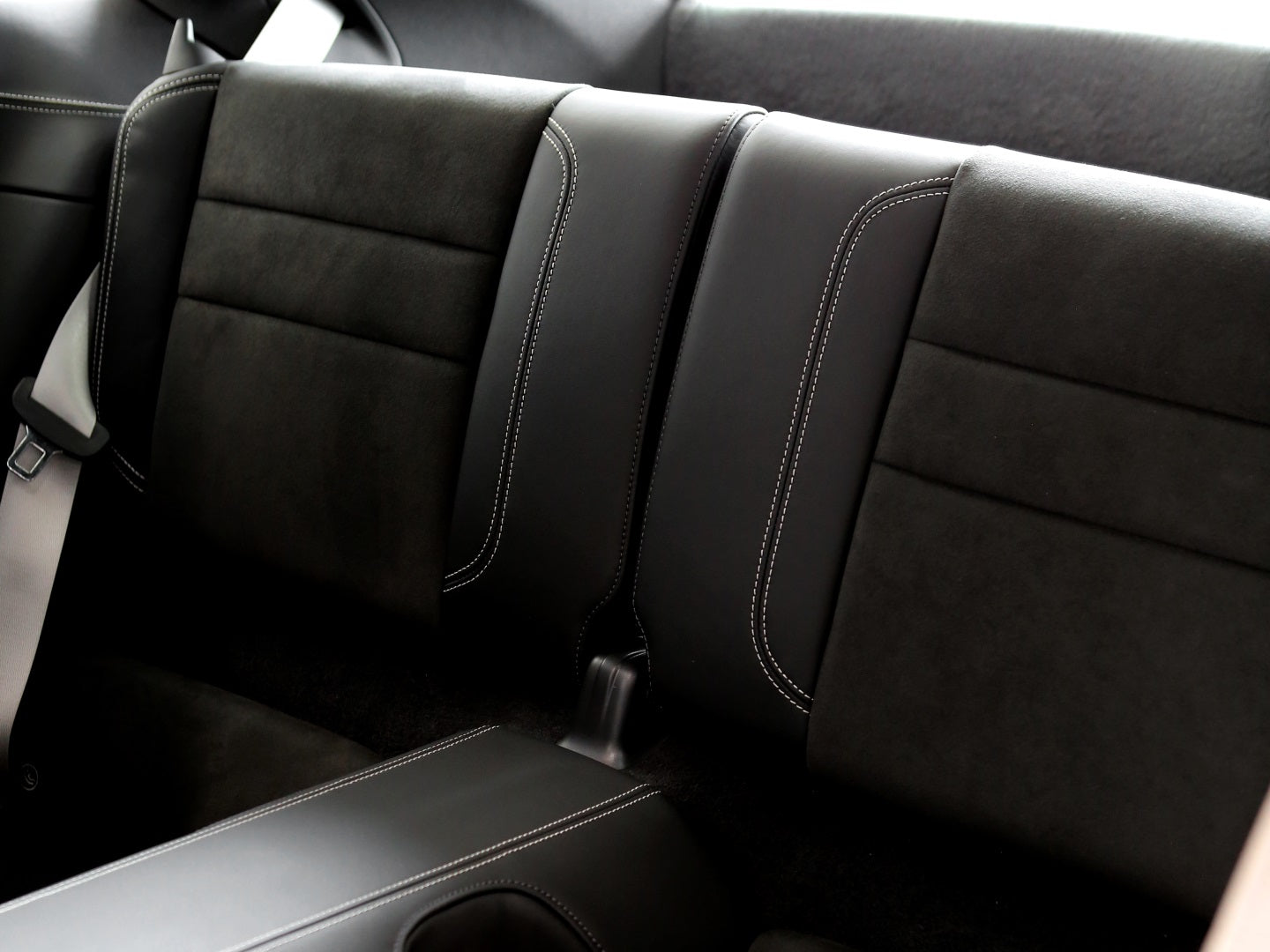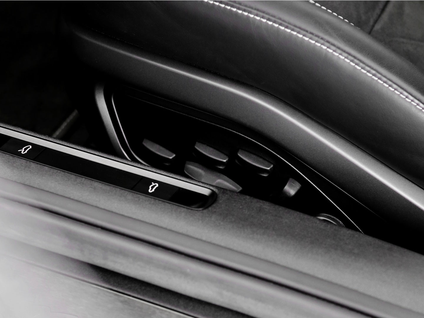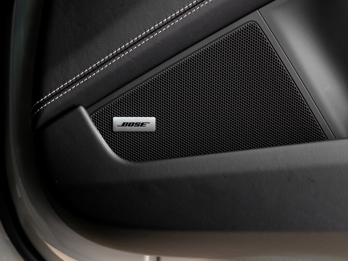 Veículo na cor cinza Crayon com rodas em preto acetinado, teto solar, interior em couro e alcântara, pacote Sport Chrono e sistema de som Bose.
