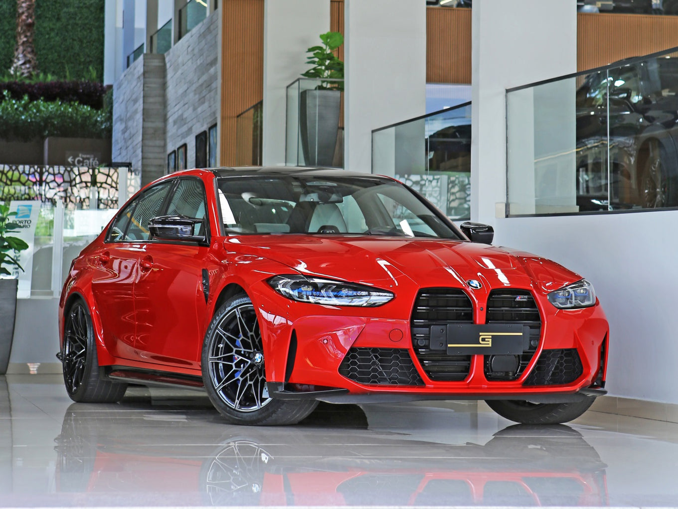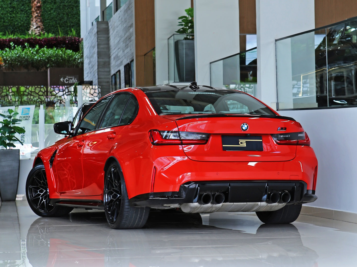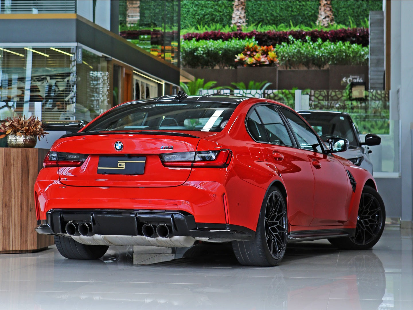 Veículo com rodas de liga leve exclusivas, faróis e lanternas em led, teto fibra de carbono, bancos em couro bicolor Oyster e preto, painel TFT e sistema de som Harman Kardon.