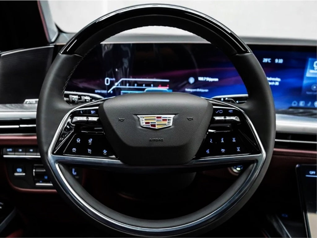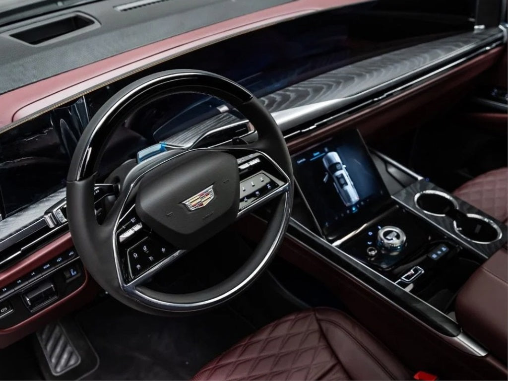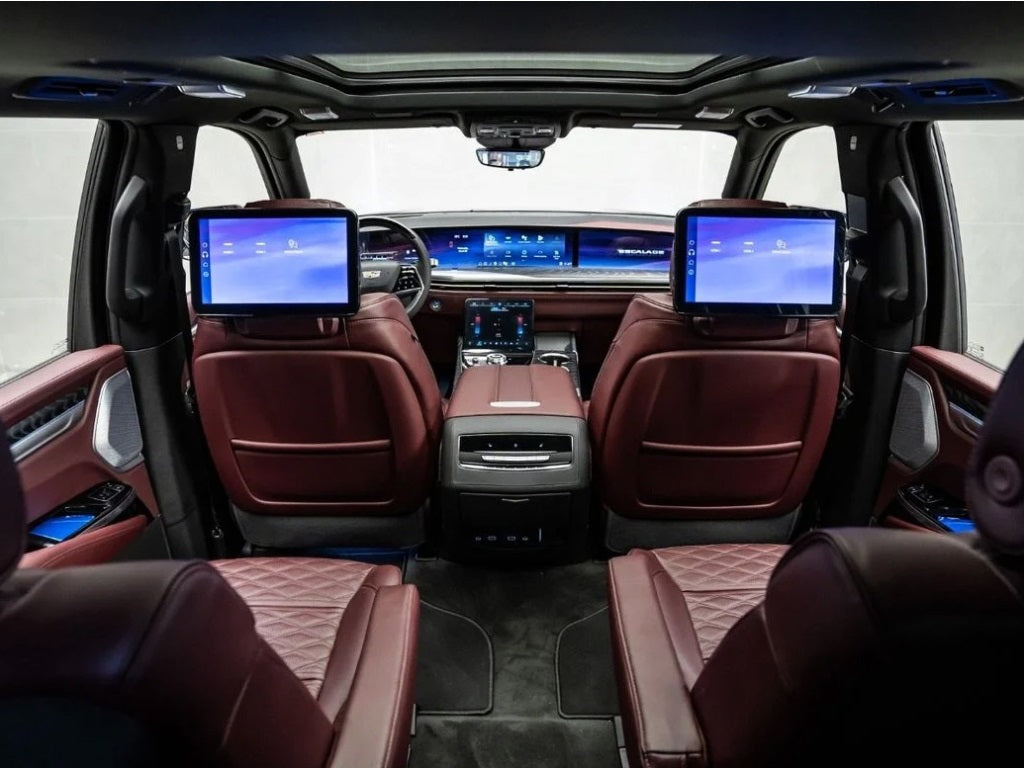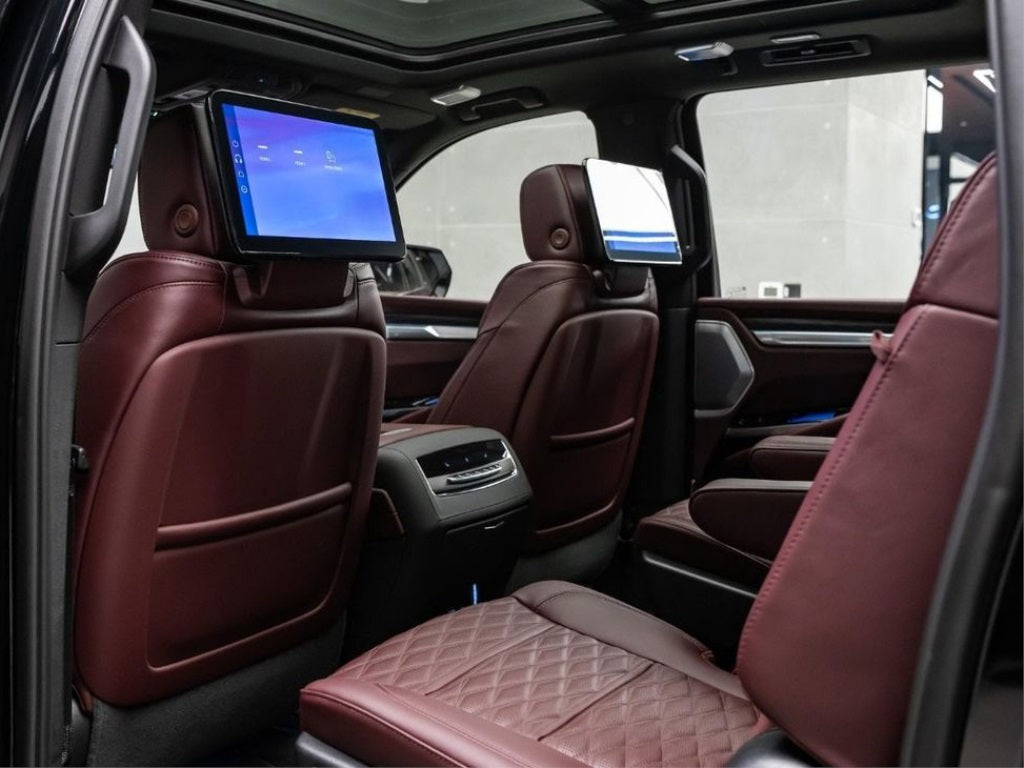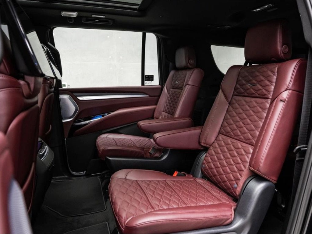 Veículo 7 lugares com grade frontal em black piano, rodas aro 22 diamantadas, interior bicolor preto e bordô, acabamentos em madeira e teto solar panorâmico.
