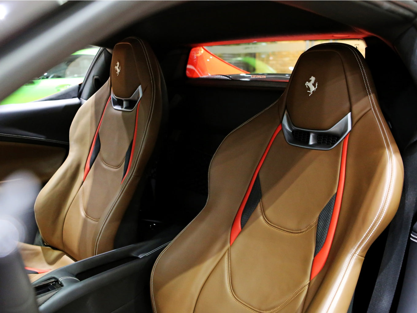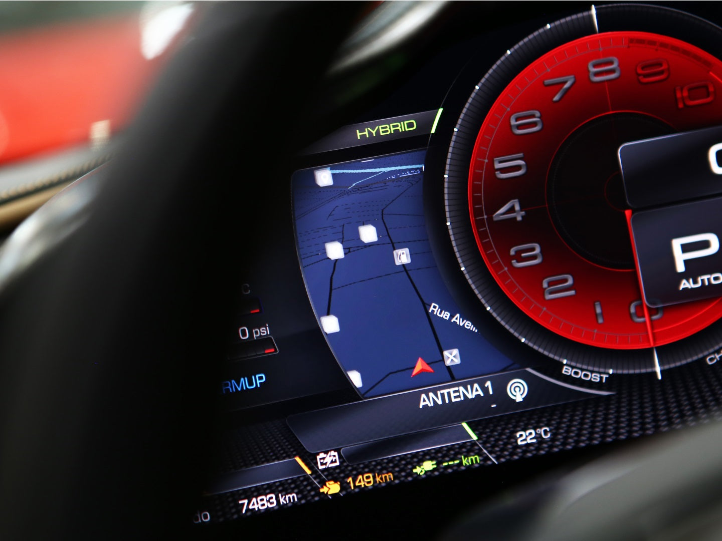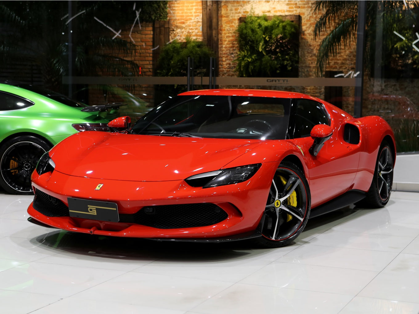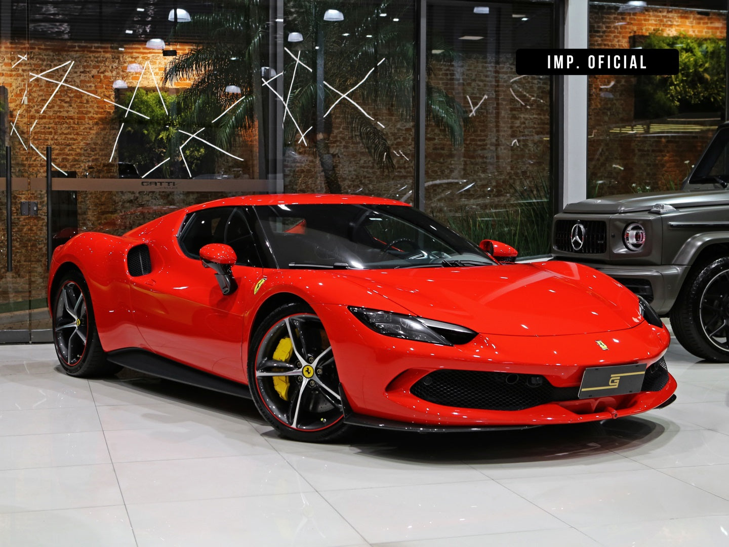 Veículo de importação oficial, na cor Rosso Scuderia com rodas de liga leve diamantadas, interior Terra Bruciata e preto com acabamentos em fibra de carbono.