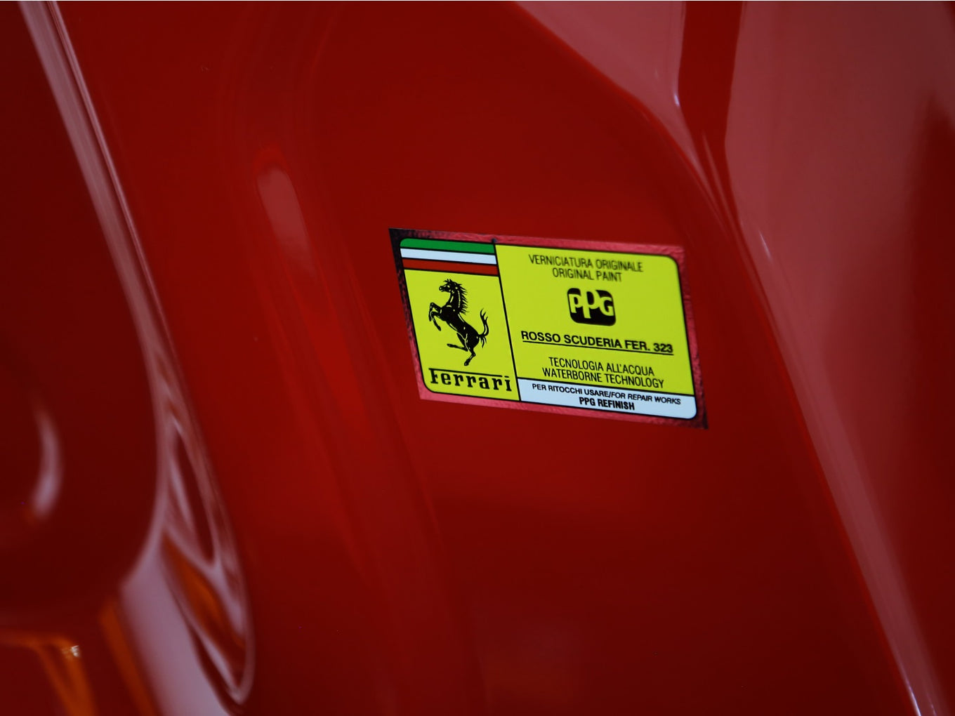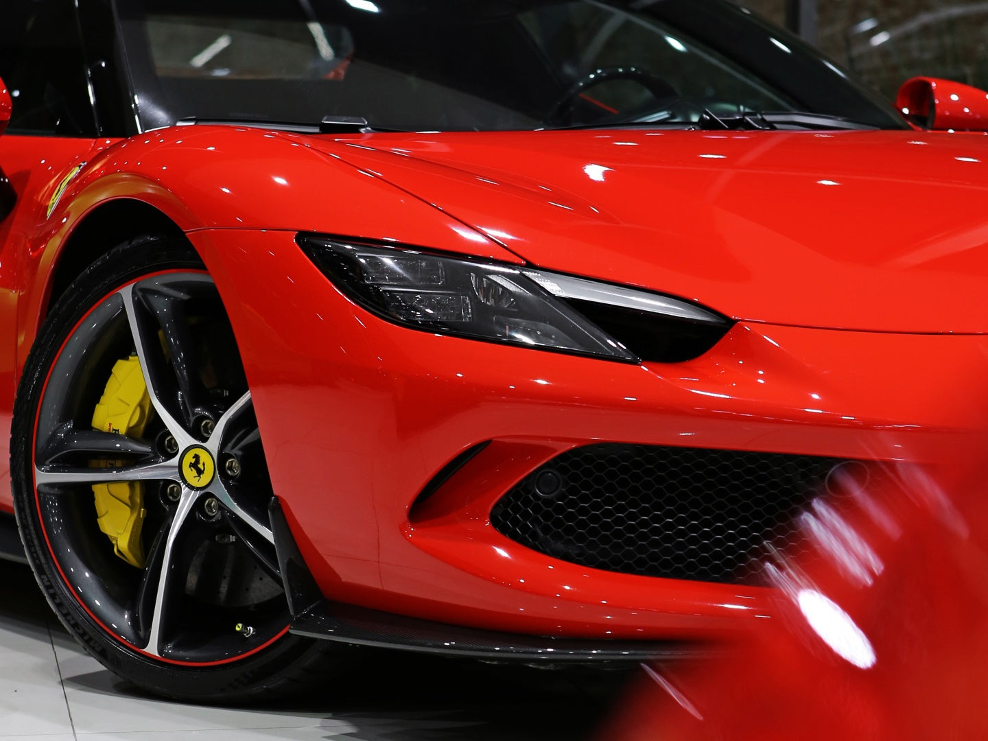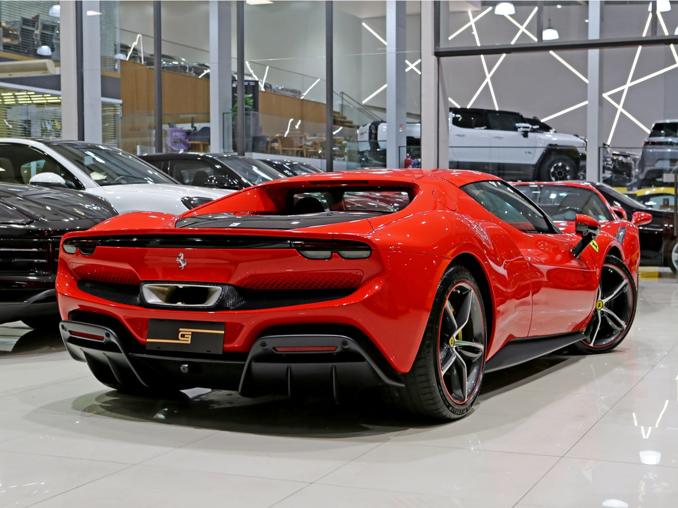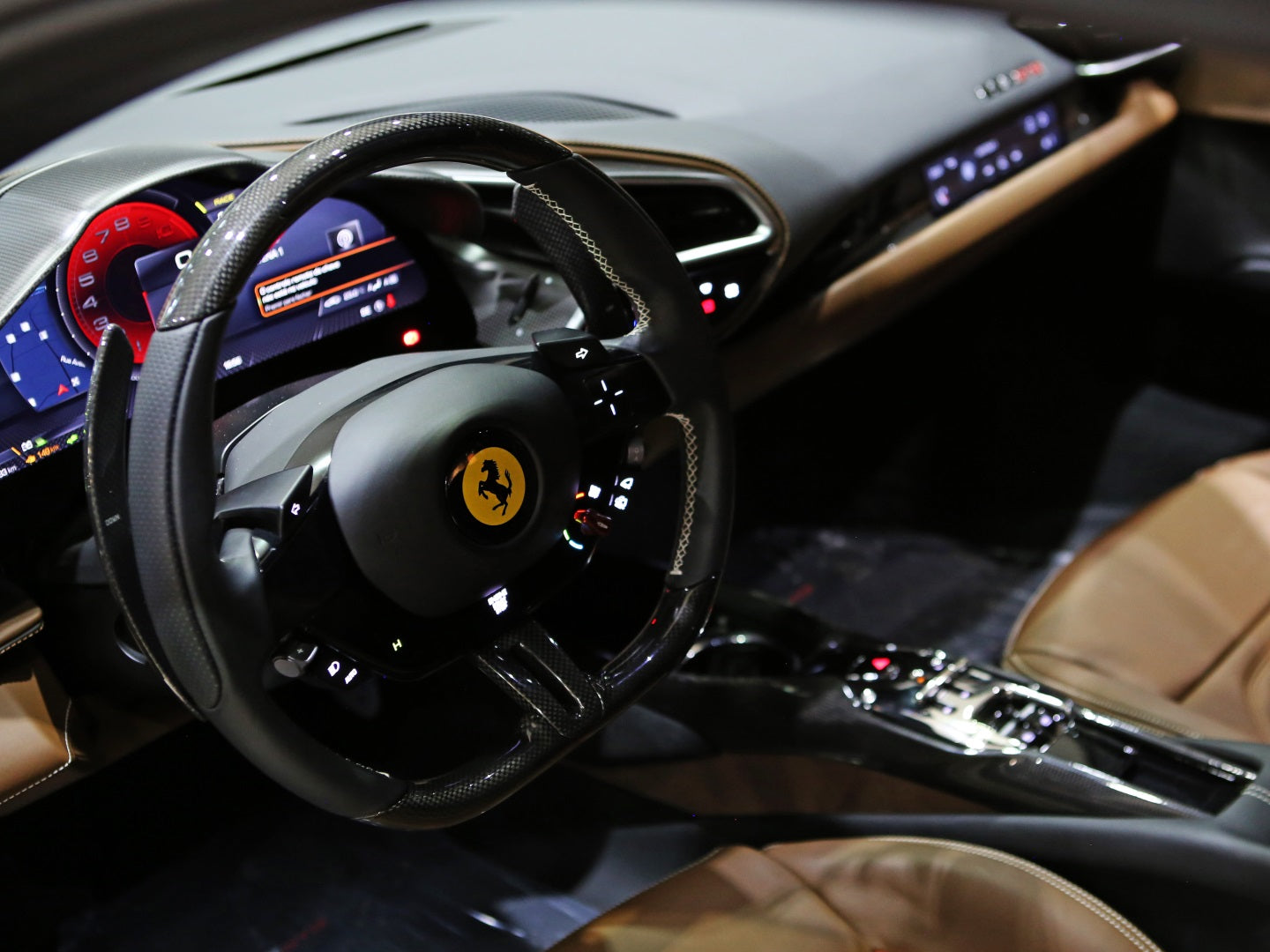 Veículo de importação oficial, na cor Rosso Scuderia com rodas de liga leve diamantadas, interior Terra Bruciata e preto com acabamentos em fibra de carbono.