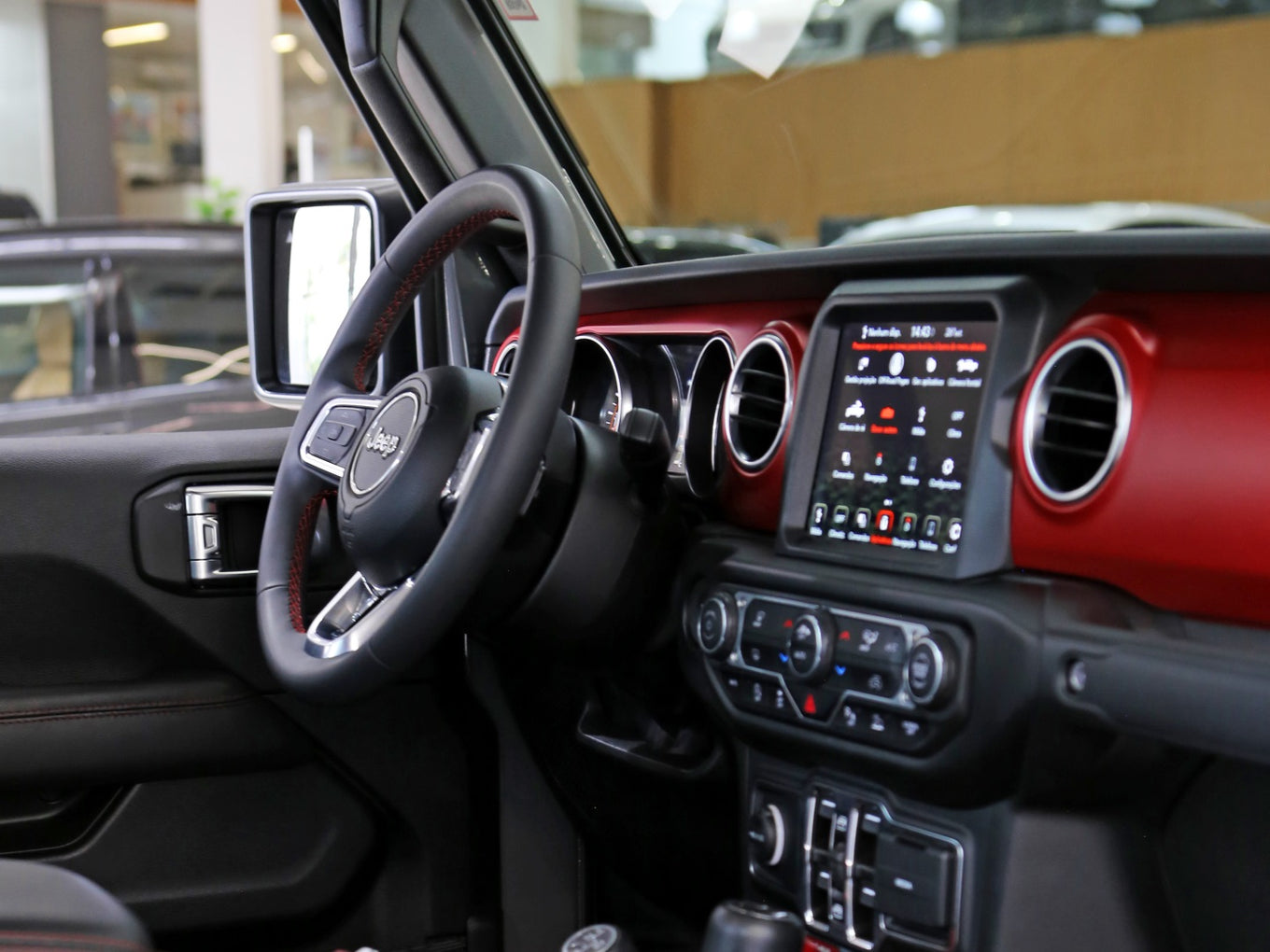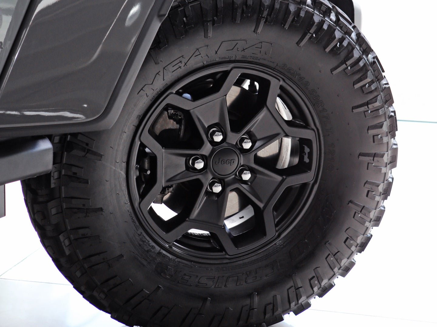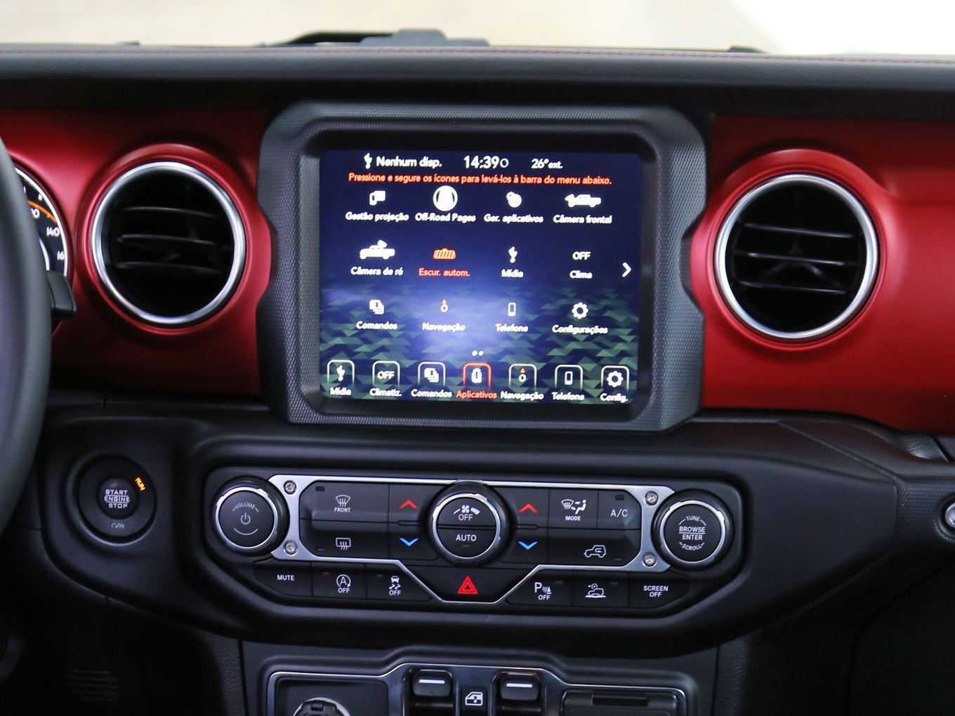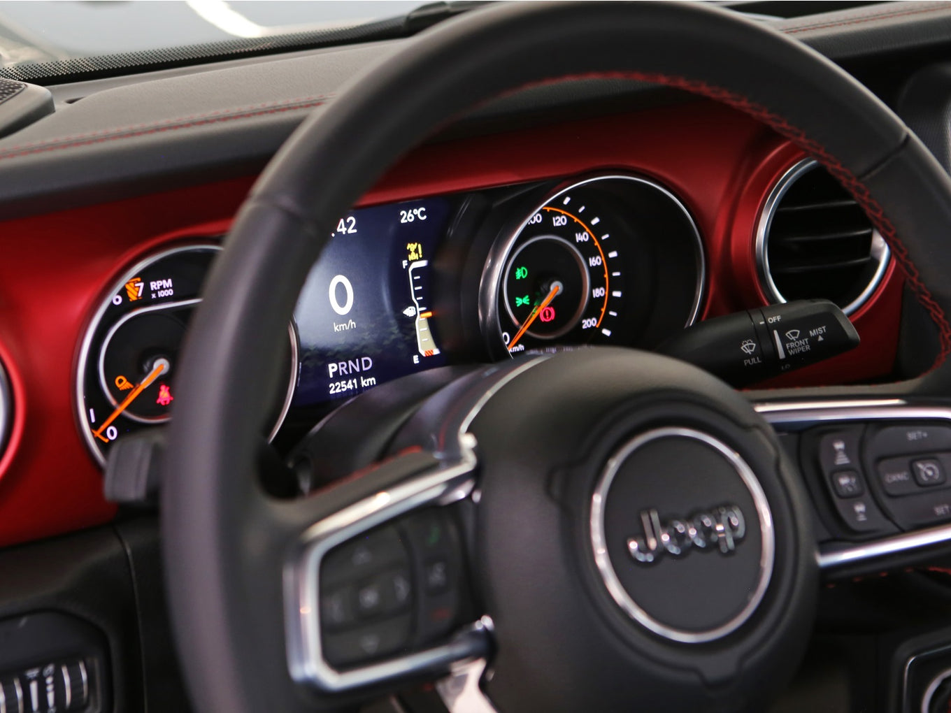 Veículo com rodas de liga leve em preto acetinado, bloqueador de diferencial Tru-lok, faróis em led, teto e portas removíveis, bancos em couro com costuras exclusivas e acabamentos em vermelho metálico.