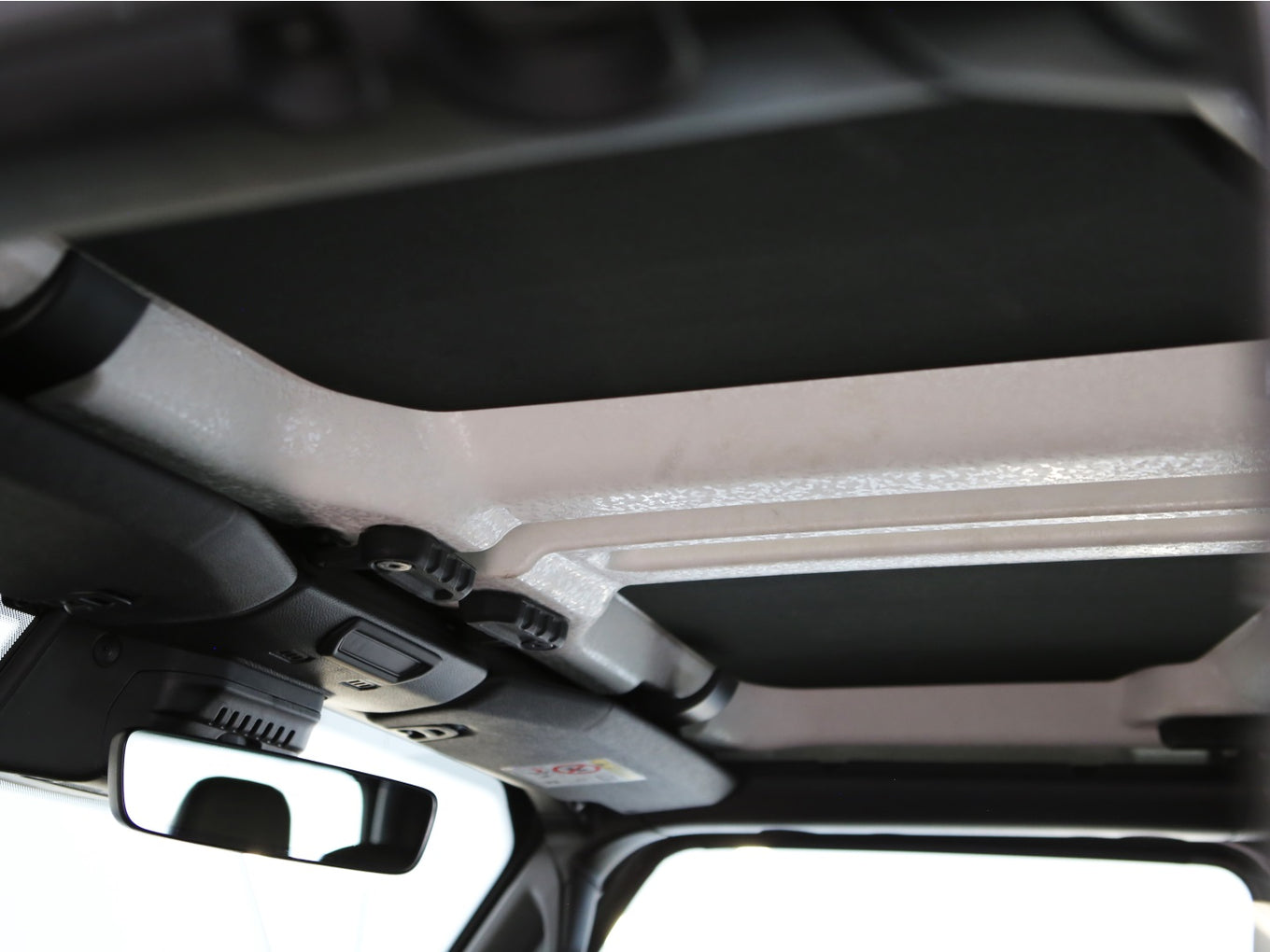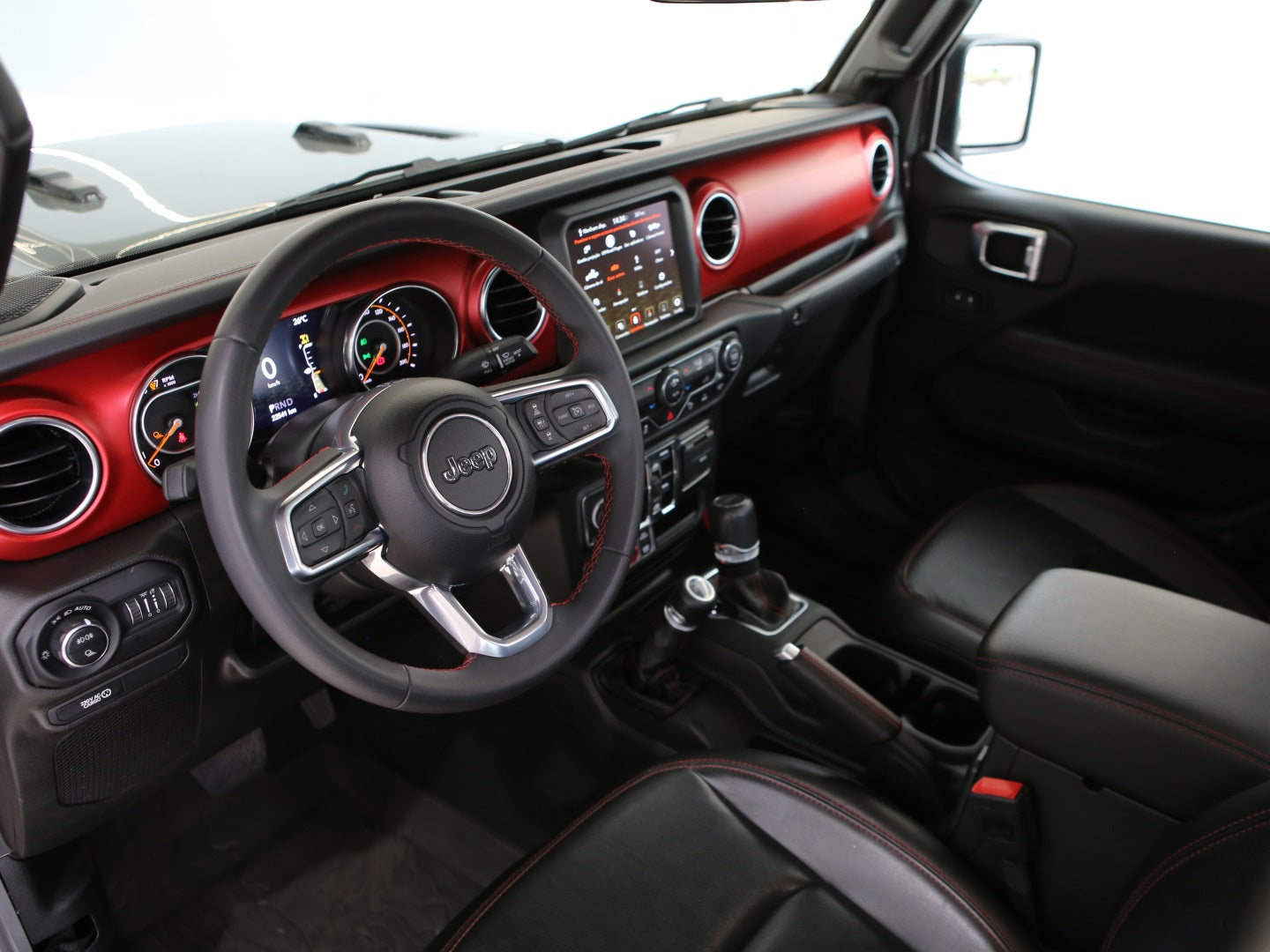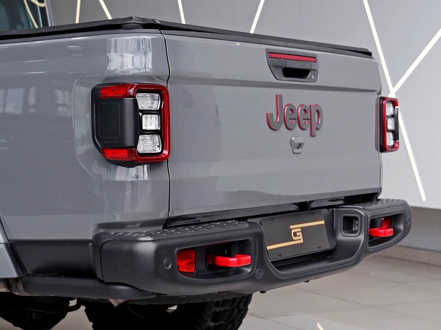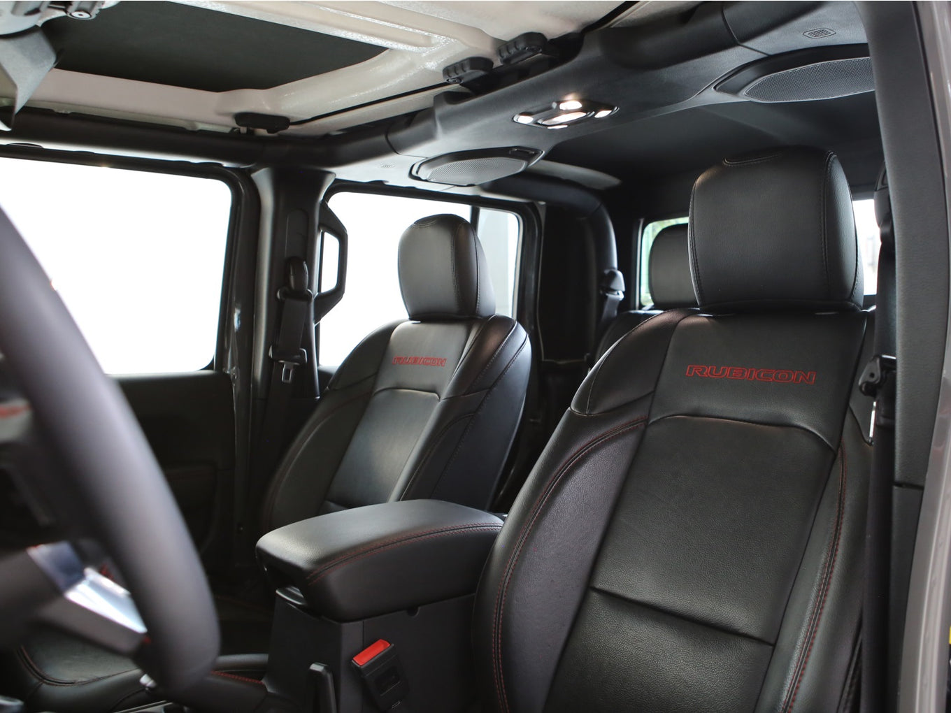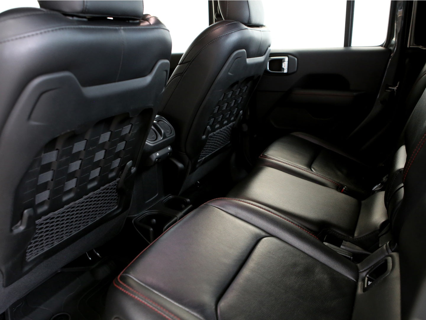 Veículo com rodas de liga leve em preto acetinado, bloqueador de diferencial Tru-lok, faróis em led, teto e portas removíveis, bancos em couro com costuras exclusivas e acabamentos em vermelho metálico.