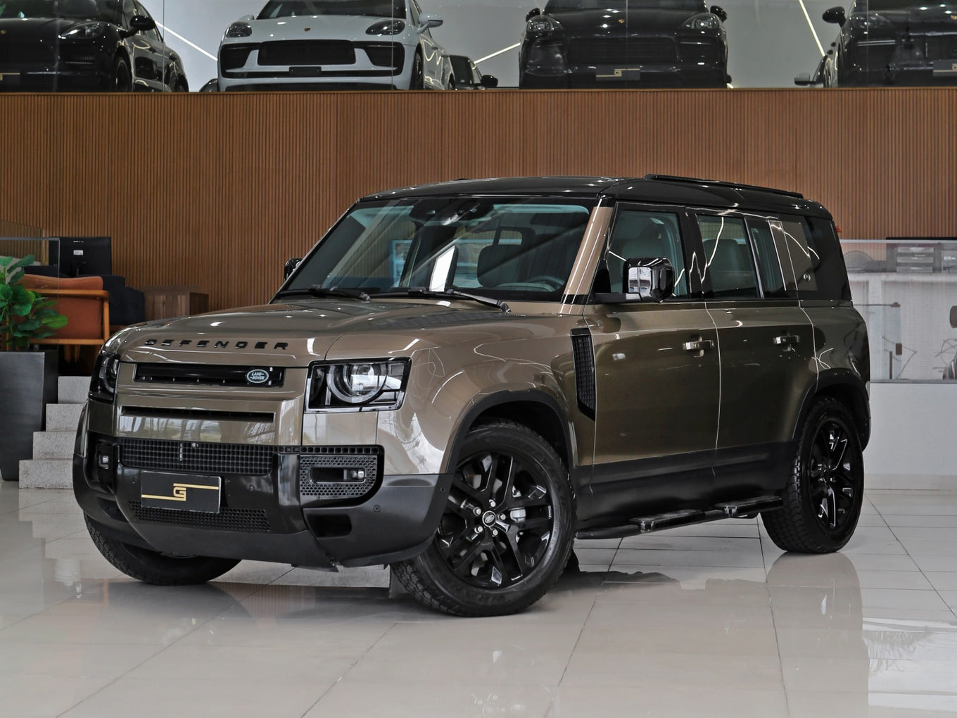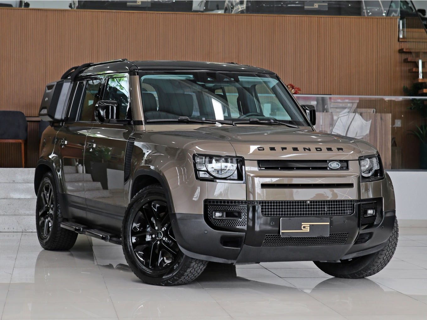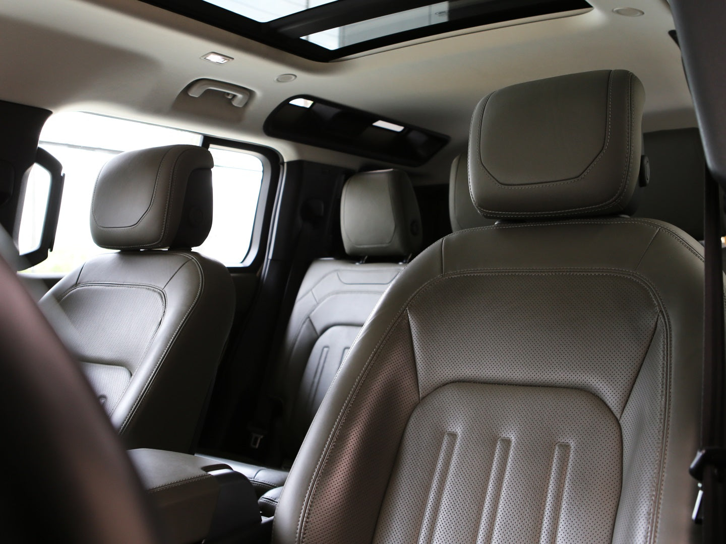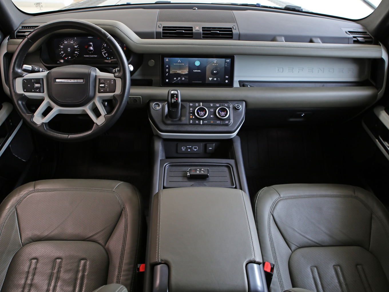 Veículo na cor Gondwana Stone com rodas de liga leve em black piano, caixa de armazenamento lateral, teto solar panorâmico, bancos em couro, painel TFT e sistema de som Meridian com 7 lugares
