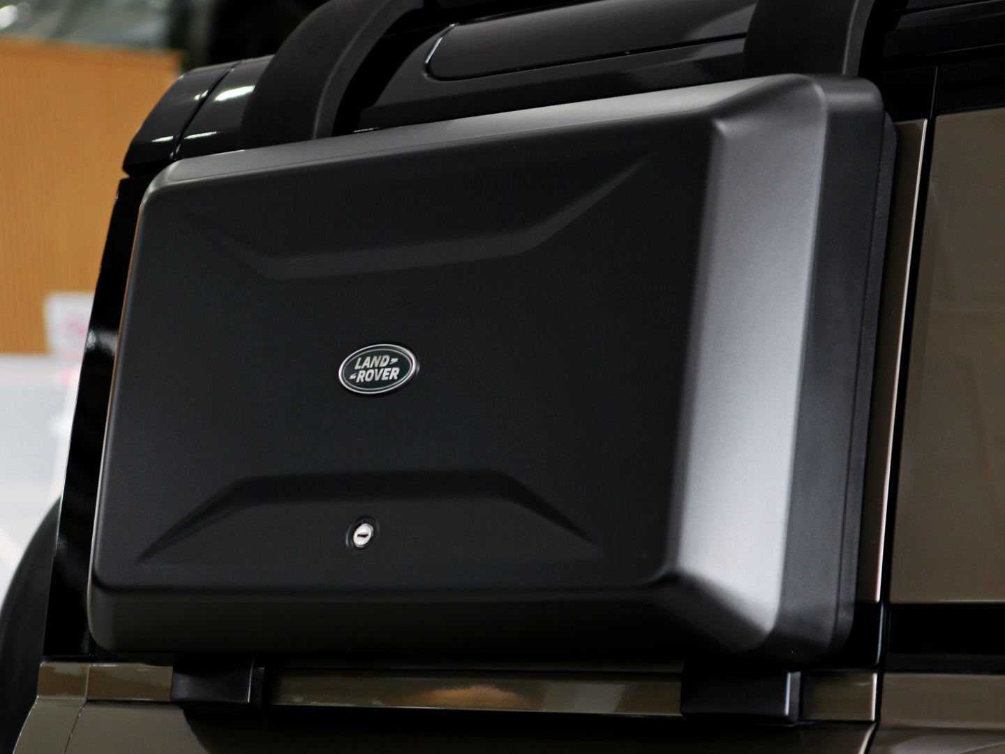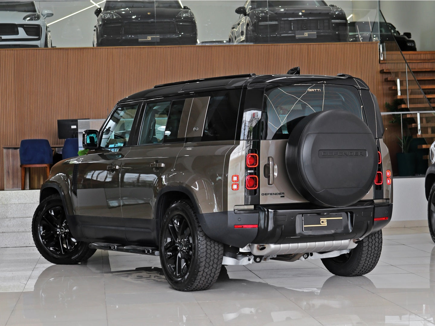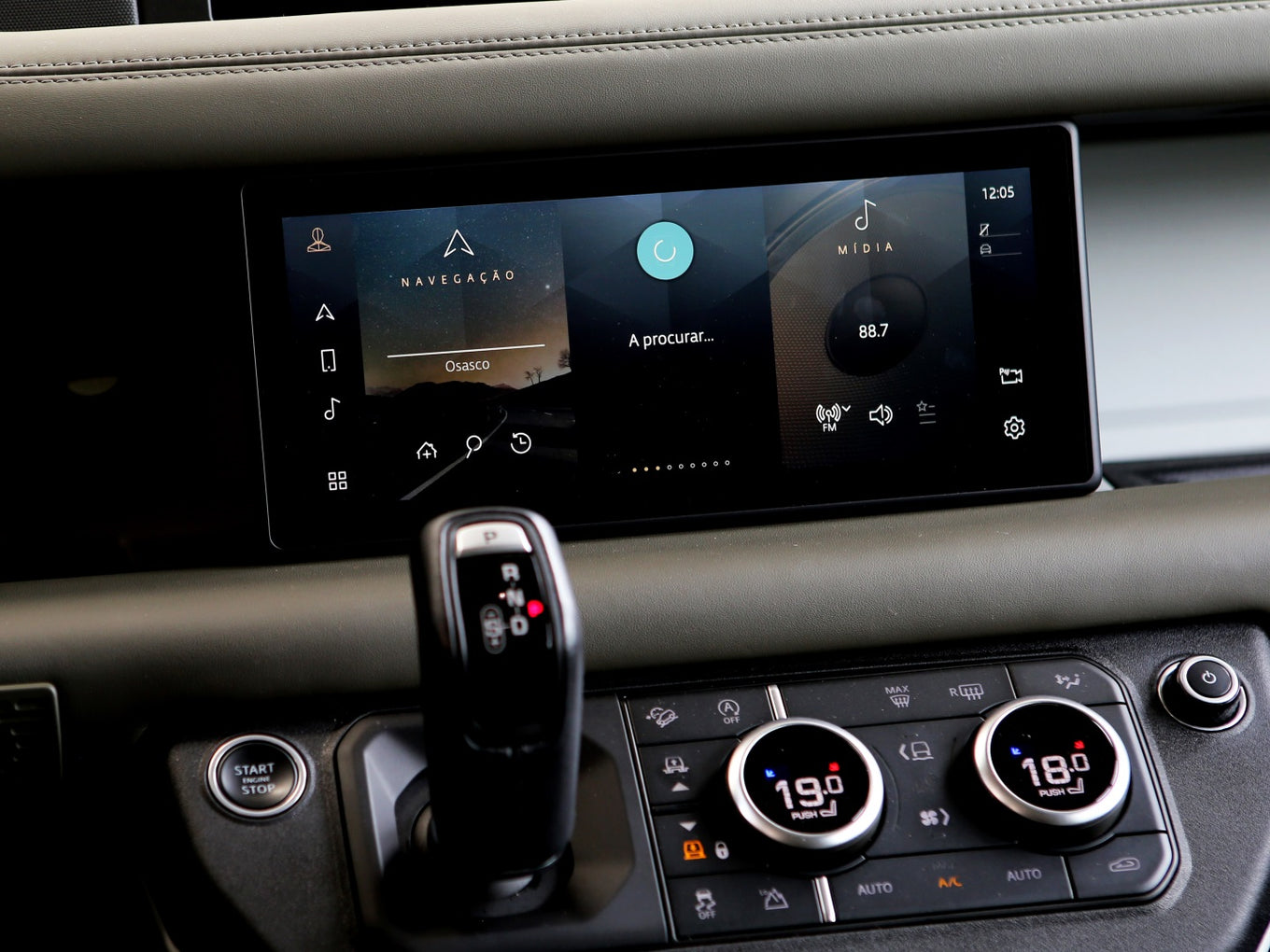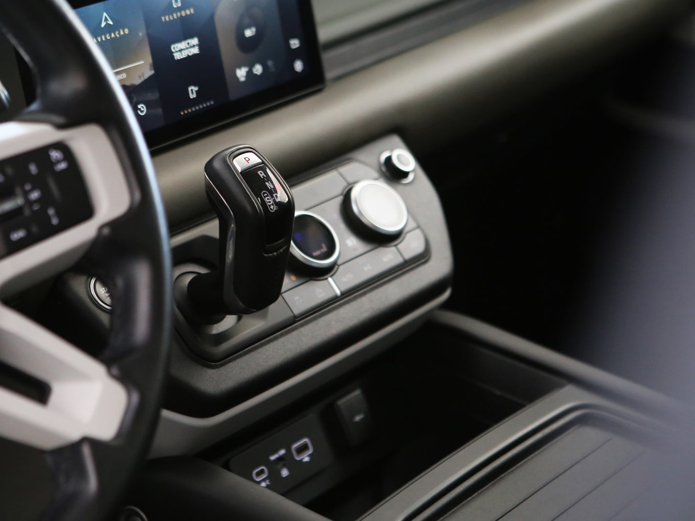 Veículo na cor Gondwana Stone com rodas de liga leve em black piano, caixa de armazenamento lateral, teto solar panorâmico, bancos em couro, painel TFT e sistema de som Meridian com 7 lugares