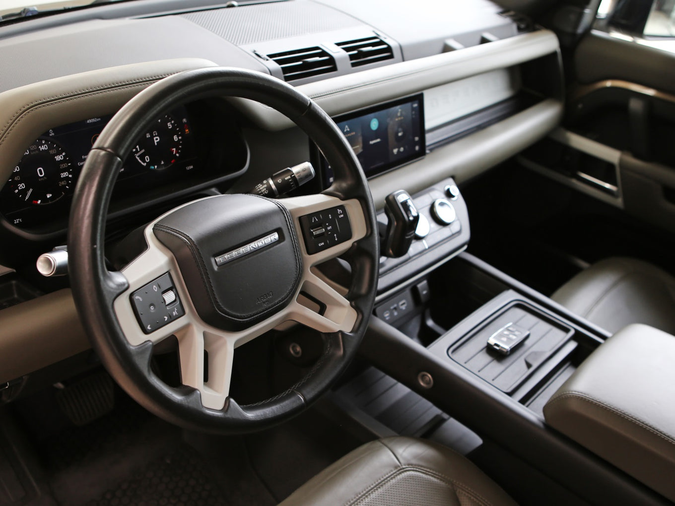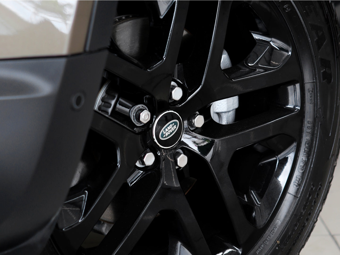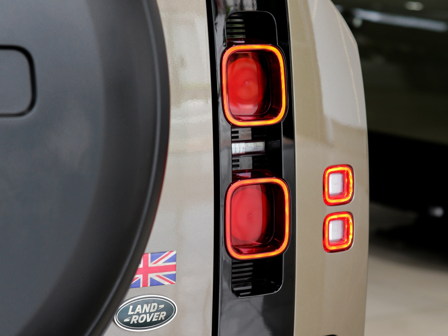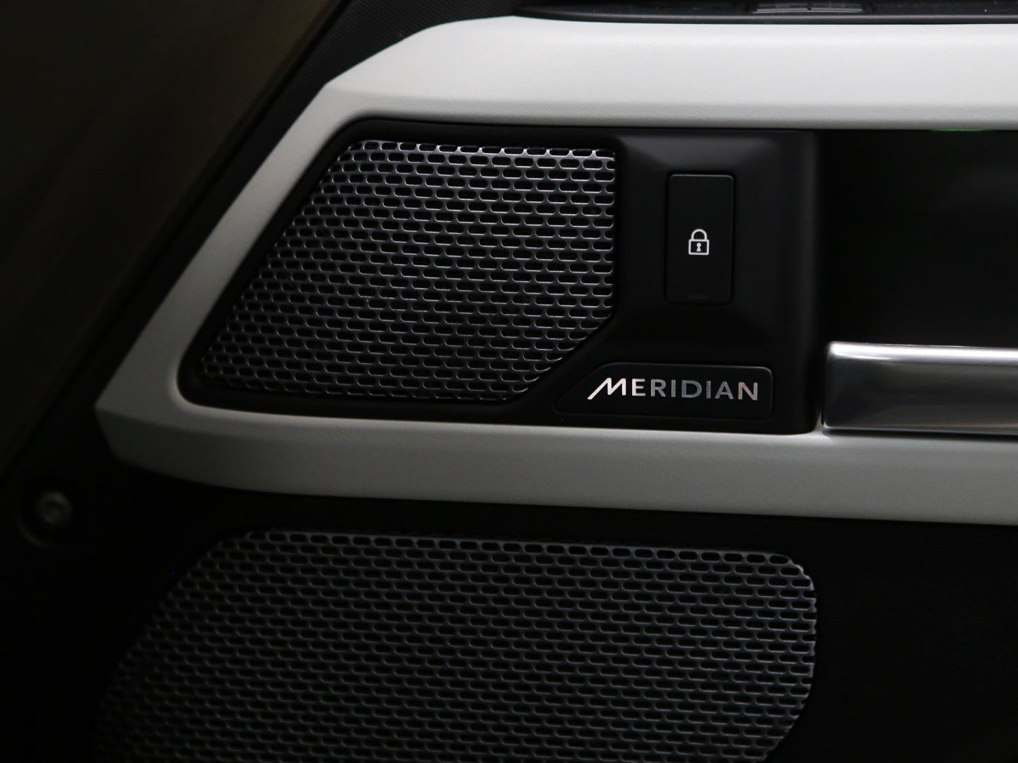 Veículo na cor Gondwana Stone com rodas de liga leve em black piano, caixa de armazenamento lateral, teto solar panorâmico, bancos em couro, painel TFT e sistema de som Meridian com 7 lugares
