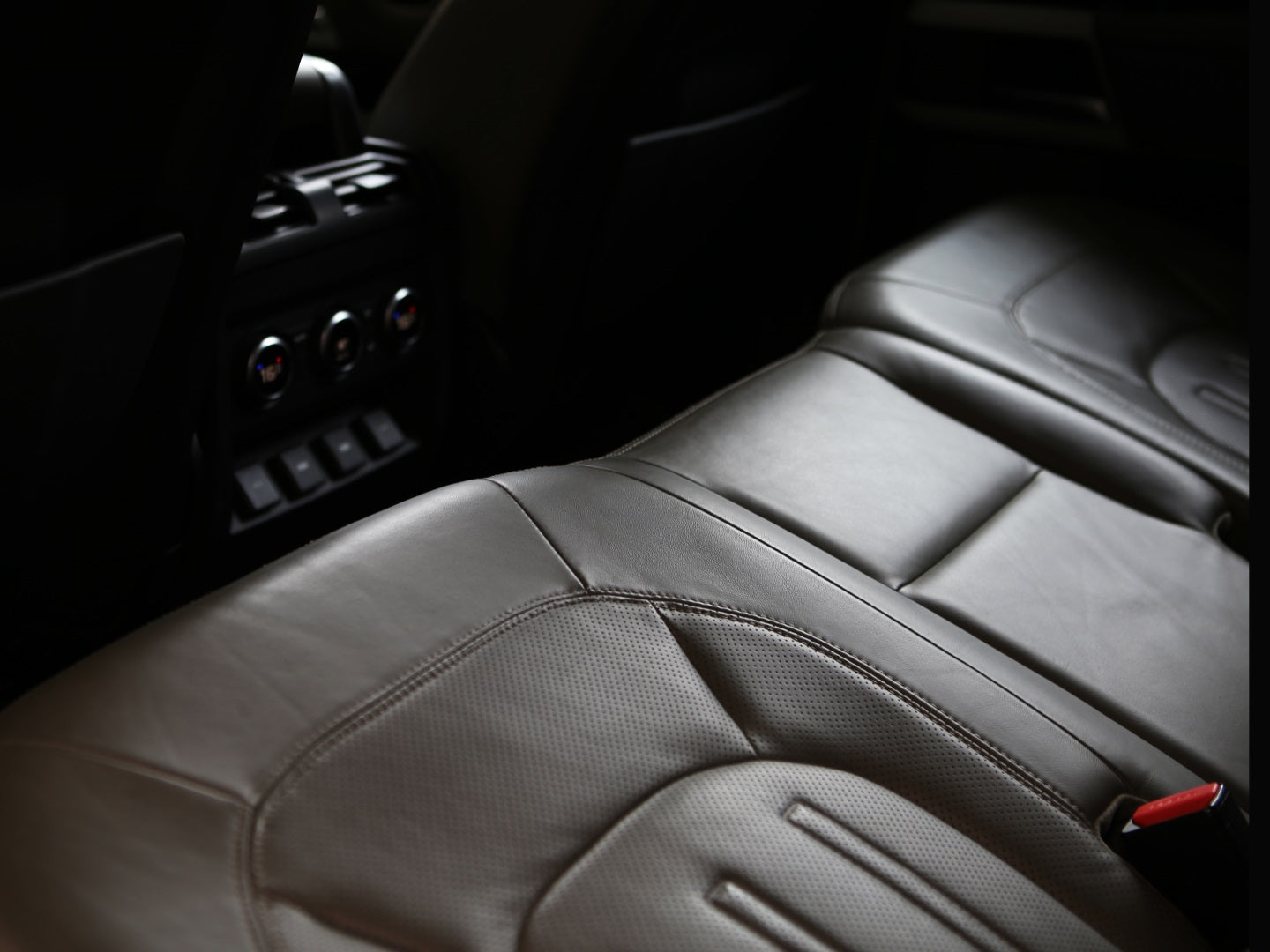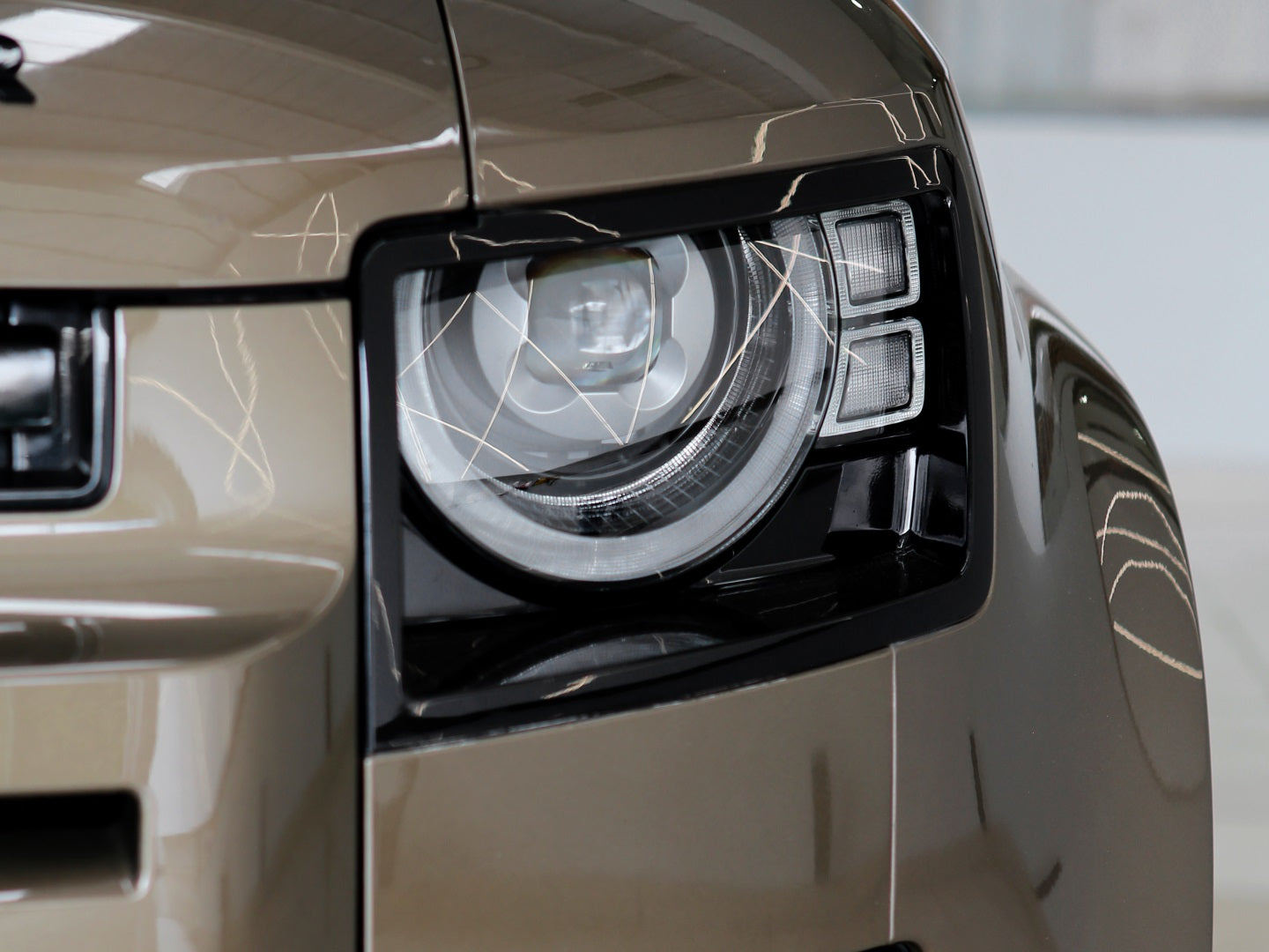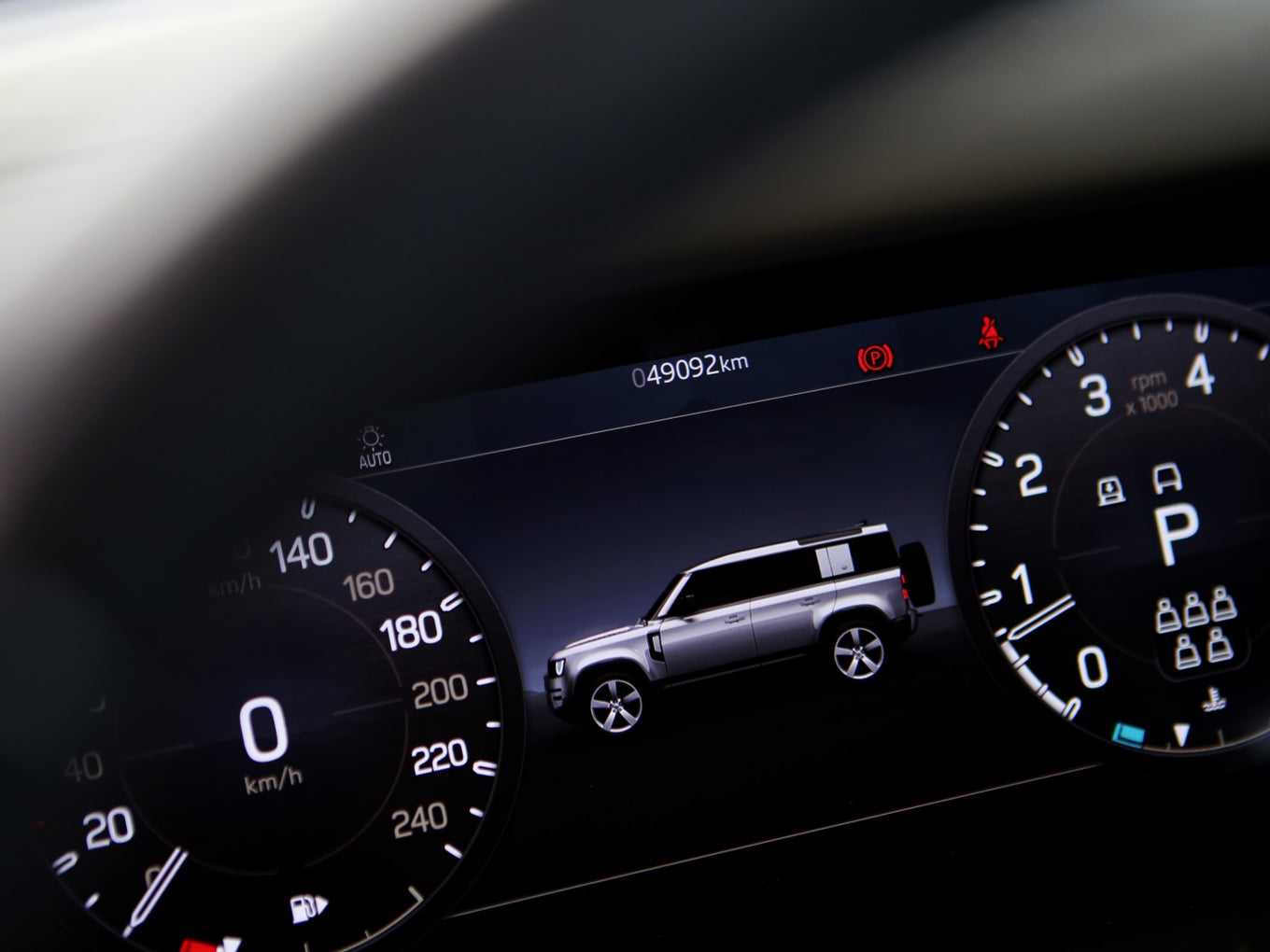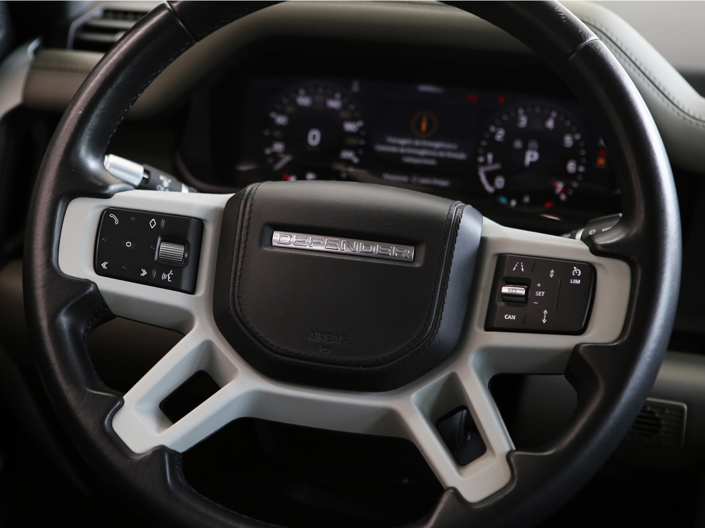 Veículo na cor Gondwana Stone com rodas de liga leve em black piano, caixa de armazenamento lateral, teto solar panorâmico, bancos em couro, painel TFT e sistema de som Meridian com 7 lugares