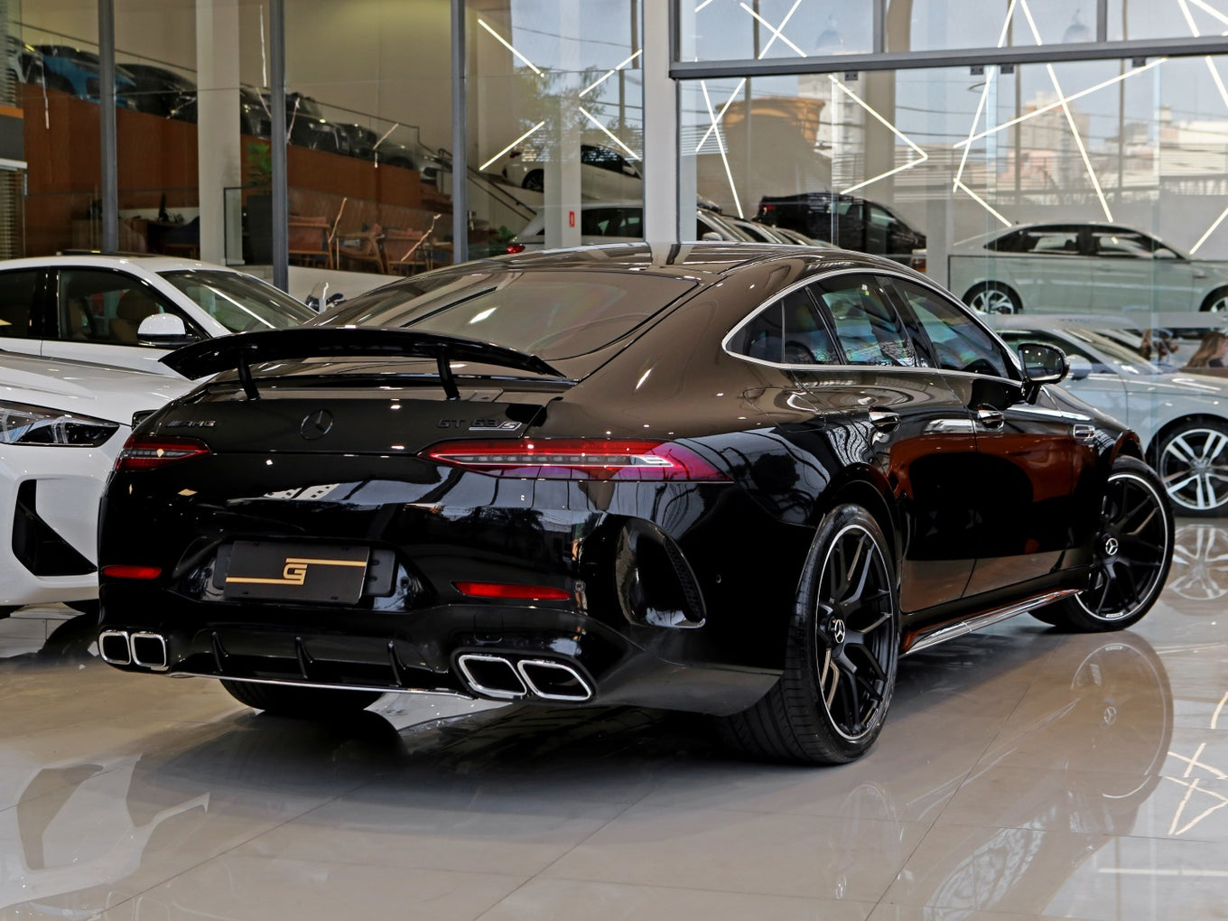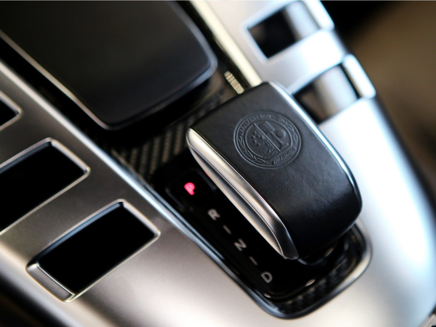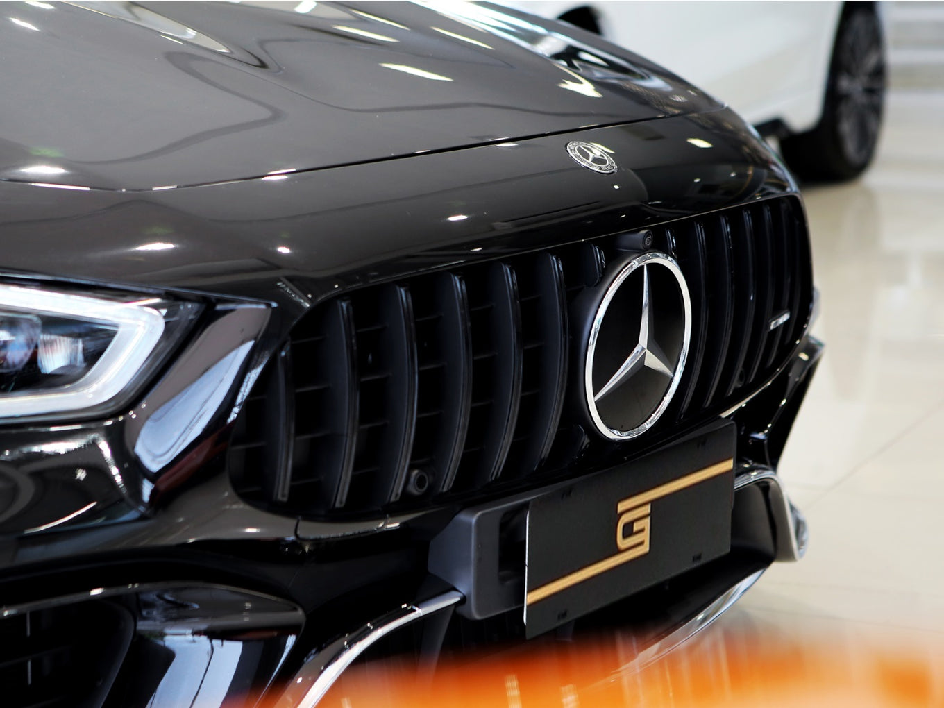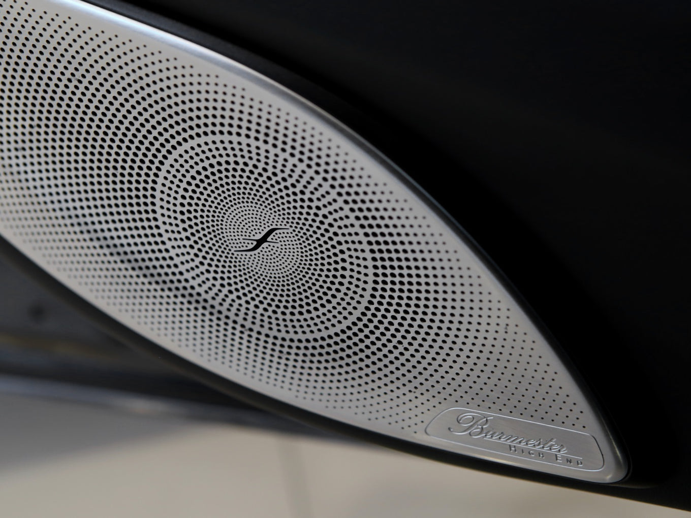 Veículo com blindagem BSS, vidros PG, rodas em preto acetinado, teto solar, interior em couro bicolor preto e marrom, acabamentos em fibra de carbono, painel TFT e sistema de som Burmester.