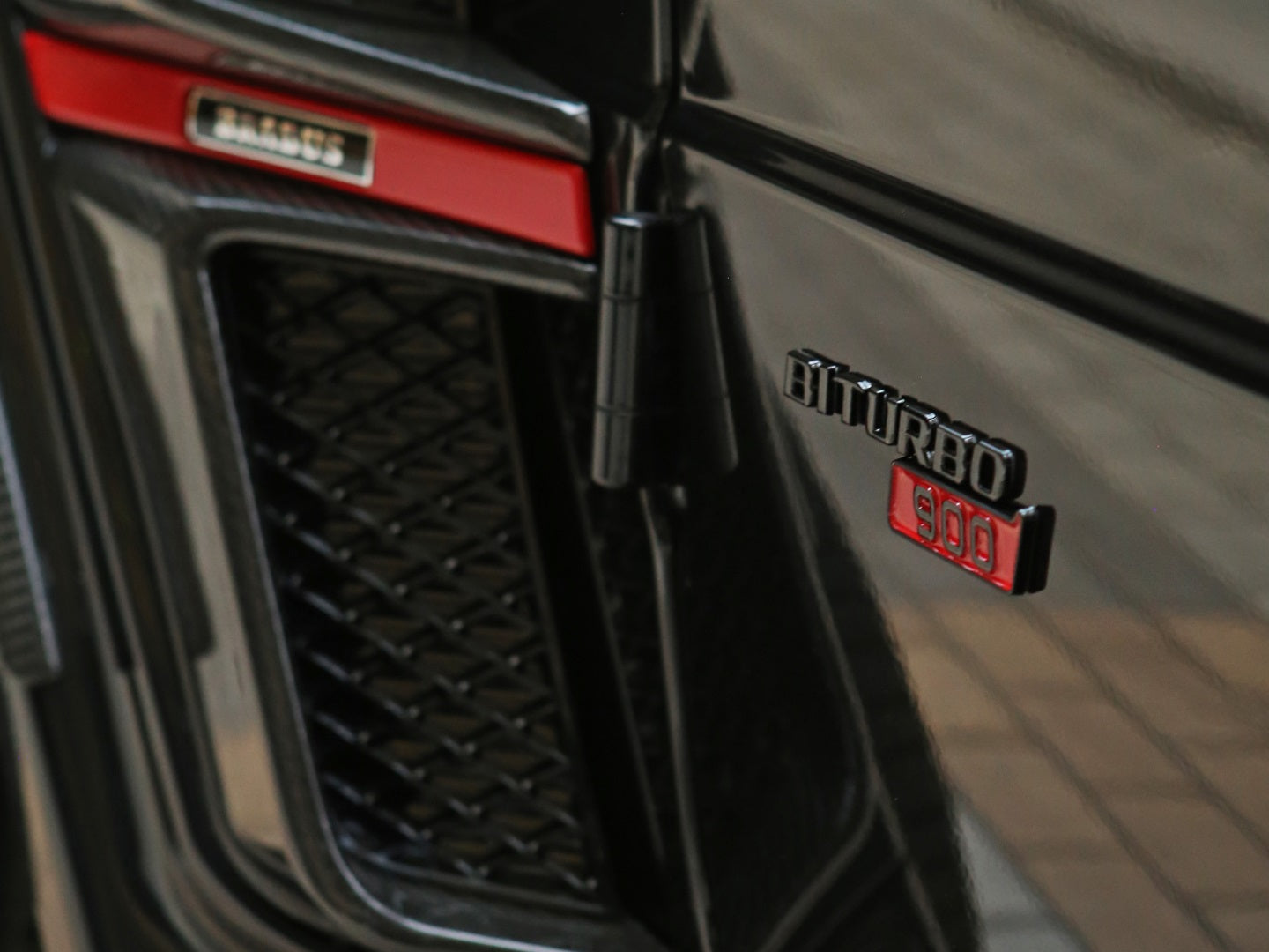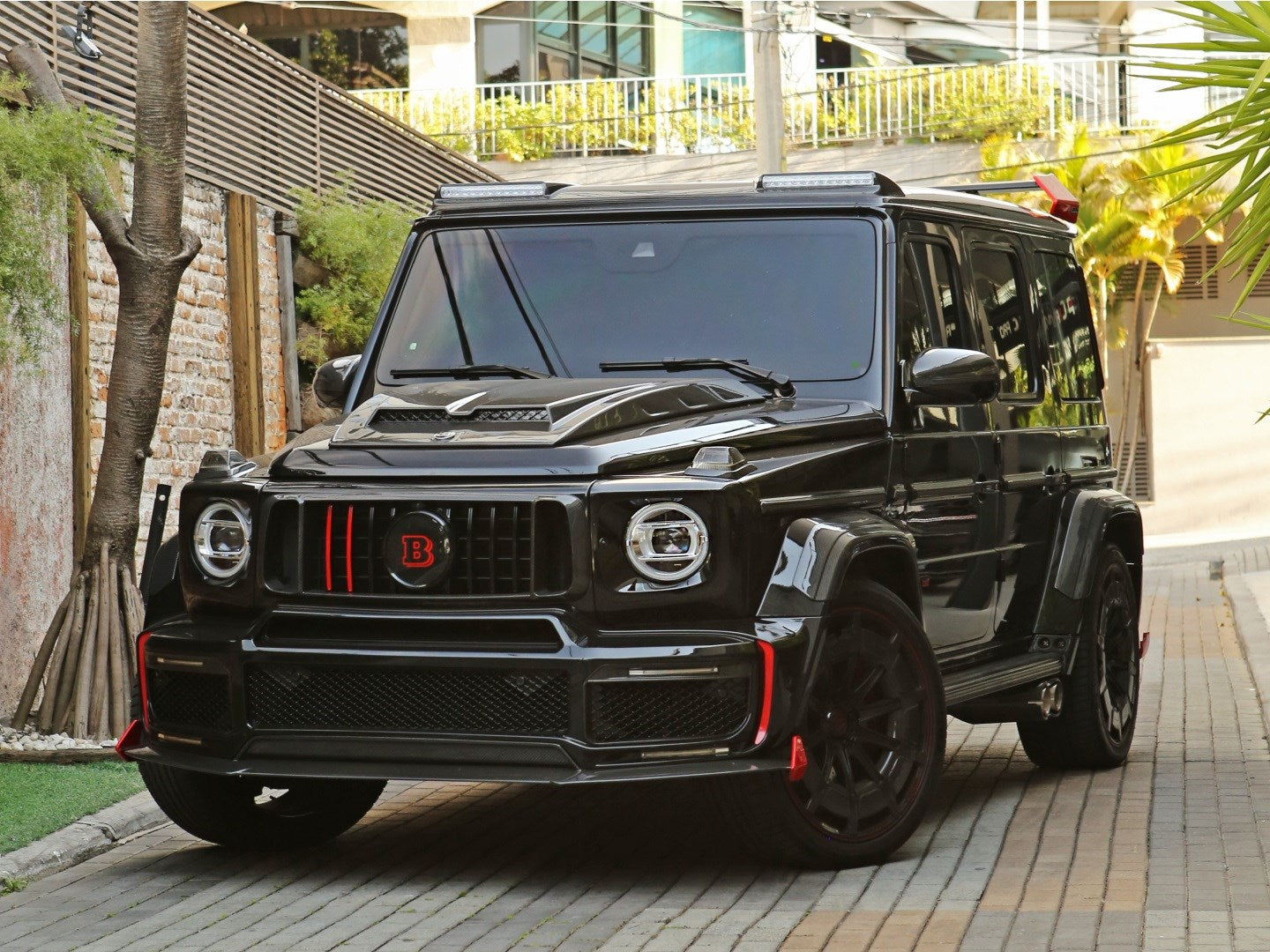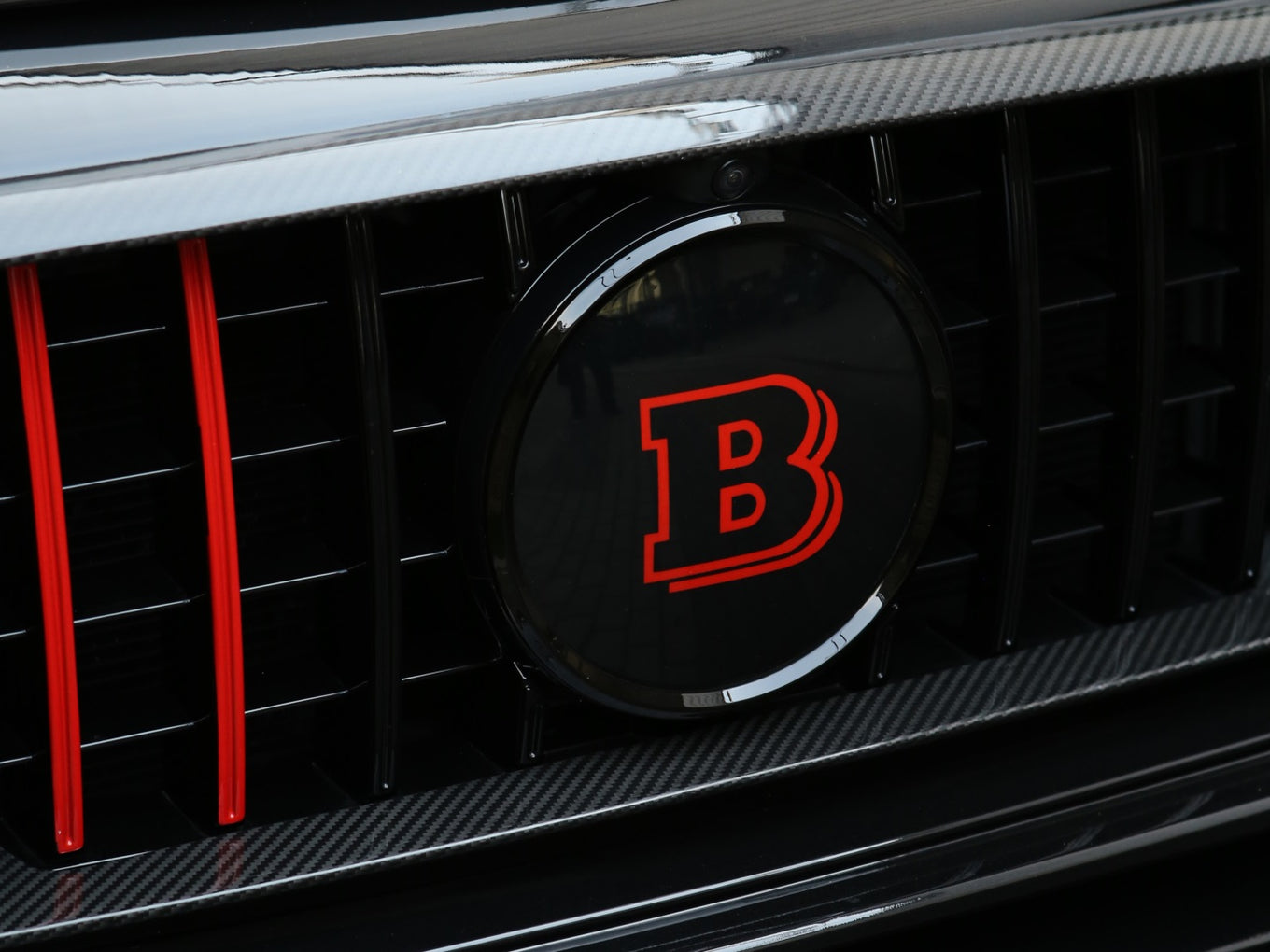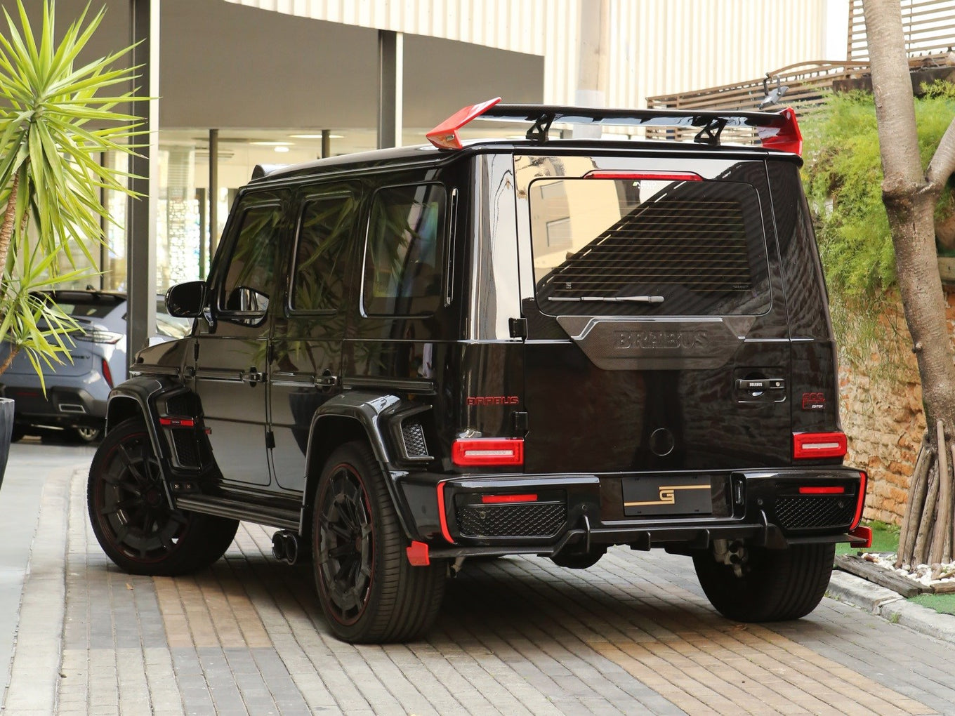 Veículo blindado Carbon, vidros AGP com Kit Brabus Rocket Edition 900, rodas exclusivas, acabamentos em fibra de carbono, teto solar, bancos em couro bicolor Mocha e preto, painel TFT e sistema de som Burmester.