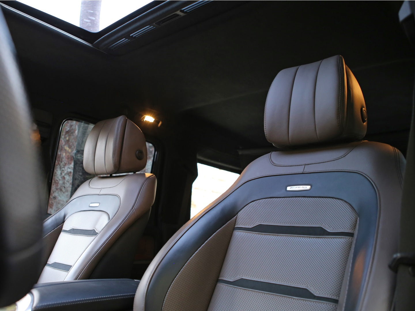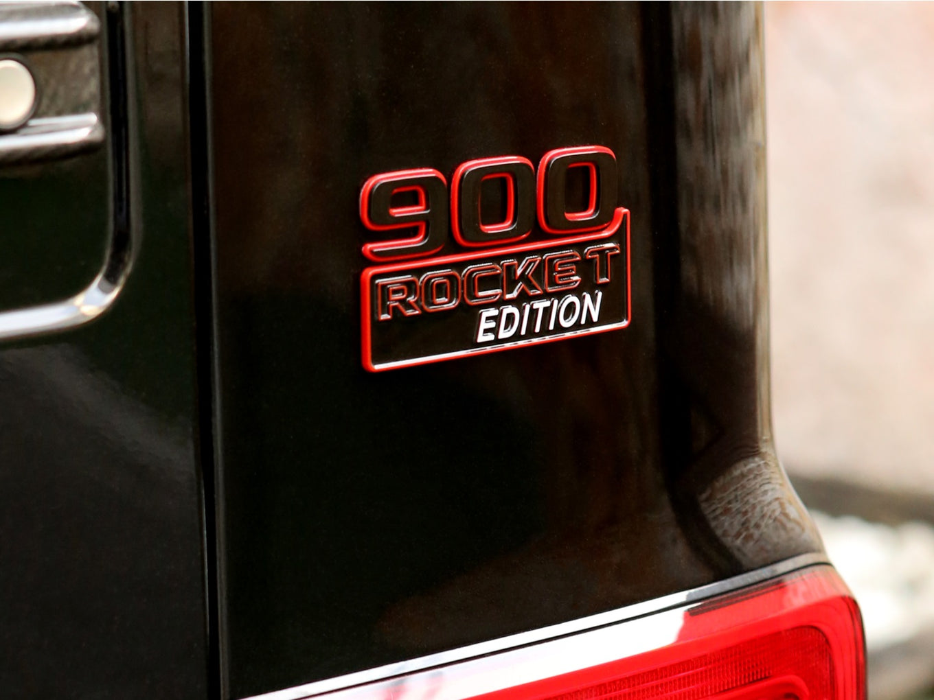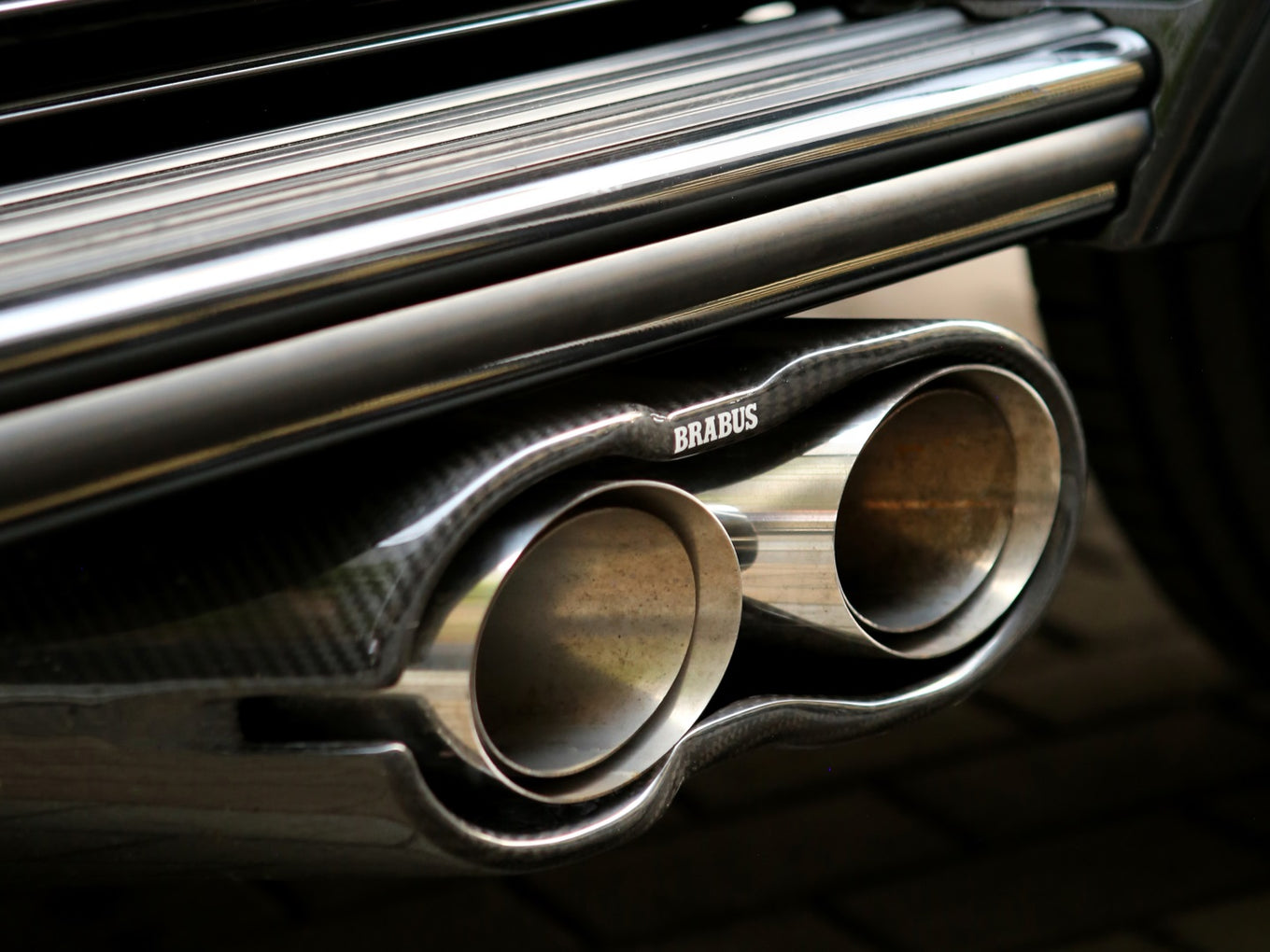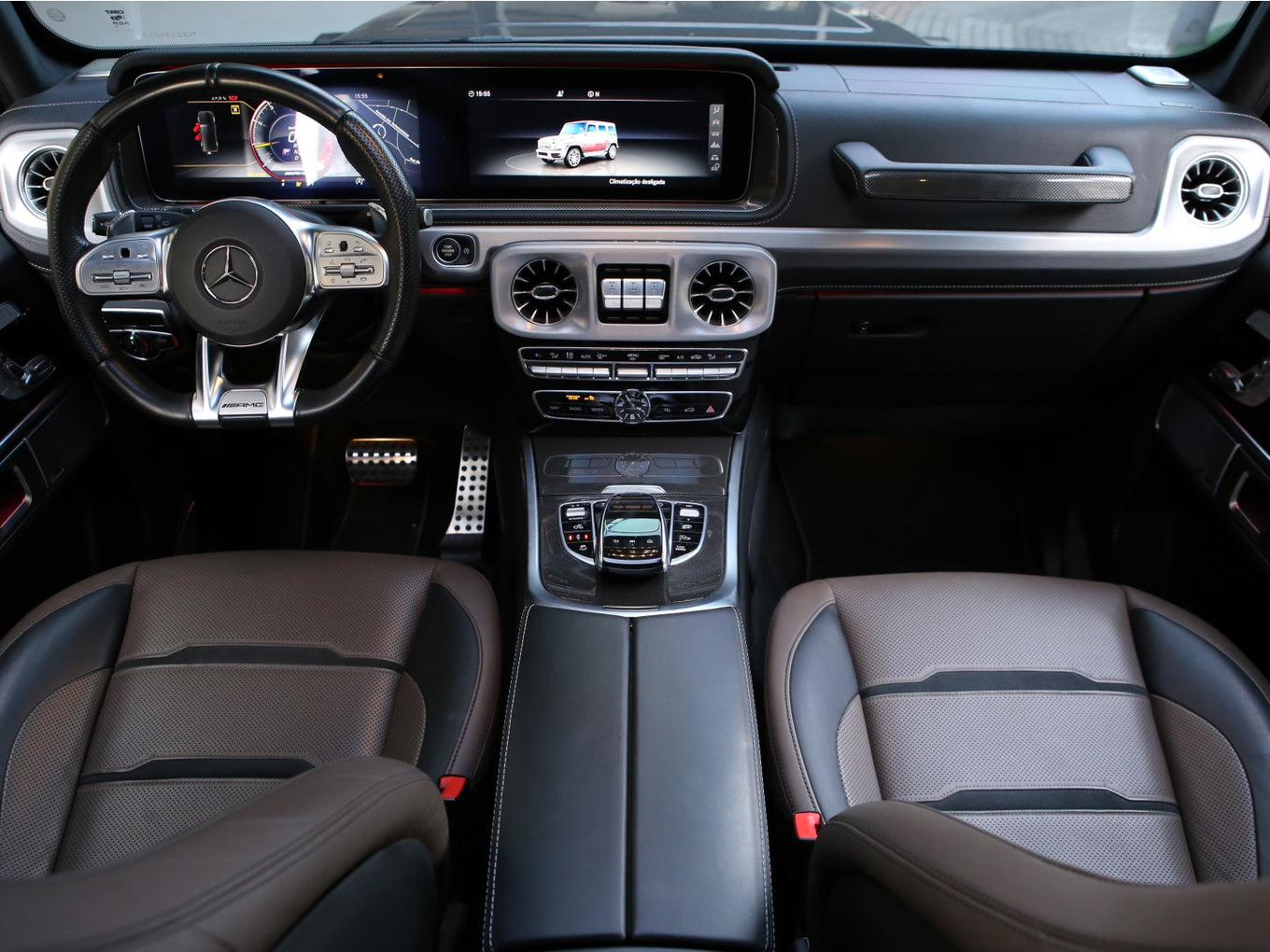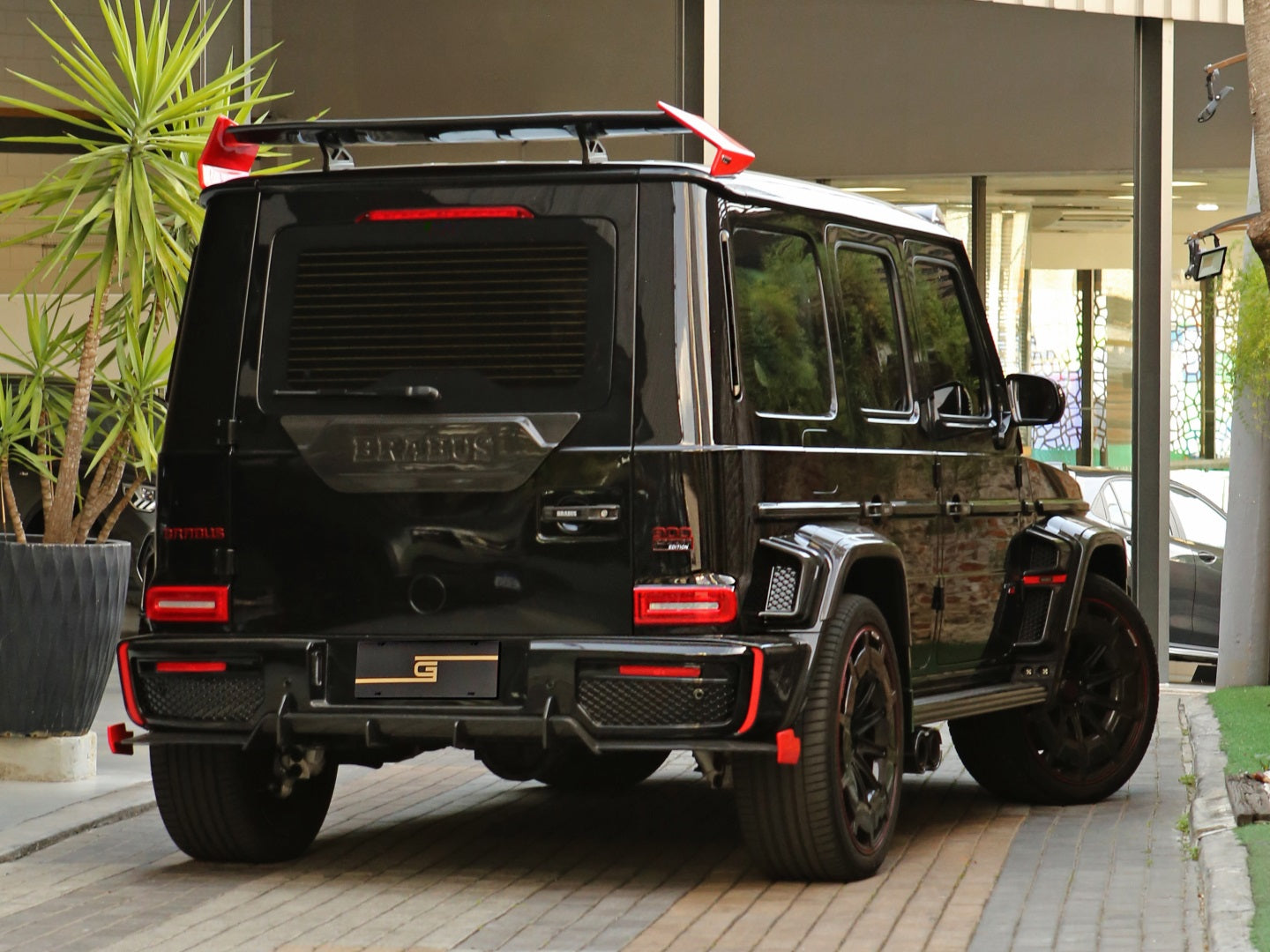 Veículo blindado Carbon, vidros AGP com Kit Brabus Rocket Edition 900, rodas exclusivas, acabamentos em fibra de carbono, teto solar, bancos em couro bicolor Mocha e preto, painel TFT e sistema de som Burmester.