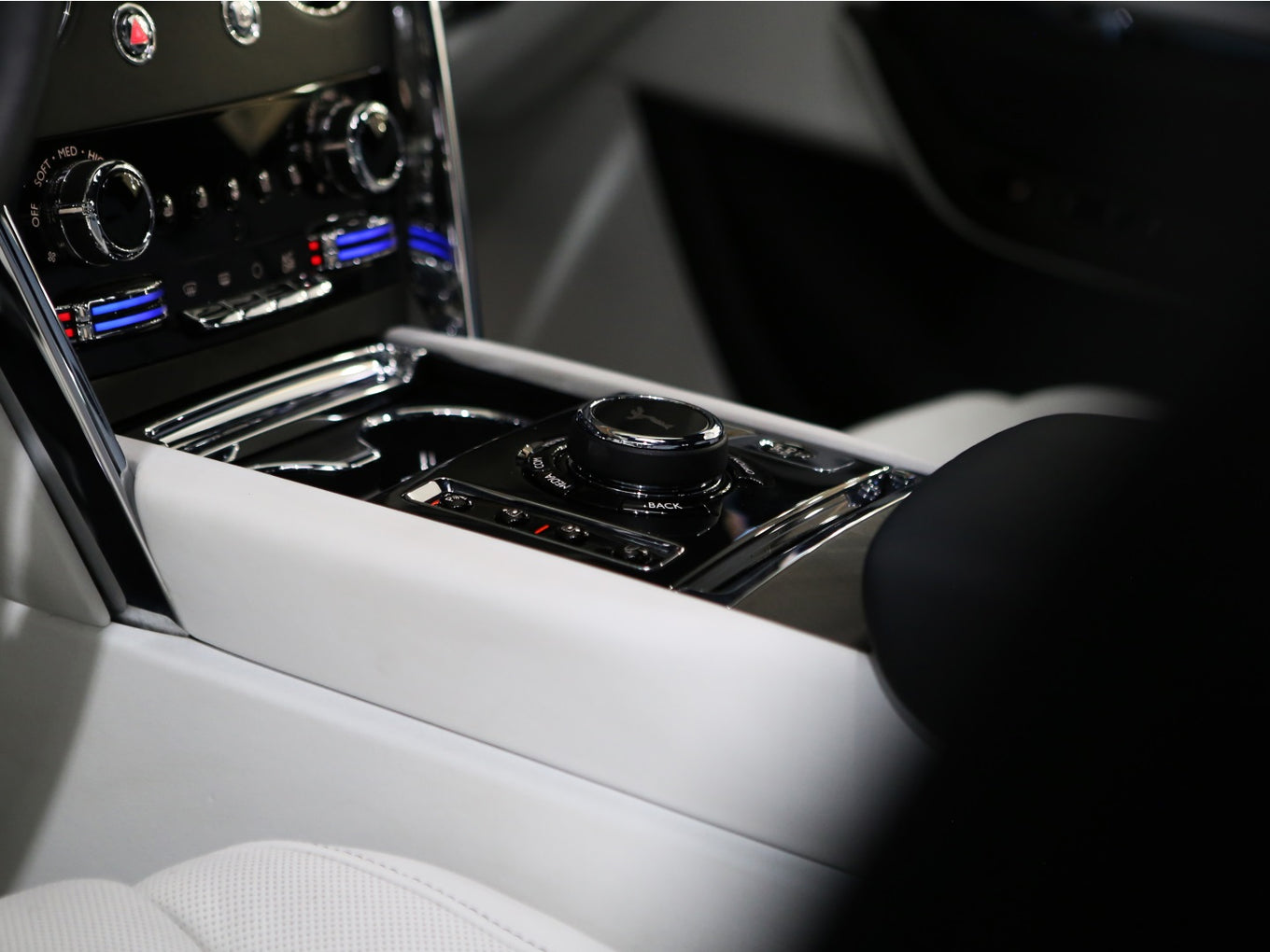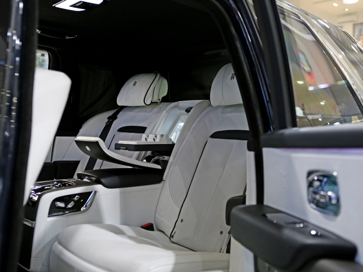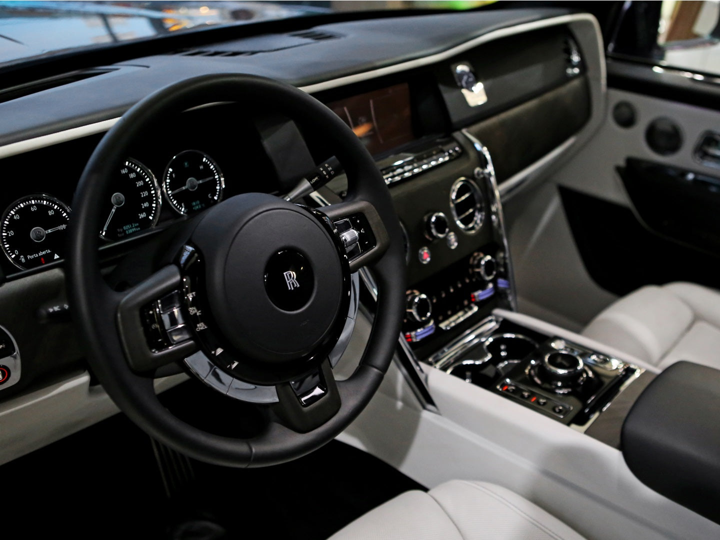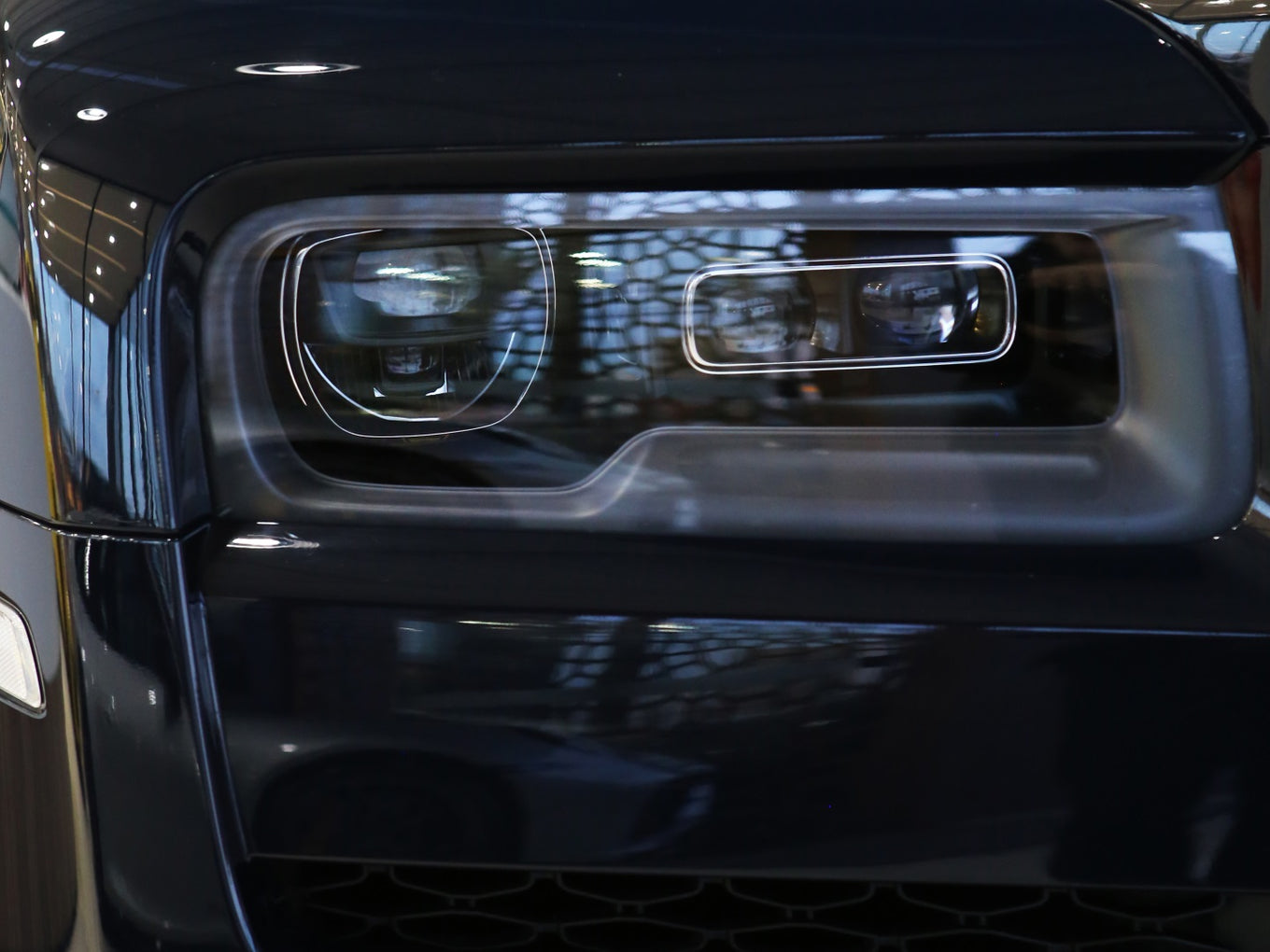 Veículo com blindagem Cart, vidros AGP IB33, rodas de liga leve, suspensão com altura ajustável, interior em couro bicolor gelo e preto, acabamentos em black piano e sistema de som Bespoke Audio.